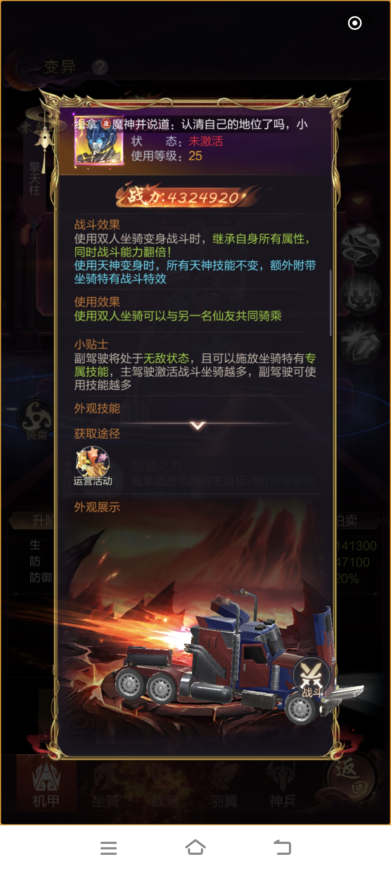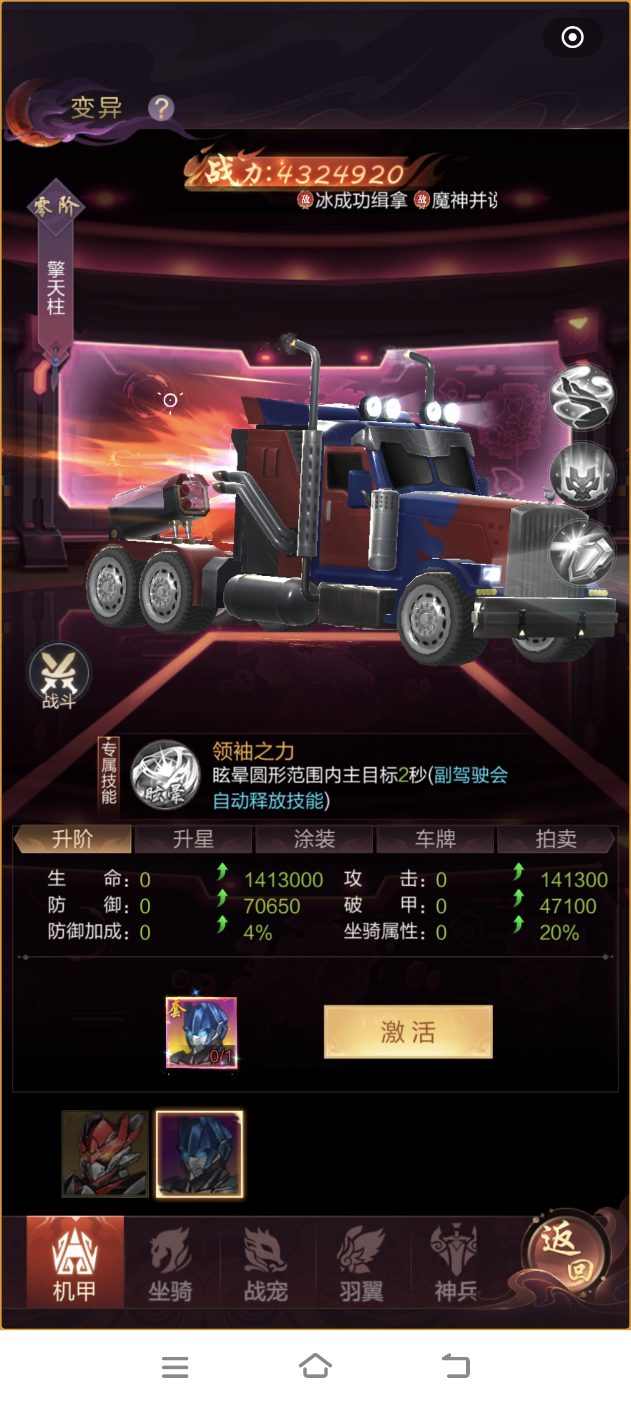 的赤红台风双人机甲坐骑酷炫非凡。平时它是一辆炫酷红色超跑,车门如羽翼般展开,可带玩家兜风赏景。战斗时则瞬间变身为赤红机甲,驾驶者手持光刃,战力拉满,同时还能让副驾进入无敌状态释放专属技能,一人驾驶两人作战,在PK中锐不可当。