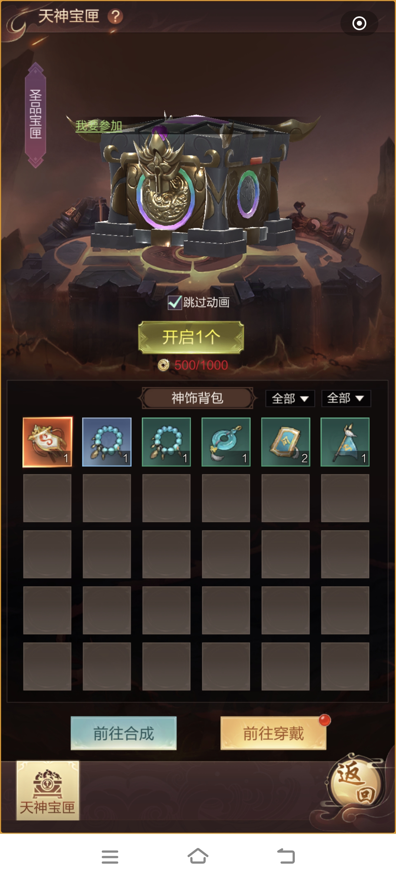 宝盒以琉璃为壳,流转着鎏金神辉,盒面浮雕九天神纹,中央嵌着枚莹白神玉,轻触便迸发细碎霞光。需用天神秘钥开启,开盖时神音乍起,霞光冲天。 + 盒内藏天神符石、令牌等神饰,集齐四件可激活属性加成,等级叠加还能晋升。每次开启累积积分,满额可获大奖,更有概率开出红色圣装图纸,为天神解锁高额属性增幅,是战力飙升的核心至宝