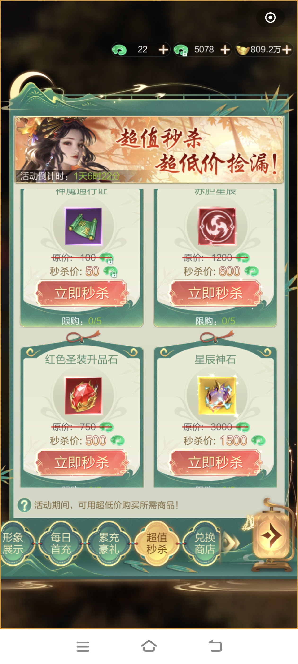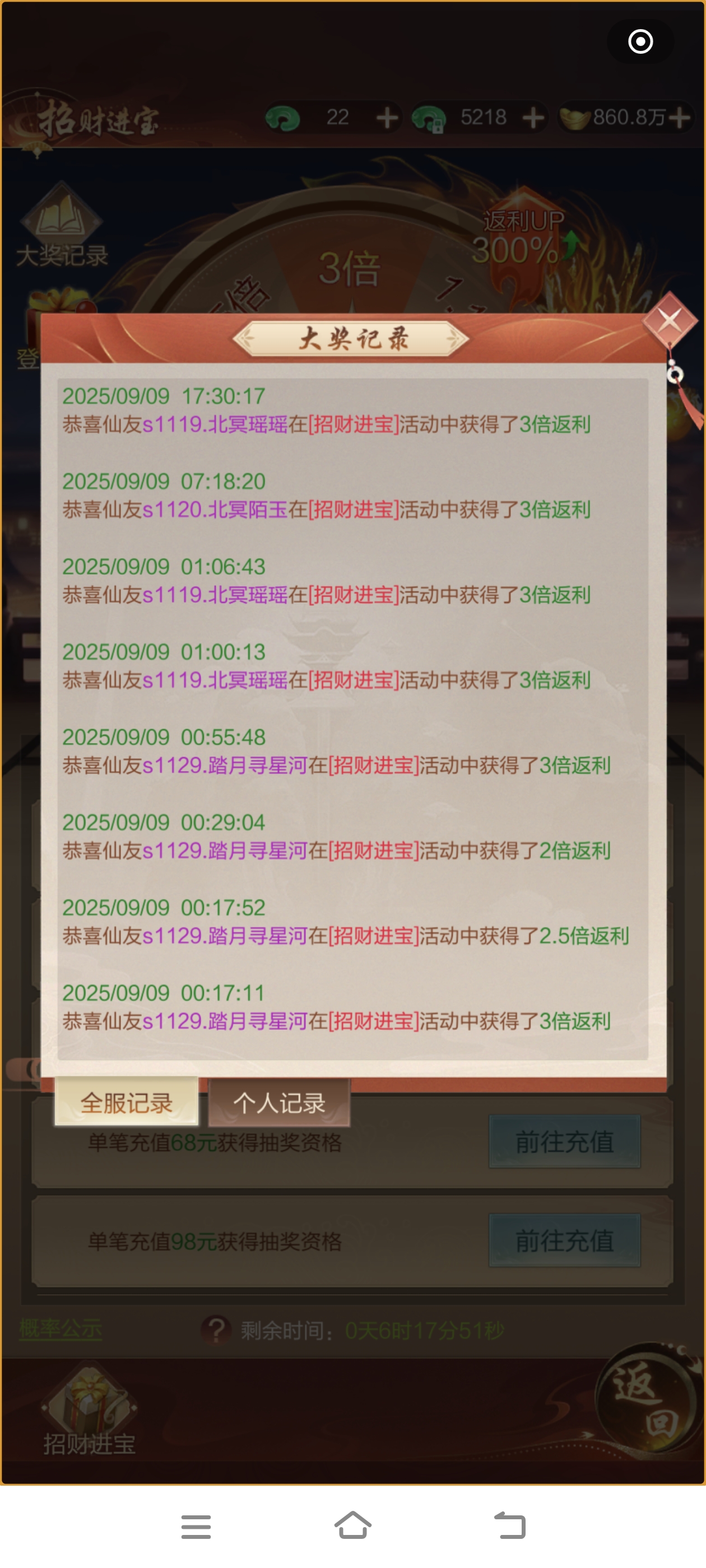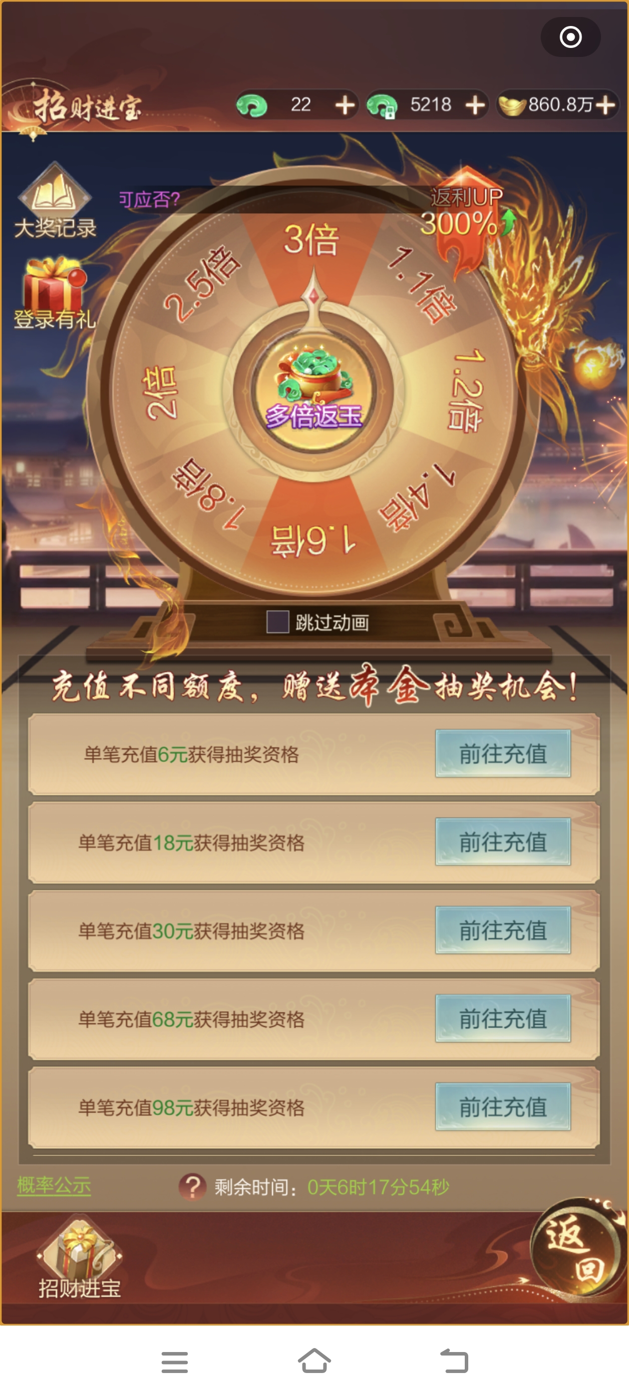 “招财进宝”即核心招财猫系统,点击界面对应图标即可进入,是快速获取绑玉的关键途径。活动每日重置,充值达到指定档位就能解锁转盘抽奖机会,投入仙玉转动即可赢取海量绑定仙玉。 + 微氪玩家推荐单笔充30元+6元,既能拿到1080玉,还能领累充36元奖励;大佬可按需充值,最高能得十万仙玉。低投入高回报,助力快速积累资源,修仙战力进阶更高效!