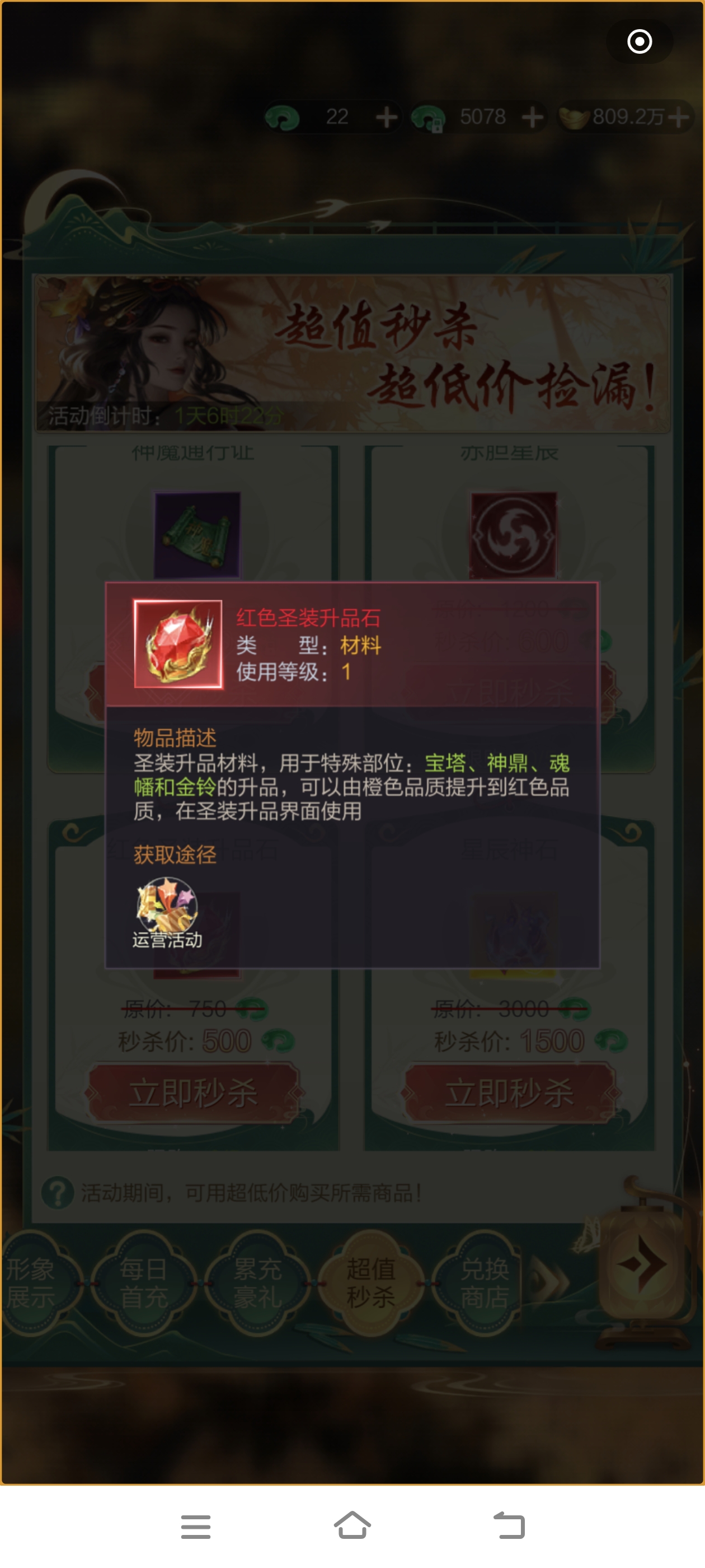 累充活动重磅开启,核心奖励幻彩石头闪耀登场,作为打造顶级装备的稀缺材料,其价值远超普通晶石。 + 累充档位逐级解锁,高阶档位可直接斩获多颗幻彩石头,石身流转虹光,乃是合成幻彩级圣装的关键道具,集齐后能激活强力套装属性。充值进度实时跳动,奖励弹窗随额度触发,到手的幻彩石头可快速嵌入装备,助玩家战力暴涨,在仙盟争霸与跨服对战中抢占先机。