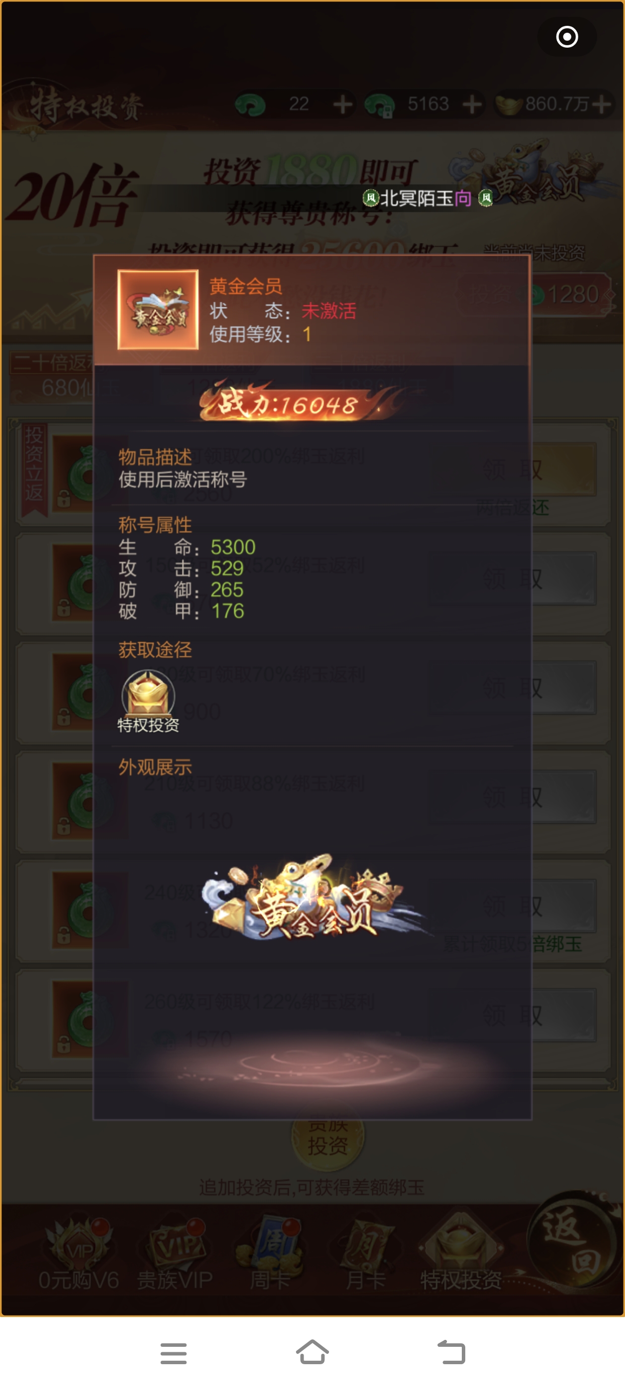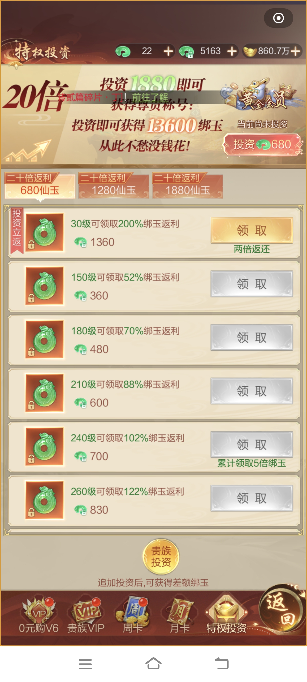 高性价比投资福利来袭,1280仙玉即可解锁13倍绑玉返利,角色等级达标就能领取奖励,满级450级累计可获11780绑玉,相当于千元价值资源。 + 除海量绑玉,还附赠极品披风与九转还魂丹,复活道具助力副本开荒无忧。投资后奖励随等级逐步发放,绑玉可用于古董鉴定、道具购买等核心玩法,长期玩必入的战力加速方案!