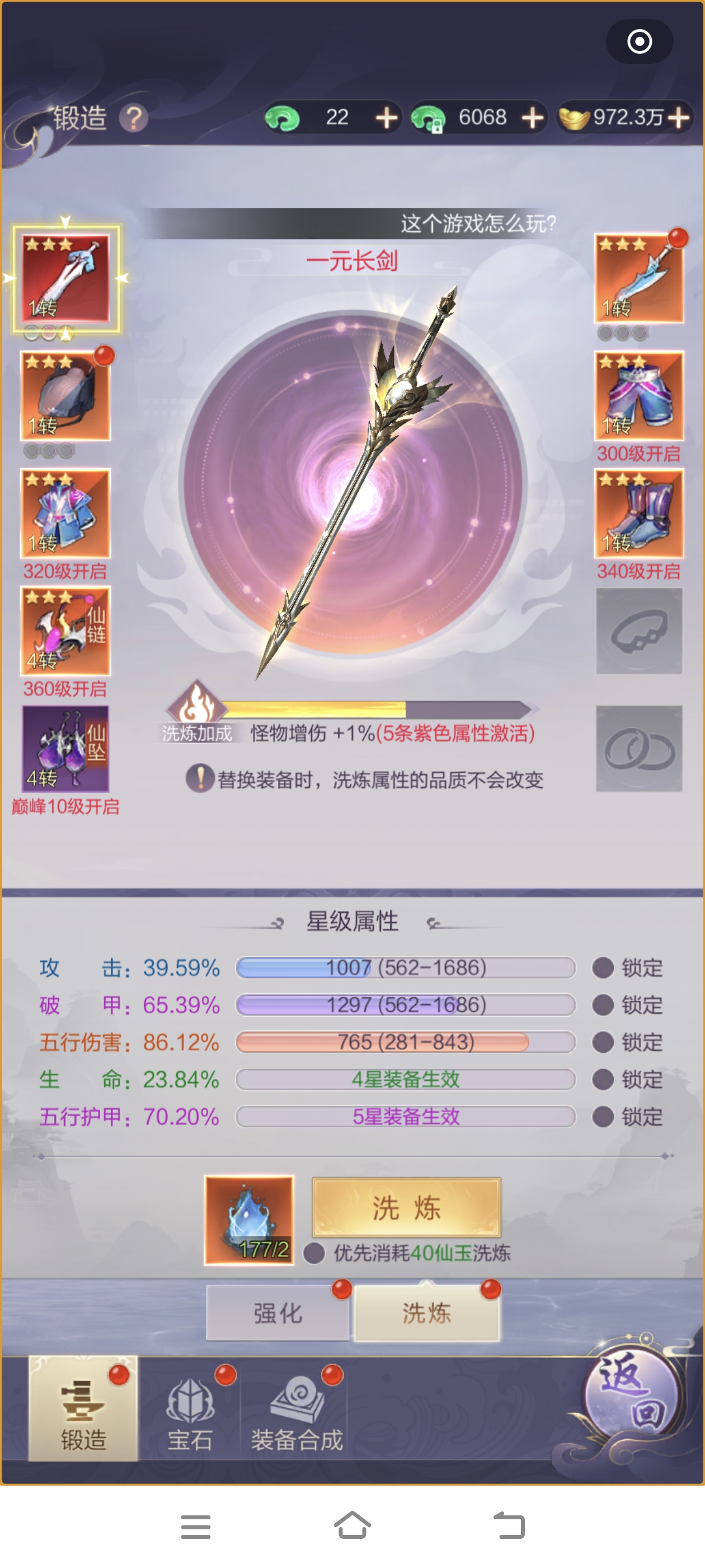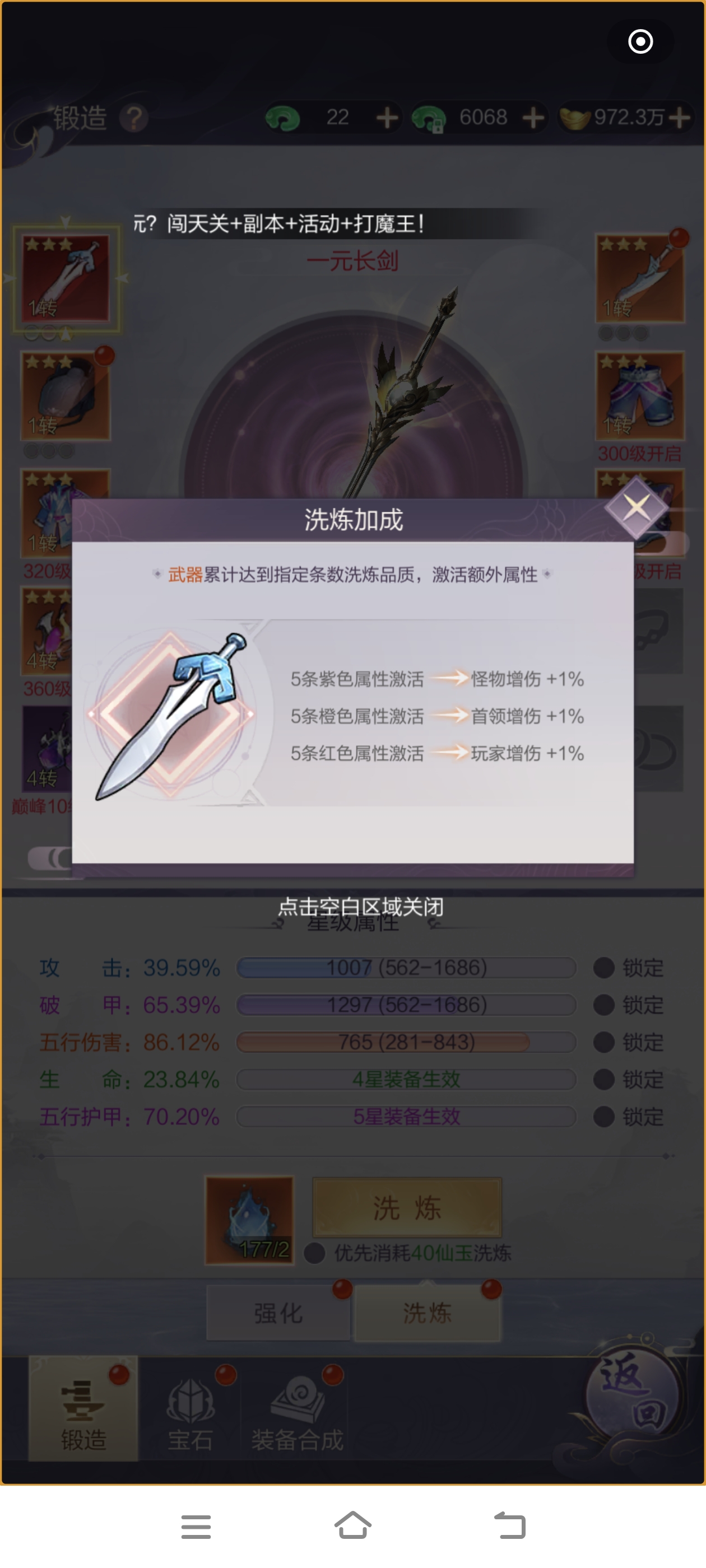 40级解锁装备洗练功能,是定制特色装备、暴涨战力的核心玩法。消耗洗练石与铜钱即可洗练,仅提升属性百分比,不更换属性类别,品质越高加成越丰厚。 + 装备星级决定生效属性条数,50级解锁第五个属性栏可重点投入。输出职业优先洗攻击、暴击、破甲,坦克侧重生命、防御,洗出传奇属性可获3倍加成。装备进阶后属性保留,攒洗练石优化词条,轻松战力超车!