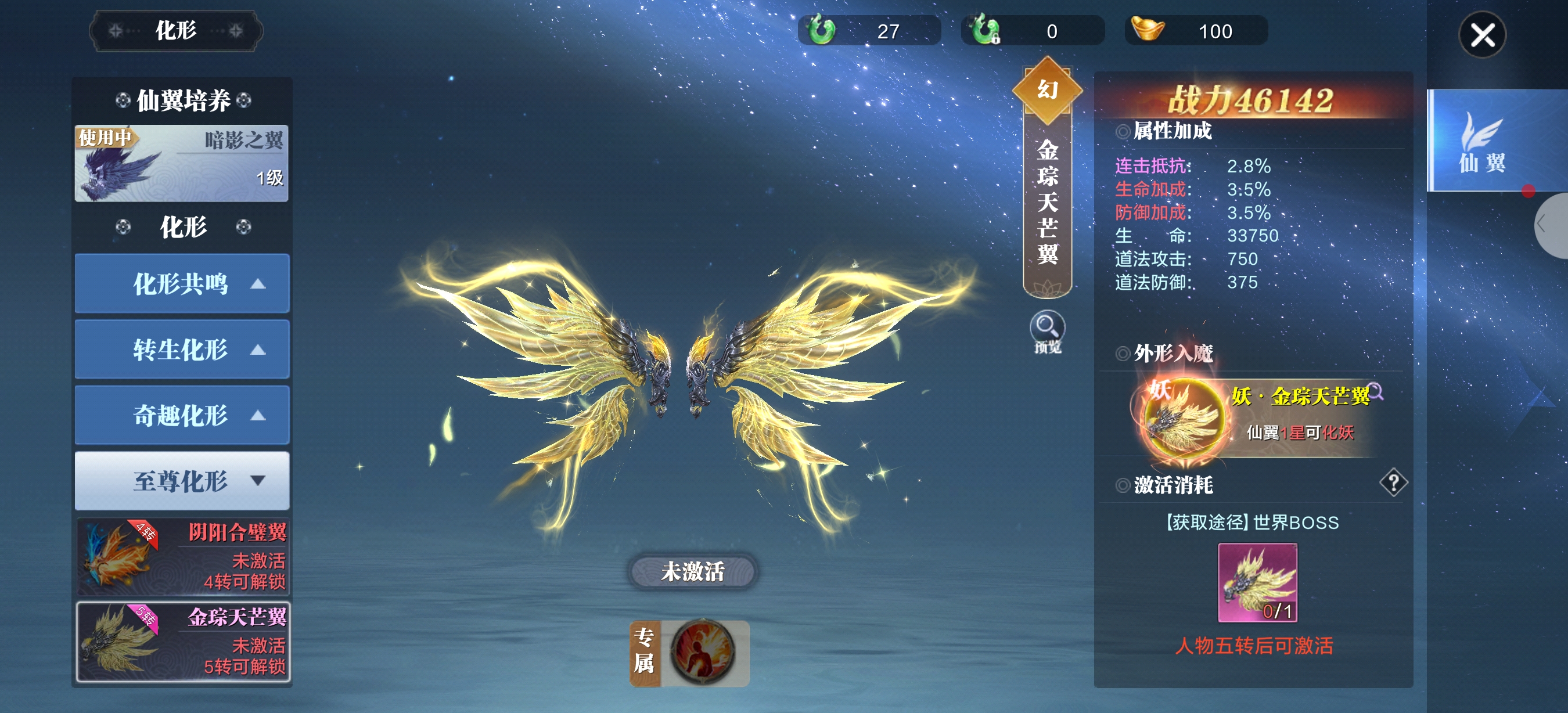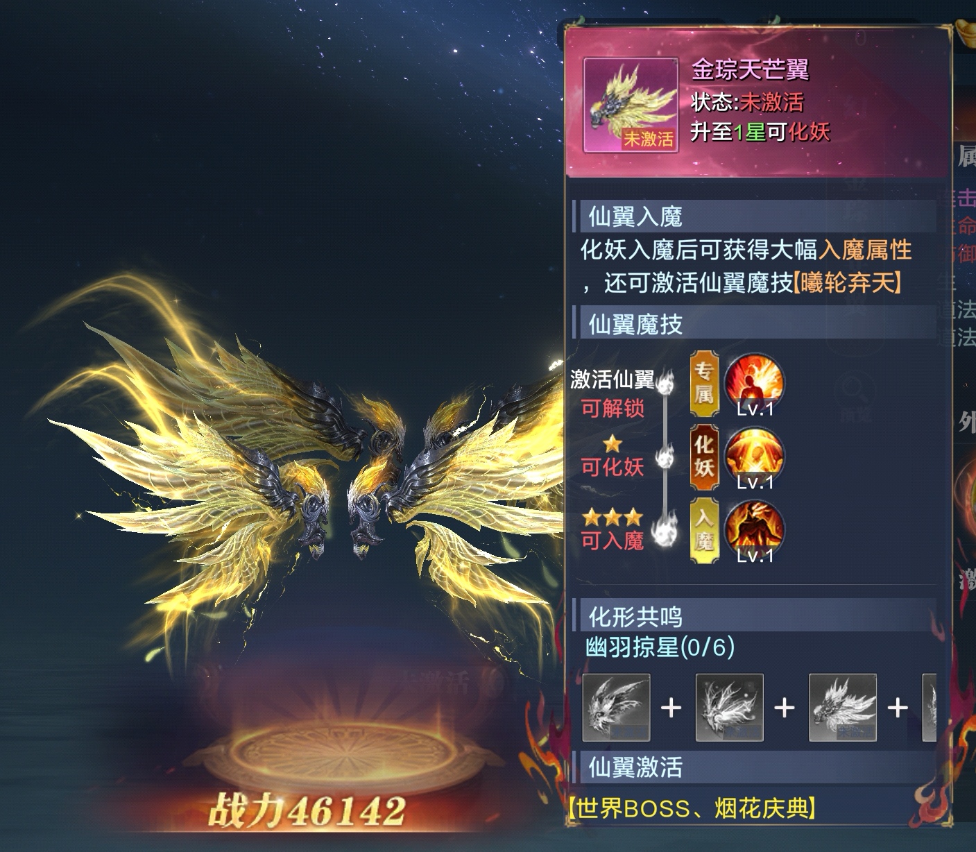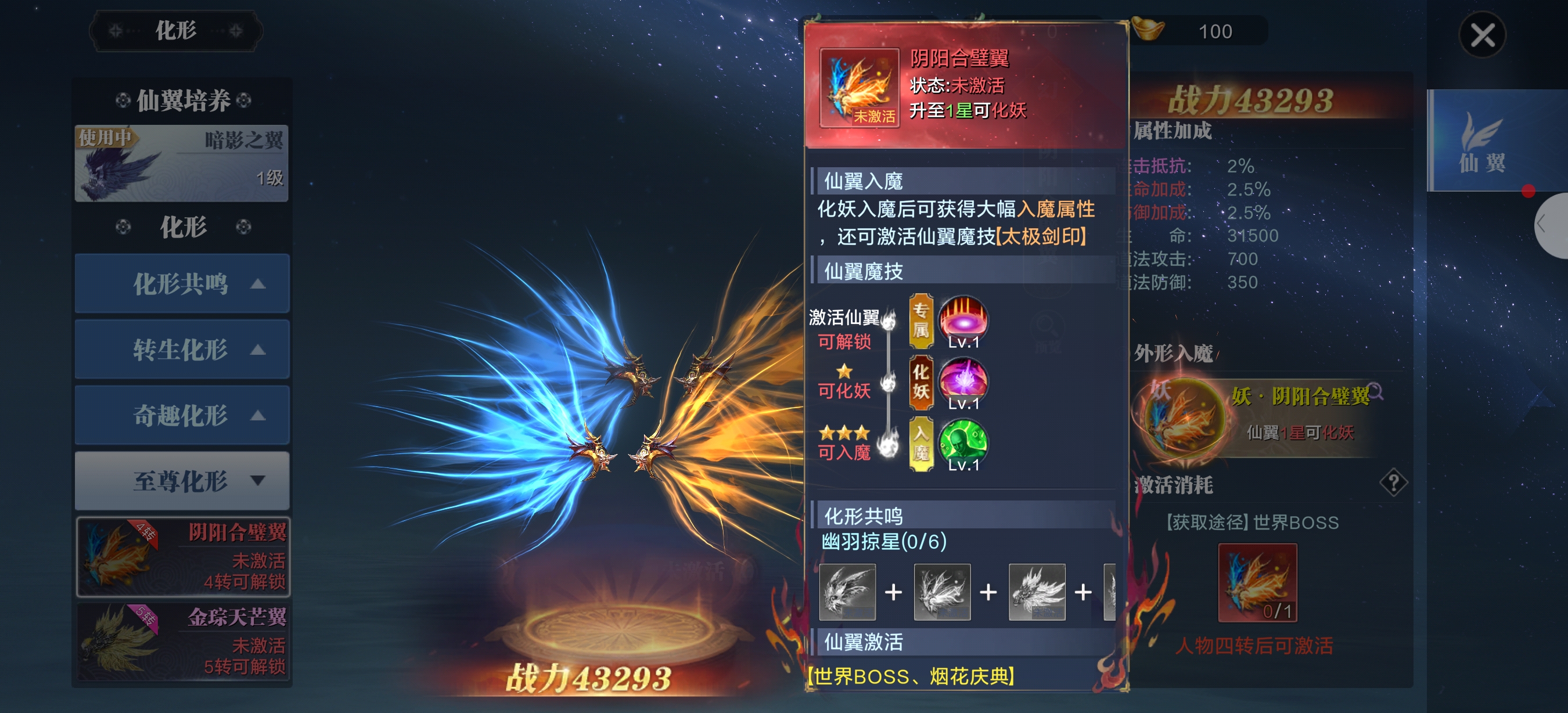 阴阳合璧翼采用蓝金撞色设计,左侧冰蓝色羽翼搭配右侧暖金色羽翼,视觉冲击力强,既凸显出仙翼的华丽质感,又通过色彩对比强化了“阴阳合璧”的主题,造型辨识度拉满,能很好彰显角色独特性。 基础属性提供31500点生命、700点法攻击、350点法防御,同时还有2.5%的生命加成、2.5%的防御加成,以及2%的连击抵抗,全方位提升了角色的生存与输出能力,属性覆盖全面,适配多种战斗场景。 特殊机制:激活后可获得1点灵智·仙翼,用于提升仙翼器魂的神技效果,能进一步挖掘仙翼的潜力;且基础属性越高,百分比获得战力越多,属性成长性可观。