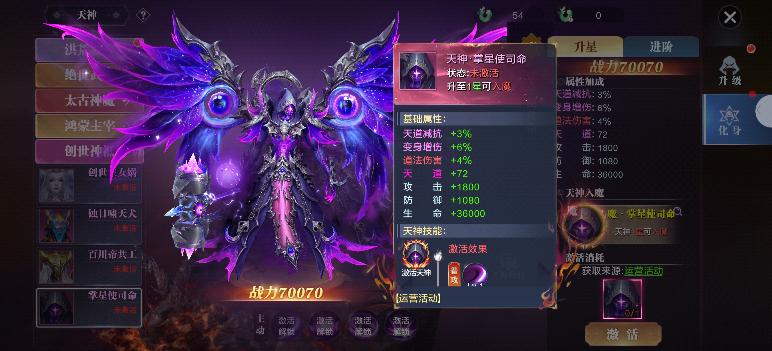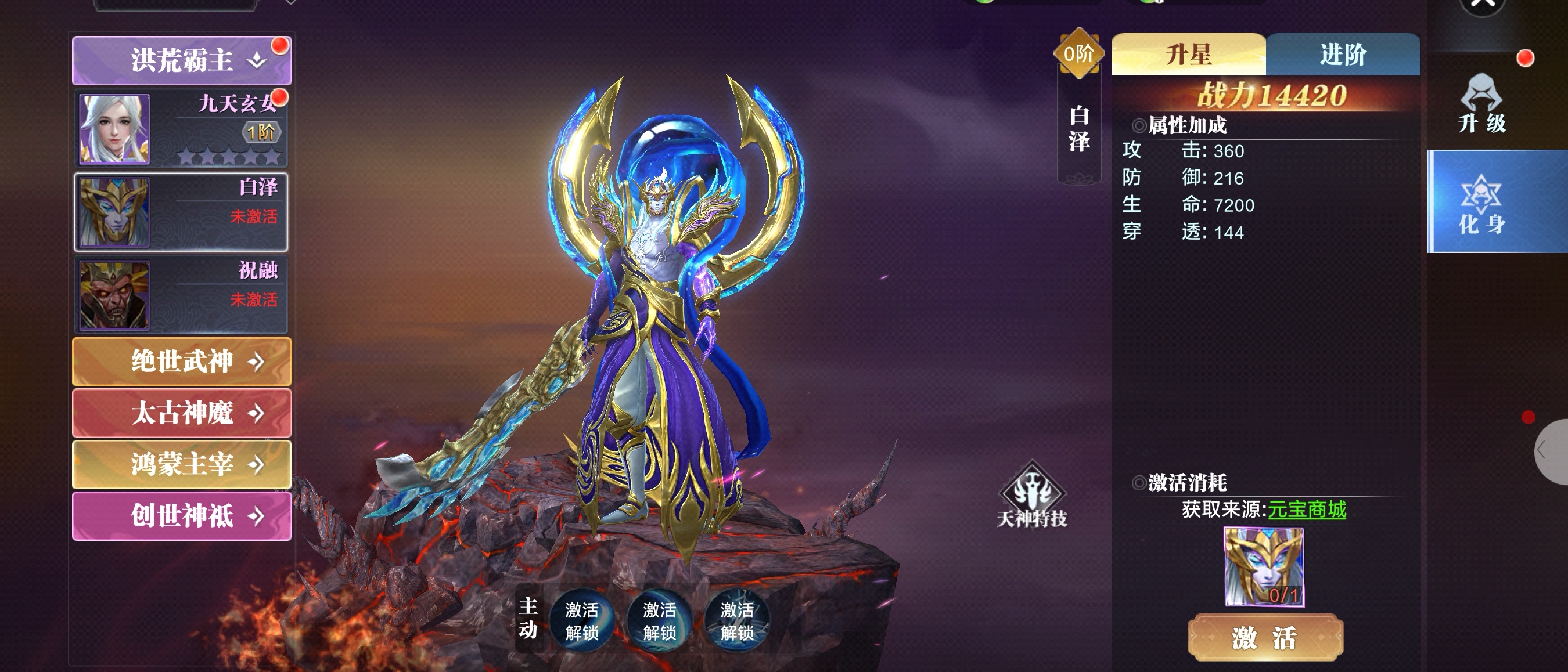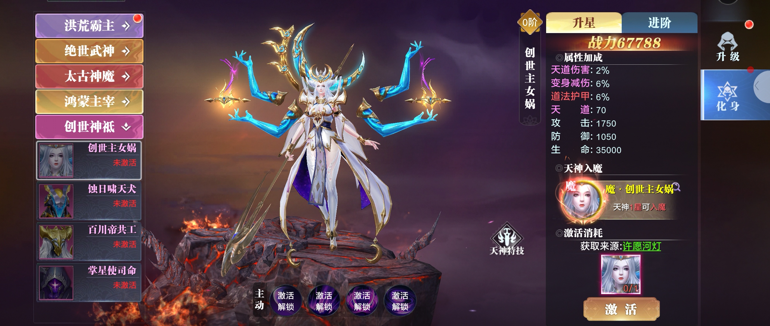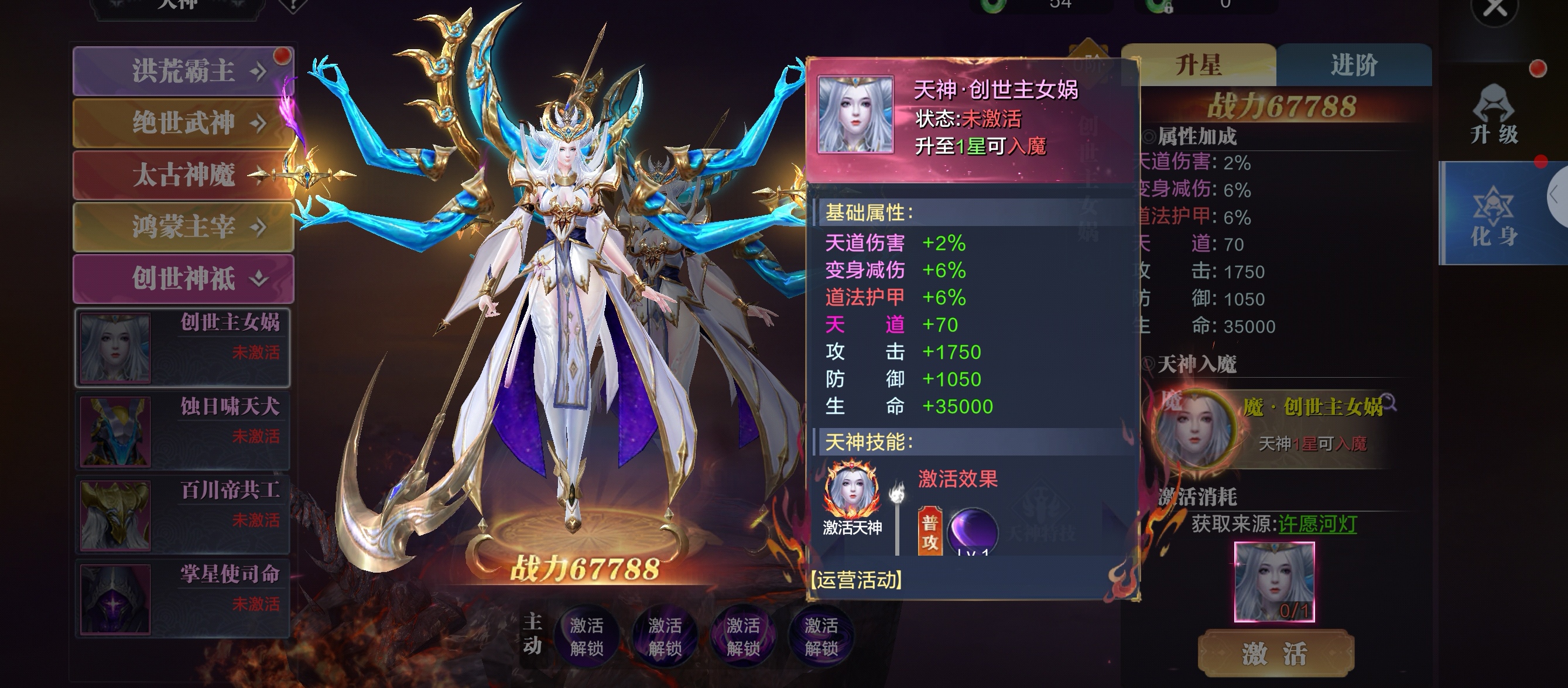 创世女神以蓝白为主色调搭配金色纹饰,衣裙融入山川大地纹样,还点缀了蛇形纹路呼应女娲的传统形象,长裙摆的延展设计让角色悬浮时更显优雅,尽显创世之母的端庄稳重。 背后延伸的蓝色羽翼状装饰,搭配环绕周身的五色石光轮,既呼应了补天的神话故事,又强化了角色的神圣感;手持的法器与整体造型风格统一,进一步凸显其创世、救世的神格。 属性详细点评 基础属性:攻击+1750、防御+1050、生命+35000,三项基础属性数值均衡且总量可观,能为角色提供扎实的生存与输出基础,在团队中可承担一定的输出和承伤职责。 属性加成:天道伤害+2%、变身减伤+6%、道法护甲+6%,这类属性针对性极强,既提升了角色的主动输出能力,又在变身状态下强化了生存能力,道法护甲还能有效抵御法术伤害,适配多种战斗场景。
