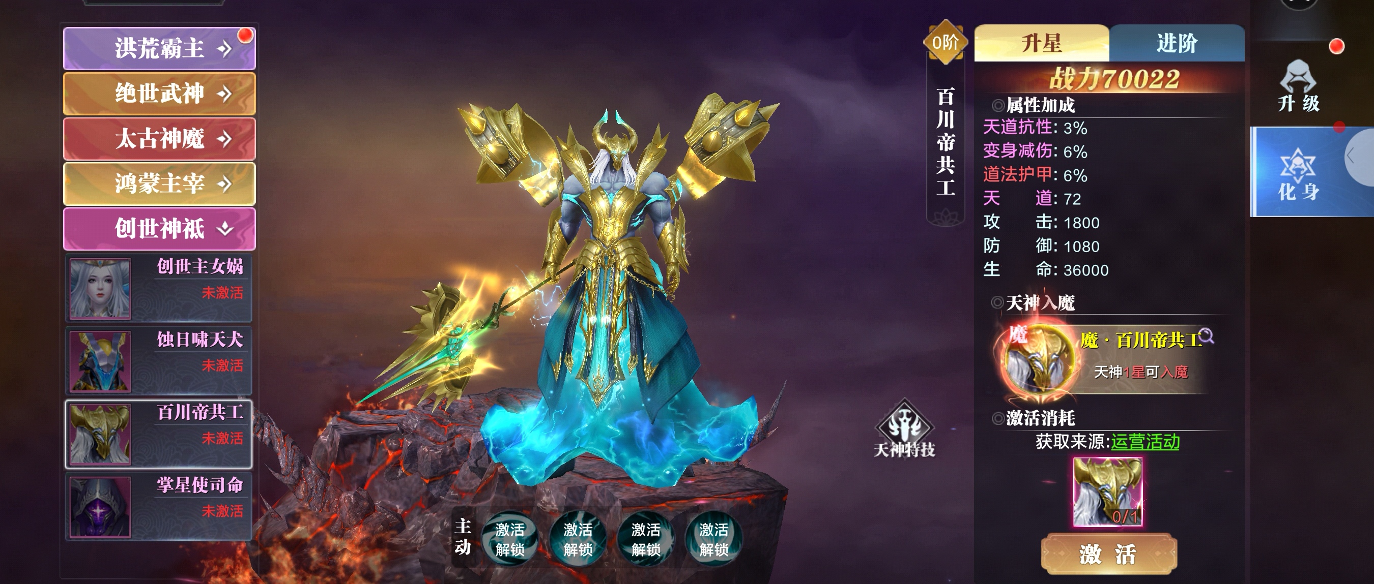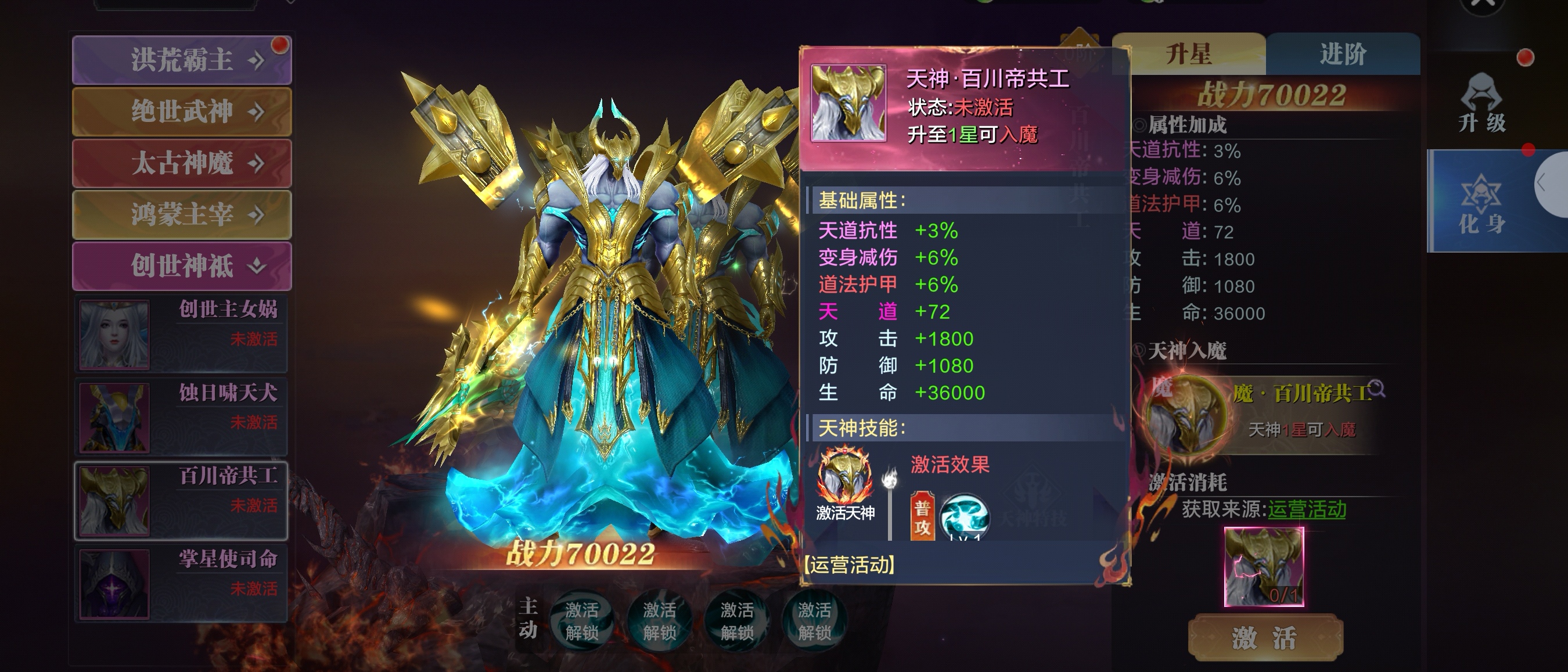 天神·百川帝共工的外观兼具神话厚重感与视觉冲击力: 造型以金蓝为主色调,金色铠甲搭配蓝色裙摆,铠甲细节繁复,肩甲、头盔带有尖锐棱角,凸显力量感;蓝色裙摆与底部的蓝色光效呼应,营造出水元素的流动感,契合共工的水神身份。角色姿态挺拔,搭配周身的光效,既展现出上古神祇的威严感,又通过蓝金配色的对比,平衡了力量感与灵动性,完美贴合其神话背景中掌控水域的设定。战力达70022,基础属性涵盖攻击+1800、防御+1080、生命+36000,同时附带天道抗性+3%、变身减伤+6%、道法护甲+6%,在生存与输出层面都有不错的基础加成,能为角色提供稳定的战力支撑。