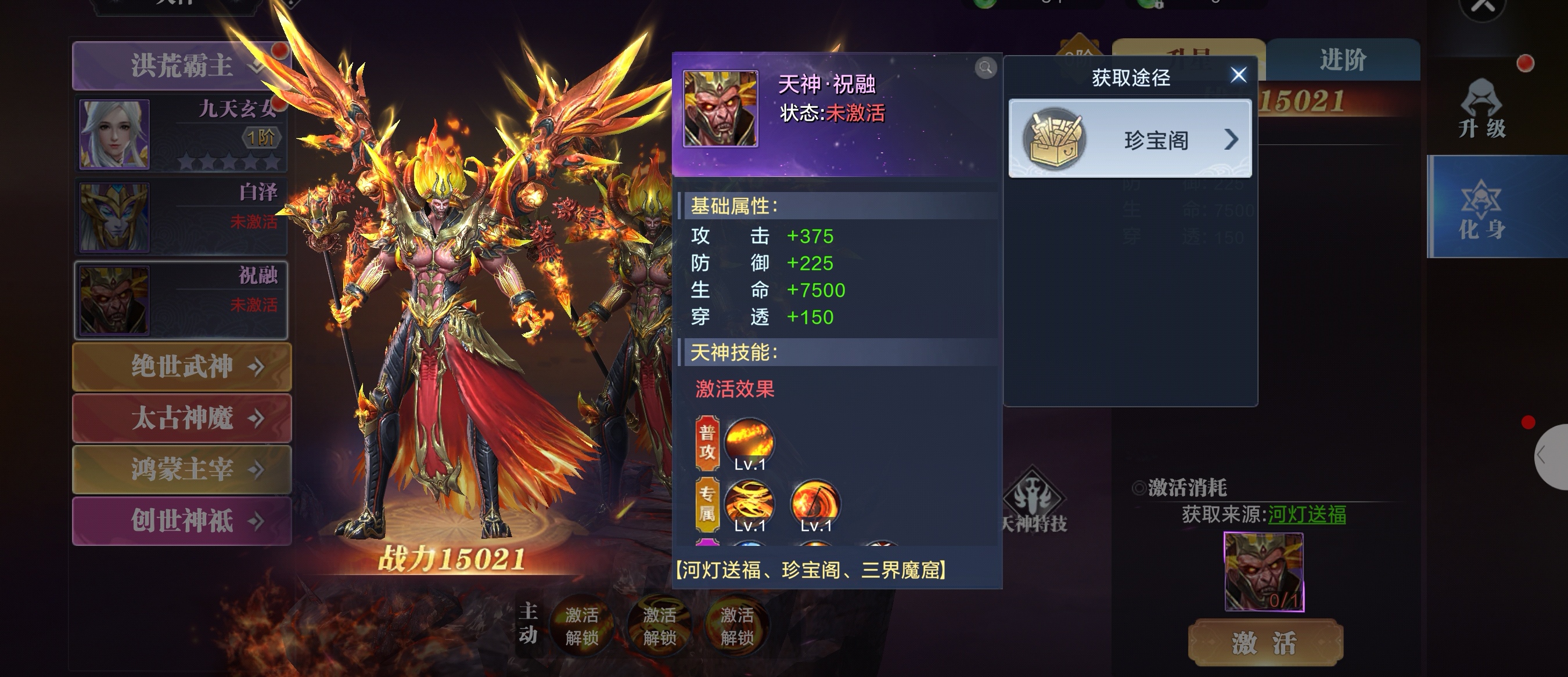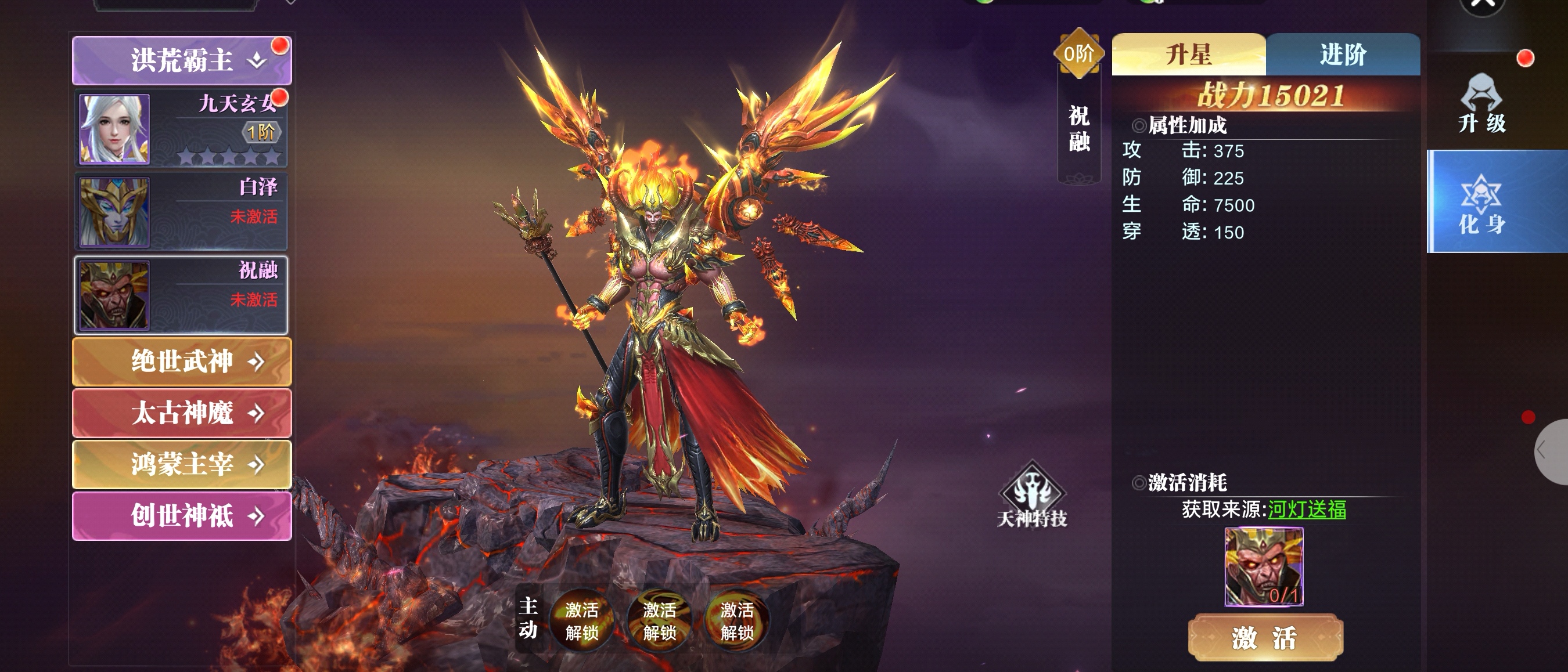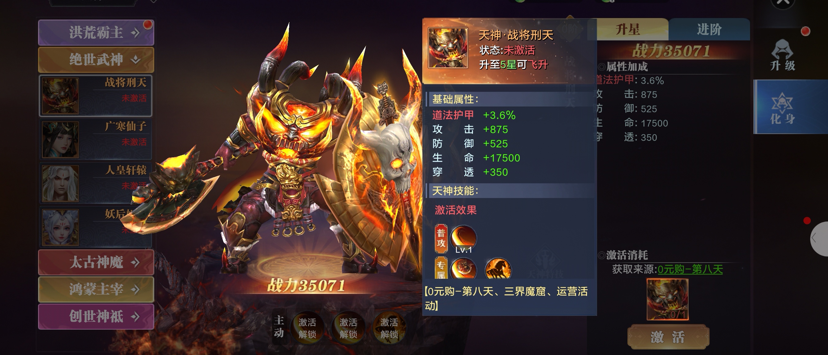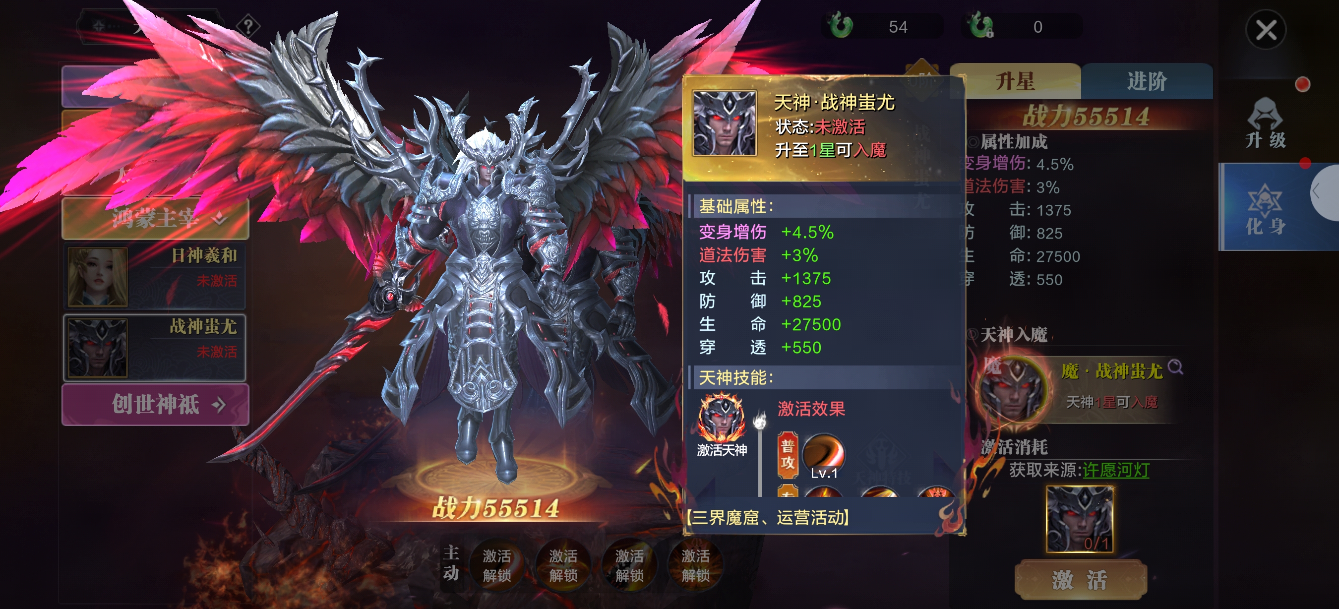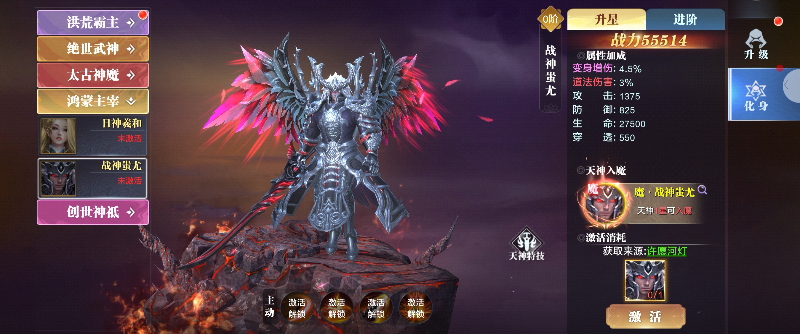 天神·战神蚩尤的外观形象塑造以银灰色金属质感铠甲为主体,搭配红黑渐变的巨型羽翼,冷硬的铠甲线条和飘逸的羽翼形成刚柔反差,既凸显战神的威严,又增添奇幻色彩;头部尖角、肩甲利刃等细节强化了战斗感,契合蚩尤勇猛战神的定位。 该角色属性偏向输出与生存的均衡型,基础属性:攻击+1375、防御+825、生命+27500、穿透+550,攻击和生命数值突出,在输出和坦度上都有不错的基础保障,穿透属性还能提升对高防御目标的伤害。 增伤buff:变身增伤+4.5%、道法伤害+3%,双增伤buff能有效提升整体输出能力,无论是物理还是法术伤害都能得到加成。