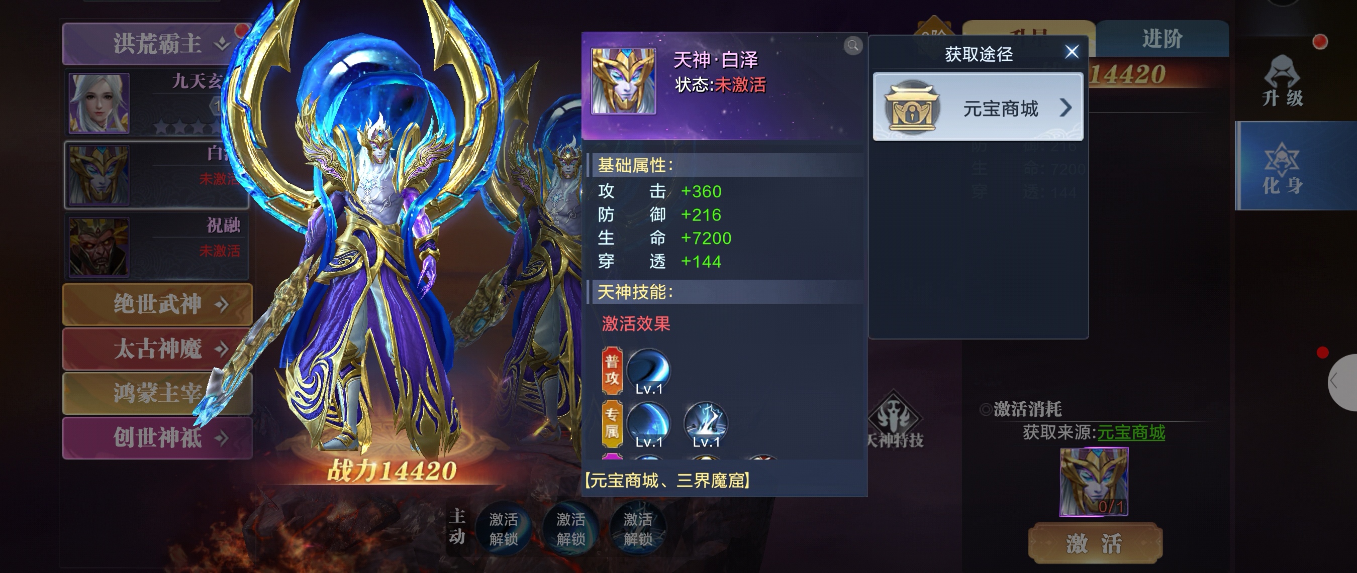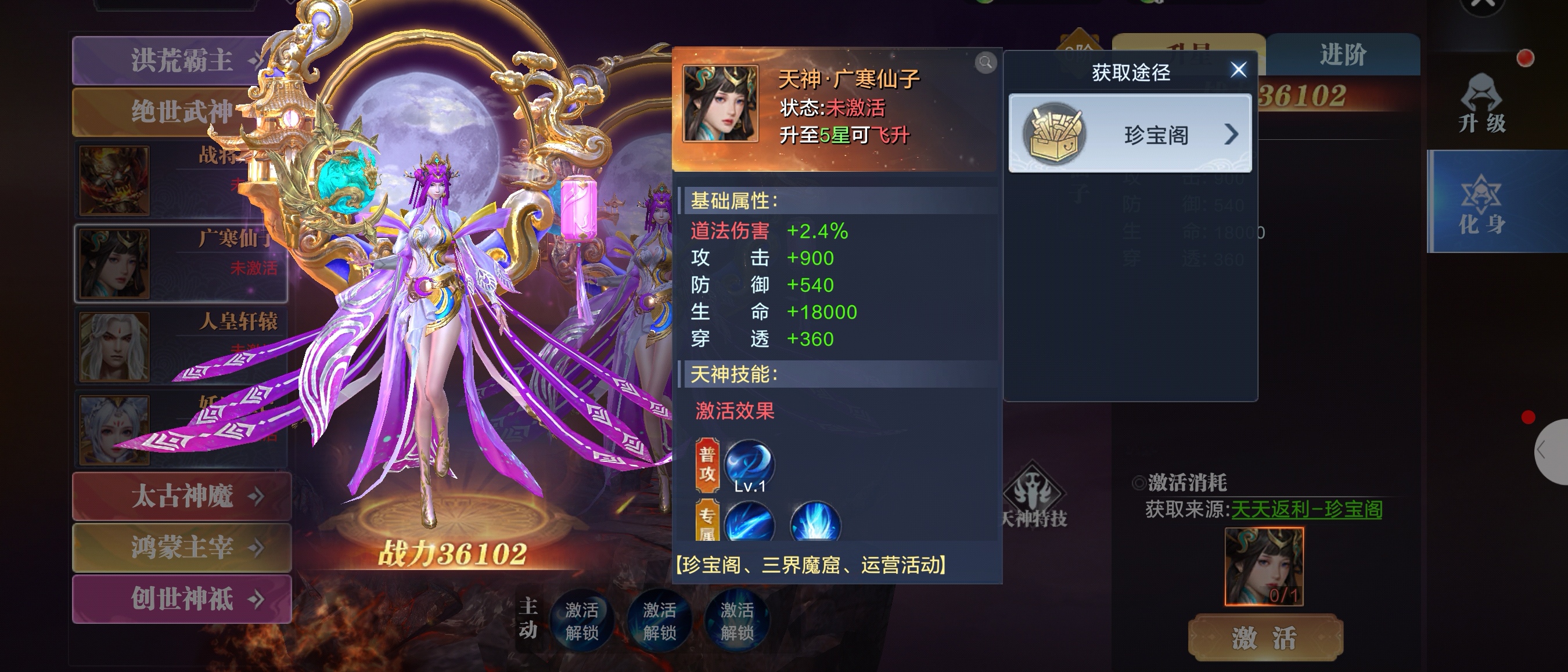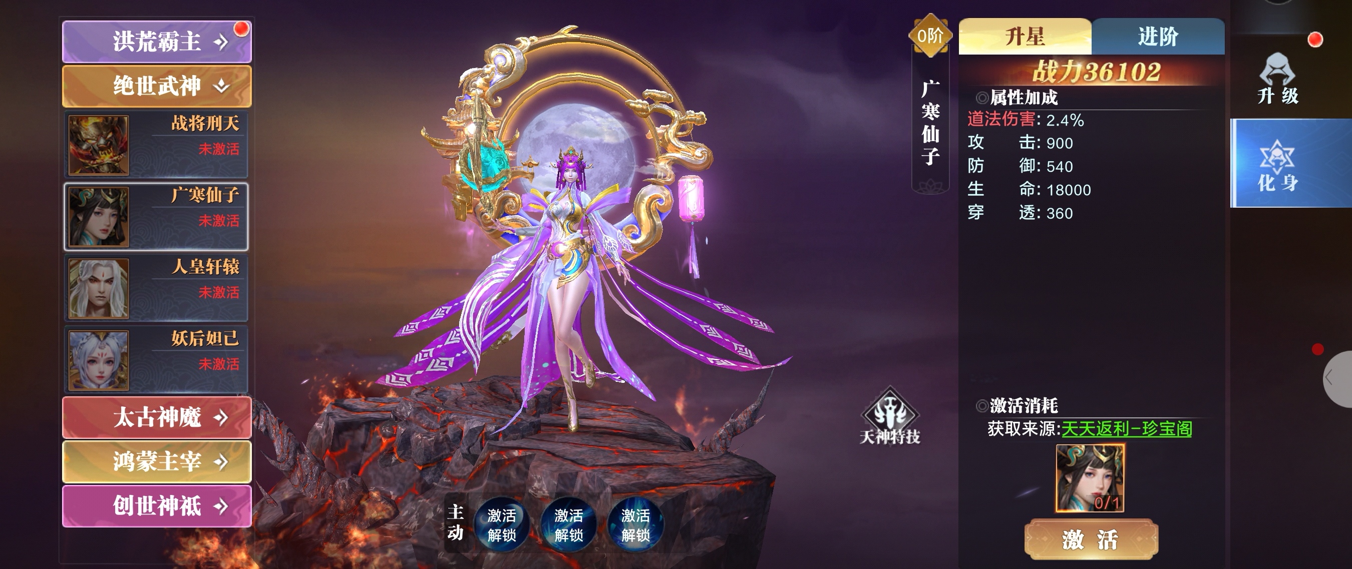 广寒仙子整体造型贴合“月之化身”的设定,以清冷的紫白配色为主,搭配飘逸的长纱与月宫元素装饰,仙气十足,完美诠释出独守广寒宫的孤寂高洁气质,视觉辨识度拉满, 基础属性 道法伤害+2.4%,能直接提升法术输出能力,在法系角色中属于不错的初始加成; 攻击+900、防御+540,攻防数值均衡,兼顾输出与生存能力; 生命+18000,拥有较高的血量基础,战场续航能力较强; 穿透+360,能有效无视敌人部分防御,提升对高防御目标的伤害。 可通过珍宝阁、三界魔窟、运营活动获取,获取渠道相对简单;激活消耗可通过天天返利-珍宝阁获取,激活后能解锁天神技能,进一步提升战力。