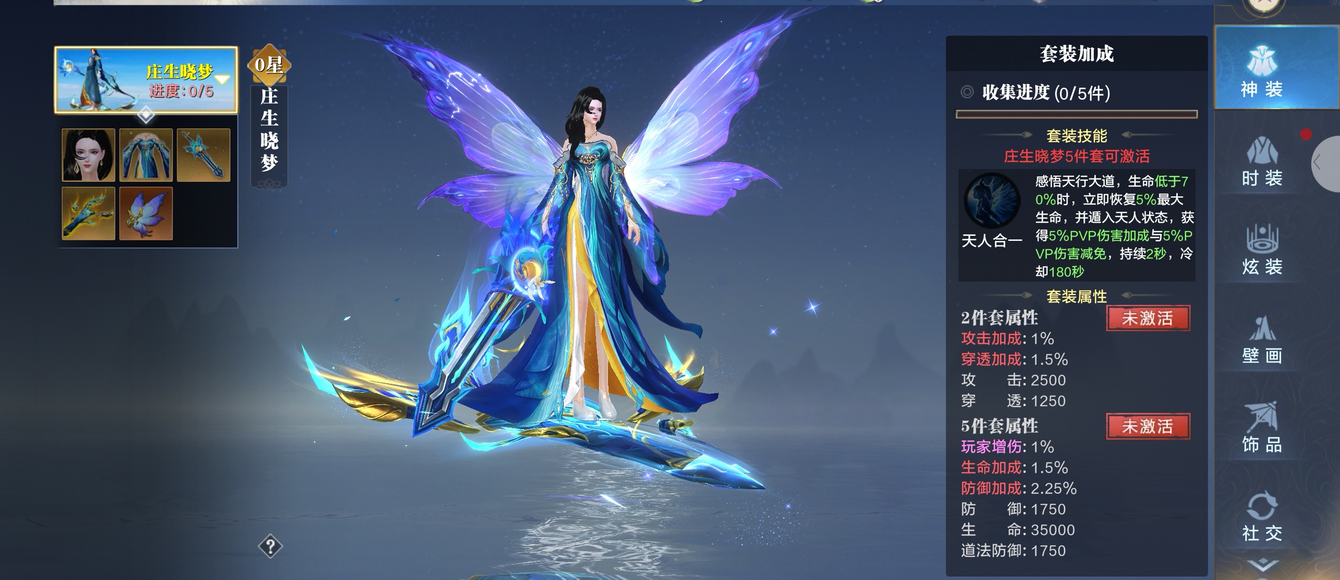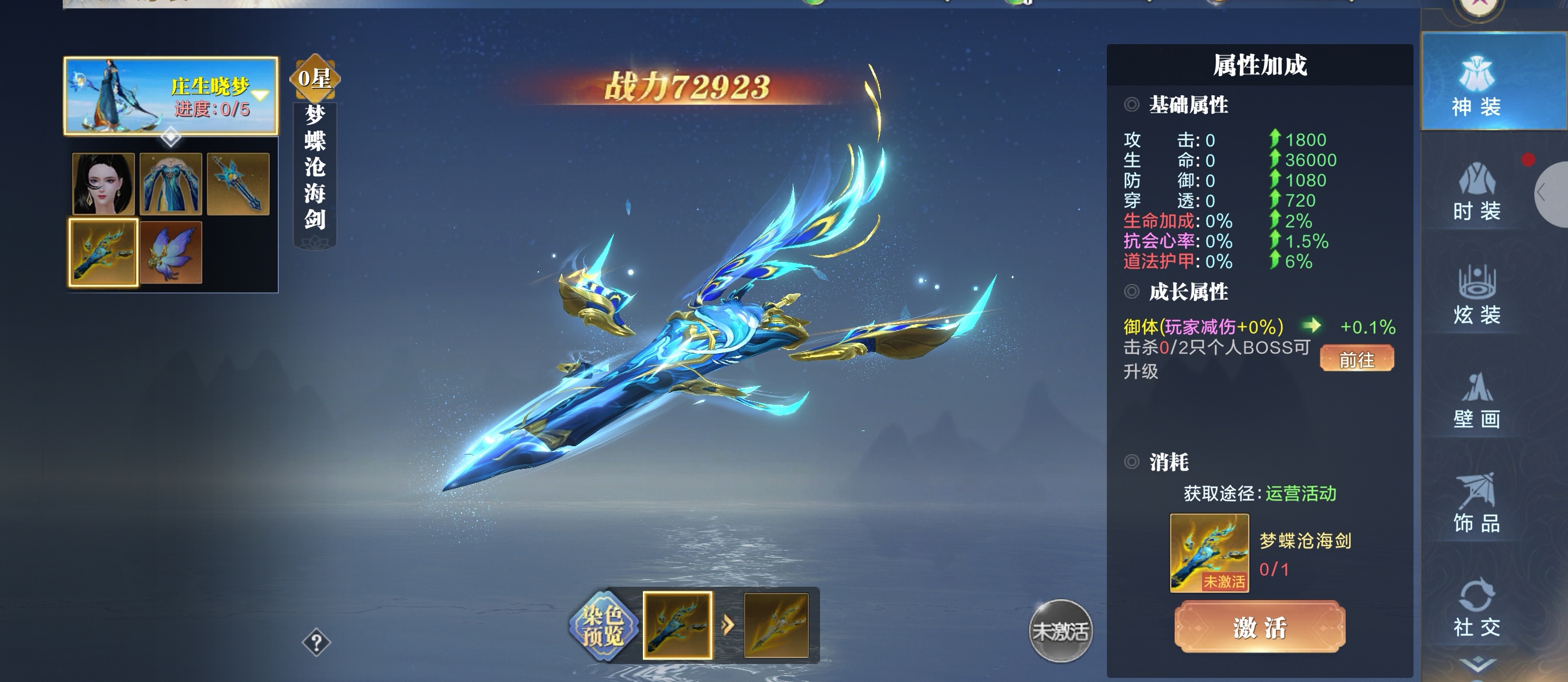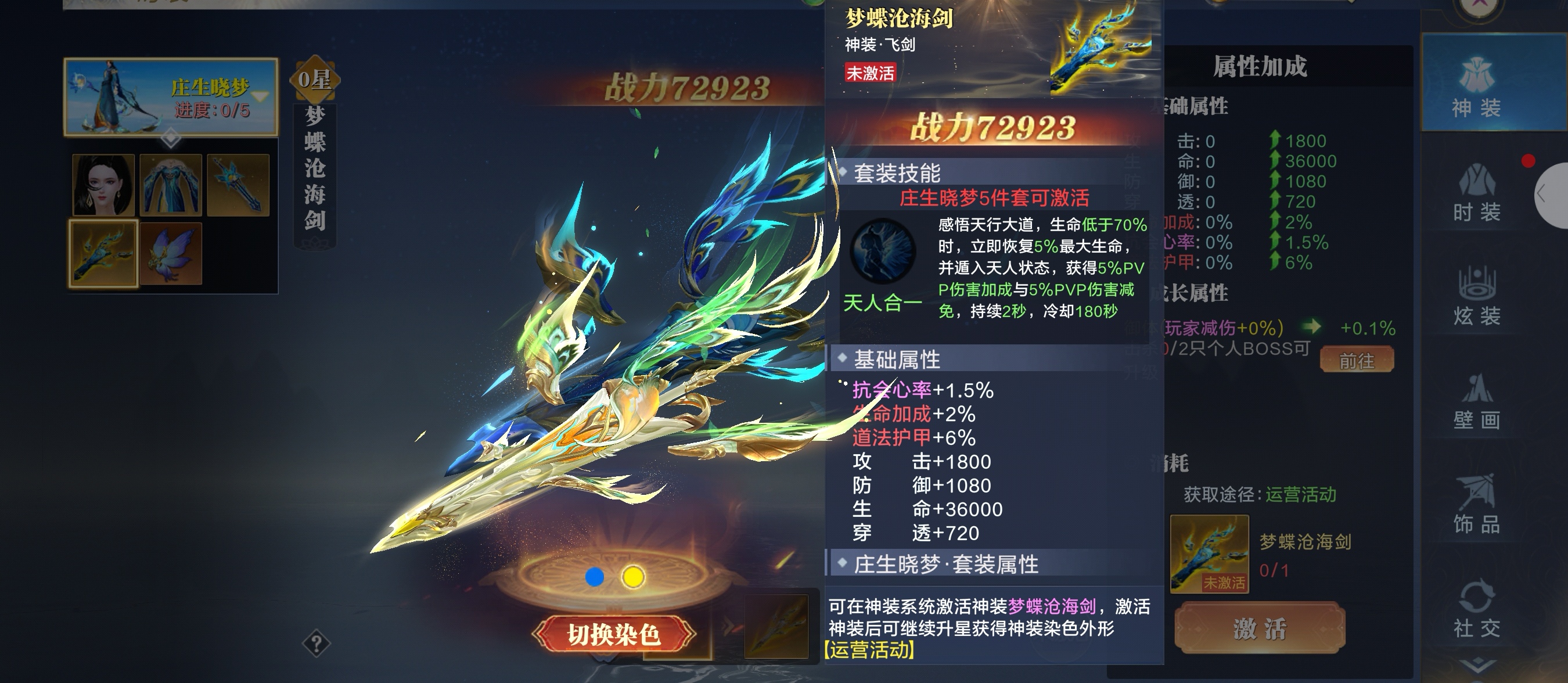 这把梦蝶沧海剑外观极具特色: 整体以蓝绿渐变的流光质感为主,搭配金色纹路点缀,剑身仿佛蕴含着灵动的气流,视觉上充满仙侠感与科技感的融合,辨识度拉满。 剑身造型修长且带有不规则的羽翼状装饰,既保留了飞剑的凌厉感,又增添了飘逸灵动的气质,契合“梦蝶”的意境,看起来轻盈又强大。 基础属性 生命+36000、攻击+1800、防御+1080、穿透+720,属于均衡型的属性加成,既能提升生存能力,也能保证输出伤害,在PVE和PVP场景中都能发挥作用。 抗会心率+1.5%、生命加成+2%、道法护甲+6%,进一步强化了生存能力,降低被暴击的风险,同时提升生命上限和护甲值,让角色在战斗中更耐打。 套装技能 激活5件套“庄生晓梦”后,生命低于70%时,能立即恢复5%最大生命,还能进入“天人合一”状态,获得5%PVE伤害加成与5%PVP伤害减免,持续2秒,冷却180秒。这个技能在续航和战斗容错率上表现突出,无论是刷本还是PK,都能在关键时刻扭转战局。 套装属性 激活神装后可继续升星获得神装染色外形,还能通过运营活动获取,后续有提升空间,随着升星还能解锁更多外观变化,兼具实用性与收藏
