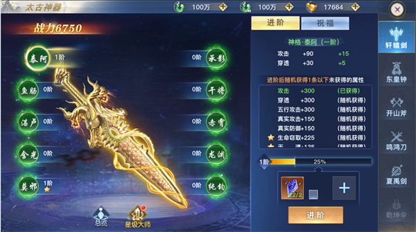 在莽荒大陆中怎样开启太古神器系统呢,用好古人智慧结晶来提升战力更好地封魔?小编来给大家简单说说怎样才能开启太古神器系统啦~!【神器系统开启条件】完成170级封魔录开启【太古神器类型】太古神器类型:轩辕剑、东皇钟(250级)、开山斧(360级)、鸣鸿刀(飞升100级)、夏禹剑(飞升200级)、乾坤伞(飞升300级)。不同的太古神器需达成不同条件后才会解锁。【太古神器进阶】每个太古神器有各种名器的神格,需把各种名器的神格全部升阶后,太古神器才能进阶。可使用道具【混元石】+红1、2星装备进行神格升阶;每选入一件装备可增加完美度,达到100%以上完美度才能放入进行进阶。名器神格进阶后可随机激活一条对应未激活的属性,此处祝各位上仙大人运气爆棚获得自己想要的属性!【神格祝福】各类名器的神格可使用【神格祝福石】进行祝福,祝福后可获得大量属性增幅,各位上仙大人在神域获取祝福石后记得使用呀。【星际大师】每次太古神器的名器进阶都可获得1星,累计达到X星即可点亮天命属性。以上就是神器系统的全部介绍啦,不知道各大家最喜欢的是哪个神器呢~