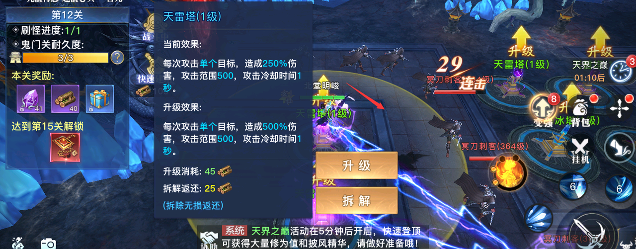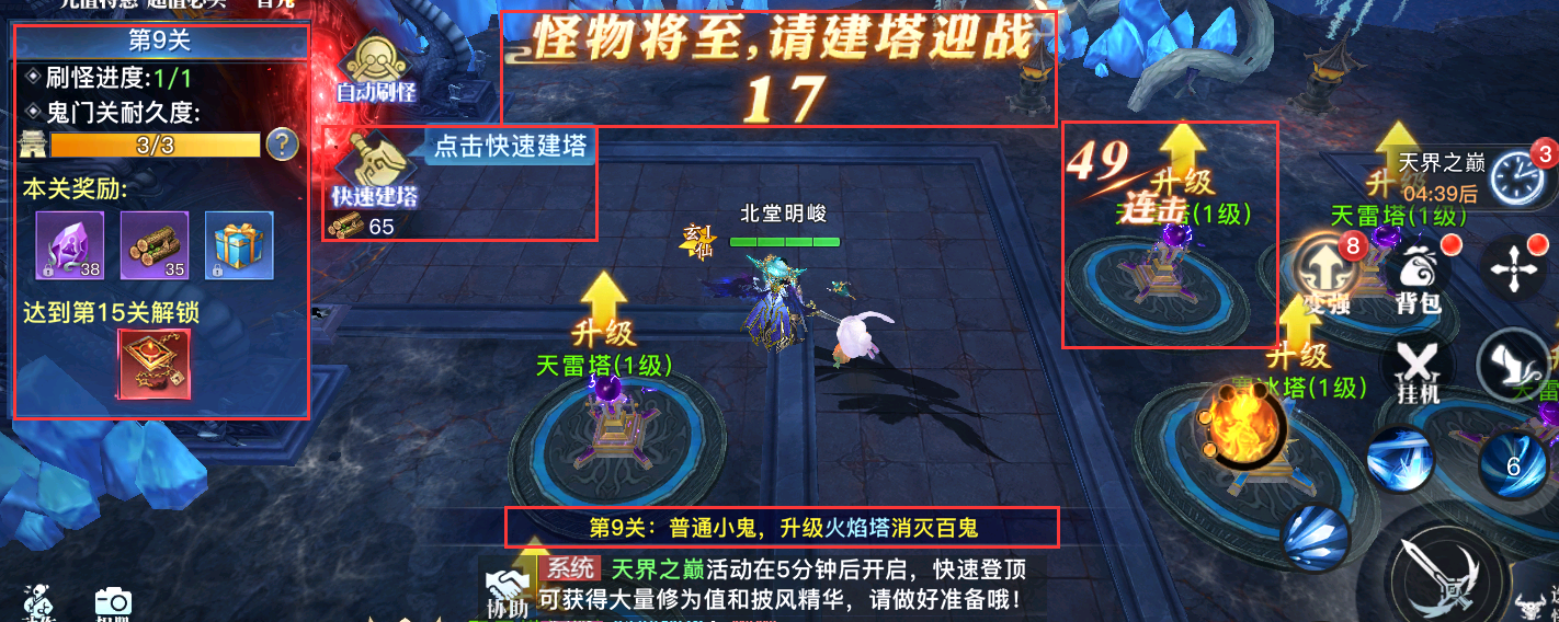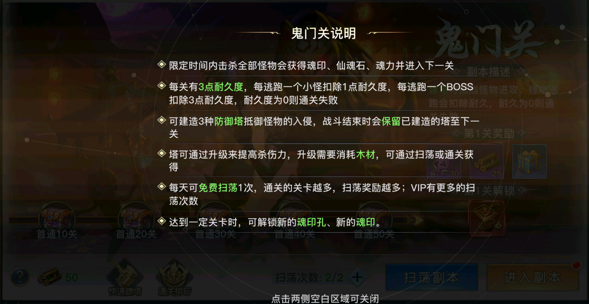 随着等级提升,已经有不少玩家进入超有意思的【鬼门关】玩法了!小编邀请来高级大神讲解鬼门关勇闯攻略,希望能帮助到大家获取玩法福利!【玩法介绍】魂印系统开启后,魂印主要产出是从这个鬼门关玩法里产出的,这个玩法是一个塔防类的小游戏。建塔可抵挡怪物进攻,怪物逃跑会扣除耐久,耐久为0则通关失败。主要是通过建塔防御怪物的进攻,不让怪物逃跑。【玩法详细说明】总结一下就是:可以建造3种防御塔,来防守怪物进攻,在规定时间内胜利即可获得奖励,通关一定层数后解锁魂印孔和魂印,每天有次数限制,建塔需要的材料需要通关或扫荡才有产出。加载页面小提示:合理利用防御塔,是成功闯关的关键!进来后会有几个比较能够获取到信息的地方,第一个:三种防御塔建造所需要的资源,天雷塔需要25点木材,火焰塔需要25点木材,寒冰塔需要40点木材;第二个:当前关卡的一个小提示,怪物的种类和属性,当然还有推荐建塔方式;第三个:左侧的当前关卡通关奖励;第四个:出怪倒计时以及地面能够建造塔的地区;点击快速建塔后会出现整个地图的样貌,一共有16的可以建造防御塔的地方。我们点击三种塔,分别可以看到三种塔不同的属性天雷塔:单体攻击(1个目标),范围500,攻击冷却1秒,高伤高频率单体攻击低消耗。火焰塔:群体攻击(3个目标),范围500,攻击冷却1秒,低伤高频率群体攻击低消耗。寒冰塔:群体攻击(4个目标)附带减速效果,范围500,攻击冷却1.5秒,低伤低频率群体攻击高消耗。从塔的属性和消耗来看,当然是选择天雷+火焰搭配部分寒冰塔是最优的,因为寒冰塔的消耗实在是太高了,所以寒冰塔只能作为一个减速怪物进攻节奏的工具塔了,只要全程可以让怪覆盖上减速效果即可。在游戏内,通过点击身边的塔,可以看到塔的攻击范围,从而调整塔的摆放位置,尽可能的使自己的拦截效果变的更好。同时,在塔攻击的时候人物也可以参与拦截,这个时候用天神变身后的aoe搭配防御塔,打的可以更快一些,同时还可以使用人物的控制技能来延缓怪物的移动速度。这边也可以提供一个塔的摆放作为参考:玩法思路:天雷塔在跟火焰塔同攻击频率的情况下拥有更高的伤害,同时搭配寒冰塔的减速再打出更多的伤害,优先升级天雷塔,可能输出的更快,最后再升级寒冰塔,因为寒冰塔主要是用来减速,所以优先级并不高。好啦,本期讲解就到这里啦!