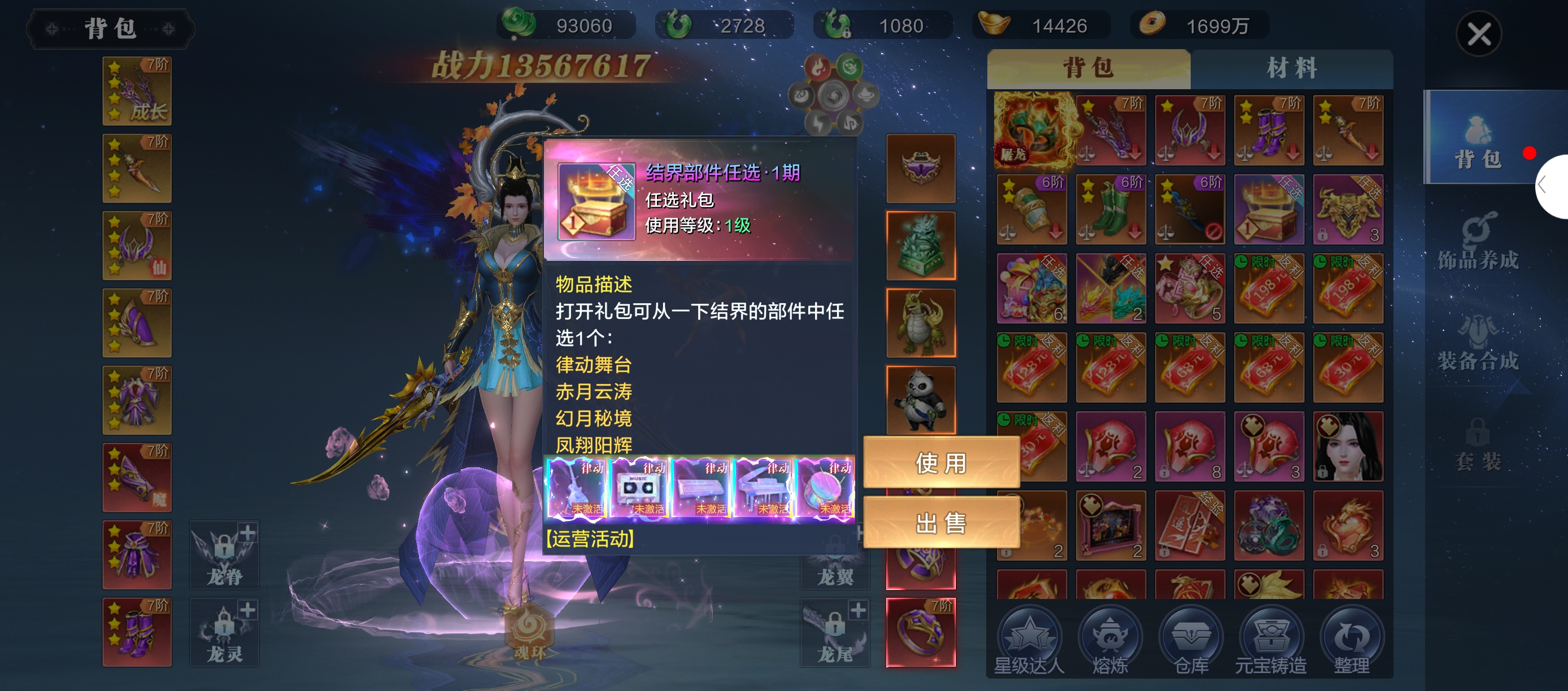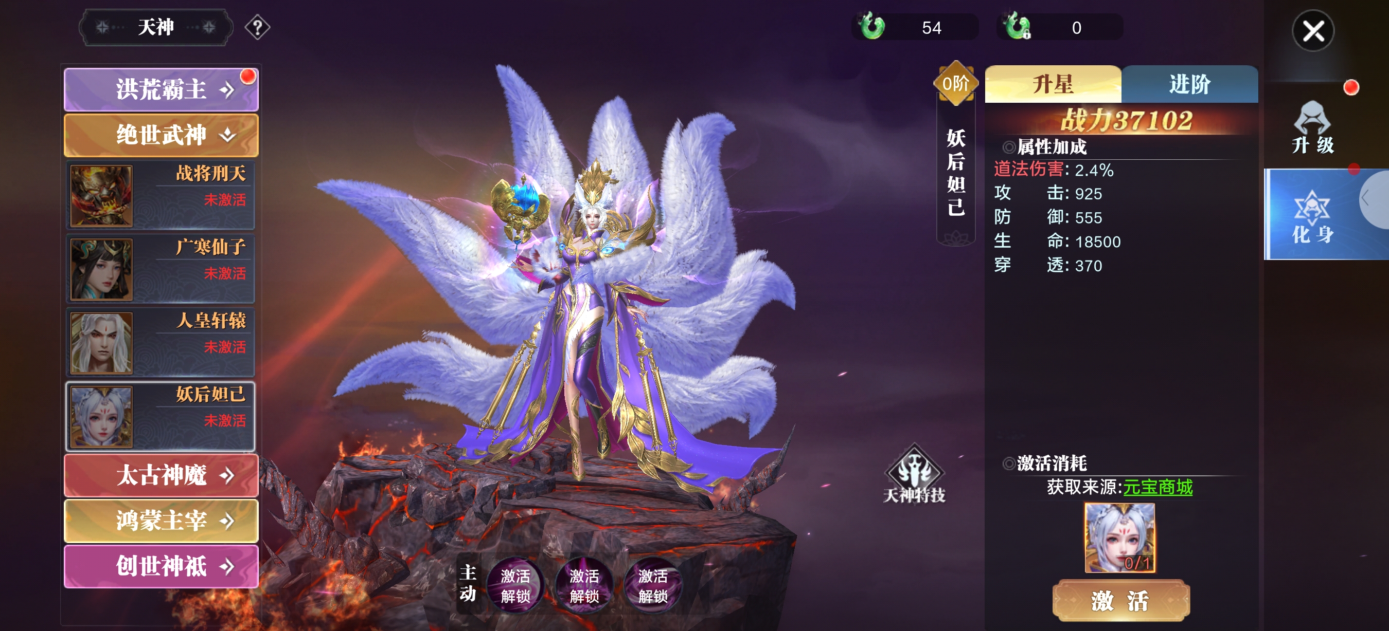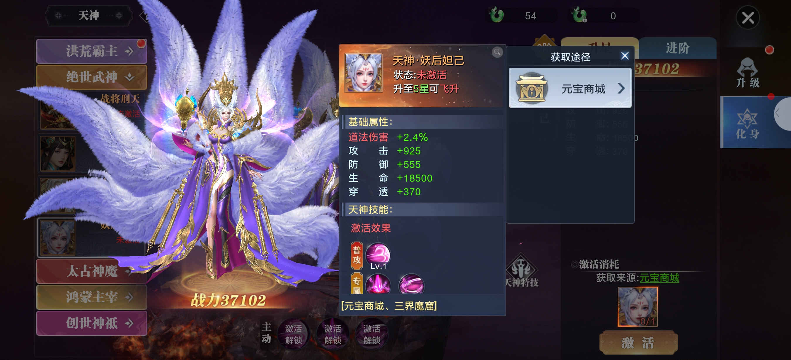 天神妖后妲己造型华丽精致,以紫白为主色调,搭配金色装饰,既保留了妲己原本的魅惑气质,又增添了天神的威严感。背后巨大的白色羽翼层次分明,服饰细节丰富,整体造型兼具仙气与霸气,视觉冲击力强,完美契合“妖后”的设定 道法伤害+2.4%,能直接提升法术输出能力,在对战中可增强技能伤害占比。 攻击+925、防御+555,攻防属性均衡,既保证了输出能力,也能在一定程度上提升生存能力。 生命+18500、穿透+370,高额生命值进一步强化了生存能力,穿透属性则能有效克制敌方法术防御,提升对坦克、肉盾类目标的伤害。升至5星可飞升,进阶后属性和技能会有质的飞跃,战力提升空间巨大。