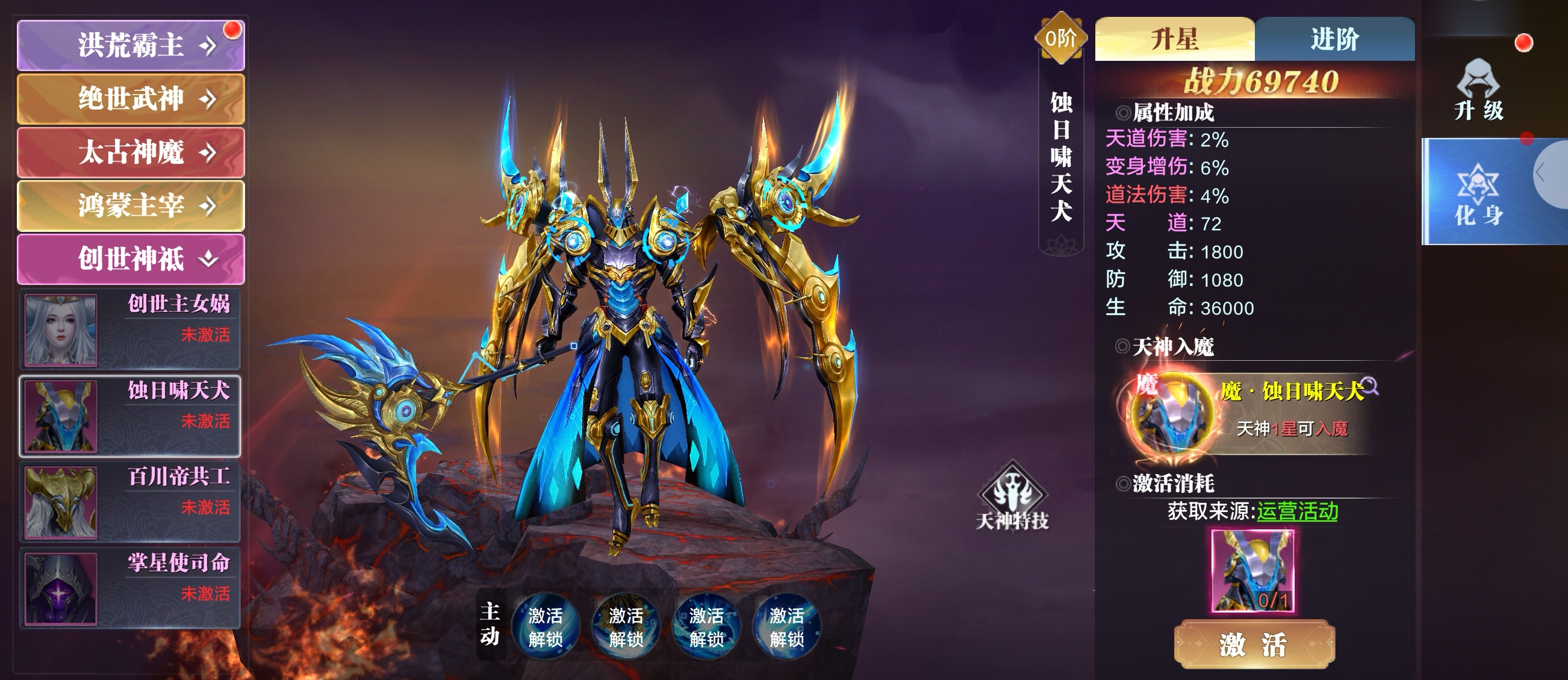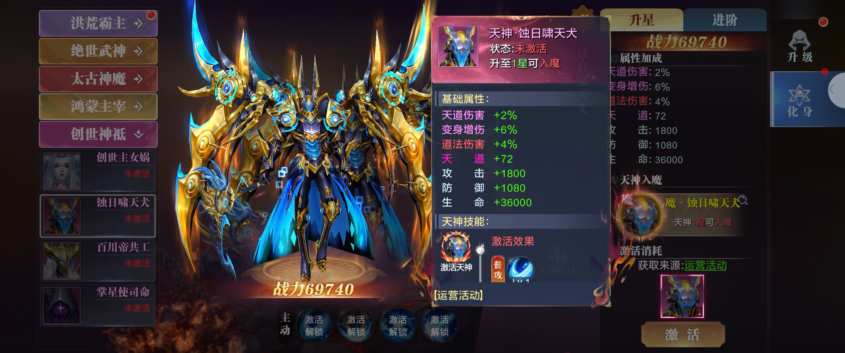 天神·蚀日啸天犬以神话中二郎神的神兽哮天犬为原型,做了华丽的神化改编:整体是冷峻的机械神兽风,金色装甲搭配深蓝能量纹路,尖锐的肩甲、头角和流线型躯体,既保留了原著里细犬的矫健身姿,又增添了天神专属的威严感,视觉冲击力强。装甲上的齿轮、符文元素强化了“天神”的科技感,蓝色能量特效模拟出“蚀日”的暗黑氛围,和金色主体形成鲜明对比,凸显出角色的高阶定位。基础属性:数值偏向输出,1800攻击、10800防御、36000生命,搭配72点道法,兼顾了输出能力与生存能力,能适应多种战斗场景。 属性加成,天道伤害+2%、道法伤害+4%,直接提升法术输出,对依赖法术伤害的阵容适配性高; 变身增伤+6%,能和变身类技能形成联动,进一步放大爆发伤害,升至1星可解锁“入魔”形态,会带来属性或技能的质变,后续成长空间充足;性价比突出。