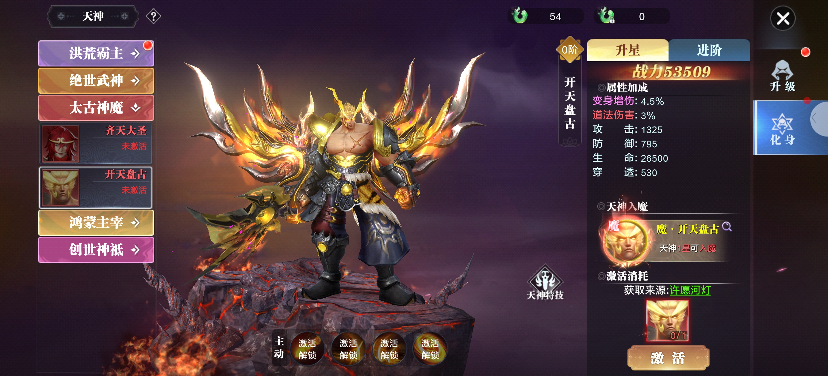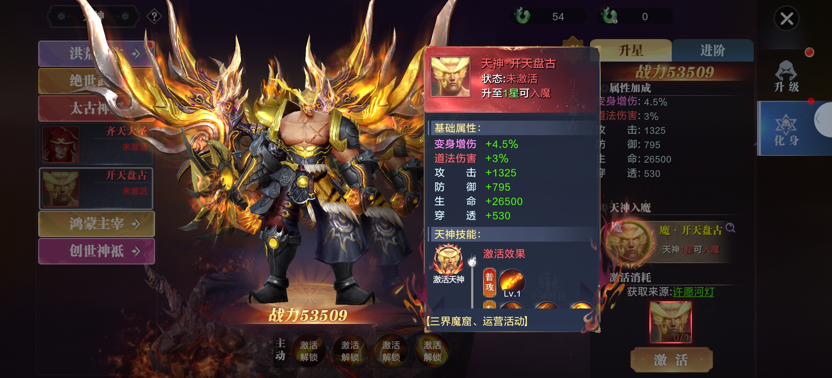 开天盘古的外观设计兼具力量感与神话氛围: 整体是肌肉健硕的巨人形态,赤裸上身搭配深色劲装,完美契合盘古顶天立地的创世神定位,充满原始力量感;背后展开的金色火焰状羽翼,既呼应了开天辟地时的混沌烈焰意象,又增添了神圣威严感,让角色看起来极具压迫感。 攻击+1325、防御+795、生命+26500、穿透+530,各项属性数值均衡且可观,生命值和防御能提供不错的生存能力,攻击和穿透则保证了输出能力,在战力53509的定位里属于攻防兼备的类型。 属性加成:变身增伤+4.5%、道法伤害+3%,再加上变身增伤4.5%、道法伤害3%的额外加成,进一步提升了输出爆发力,不管是面对单体还是群体目标,都能打出可观的伤害。