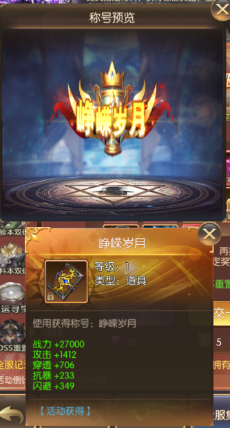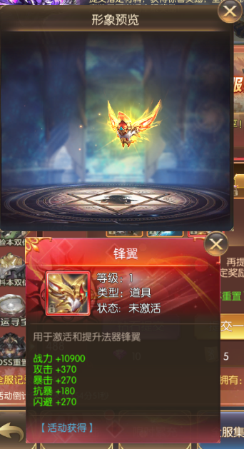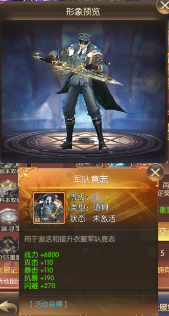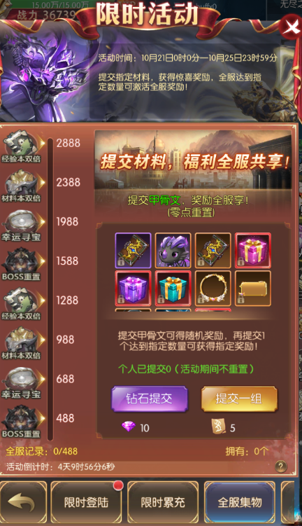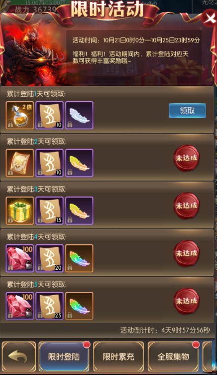活动期间,开服满7天的服务器即可参与 (最终活动内容以游戏内显示为准) 限时登录 活动简介:福利!福利!活动期间内,累计登陆对应天数可获得丰富奖励哦~ 活动时间:2022年10月21日00:00:00—2022年10月25日23:59:59 限时累充 活动简介:活动期间,累计充值达到一定金额,可领取游戏为你准备的返利豪礼 活动时间:2022年10月21日00:00:00—2022年10月25日23:59:59,每天一场 全服集物 活动简介:提交指定材料,获得惊喜奖励,全服达到指定数量可激活全服奖励! 活动时间:2022年10月21日00:00:00—2022年10月25日23:59:59 时装、法器:军队意志----锋翼 称号:忆往昔----峥嵘岁月 宠物-魔眼幼龙