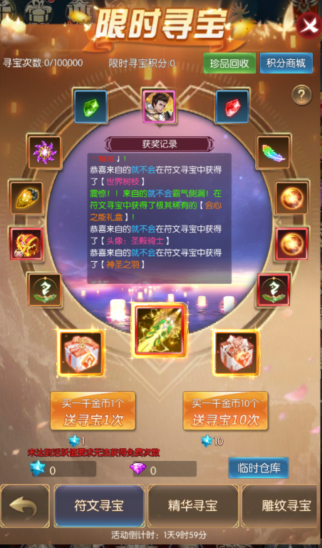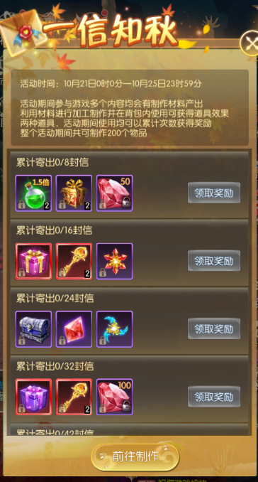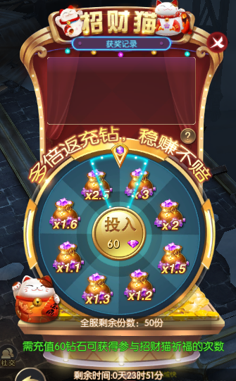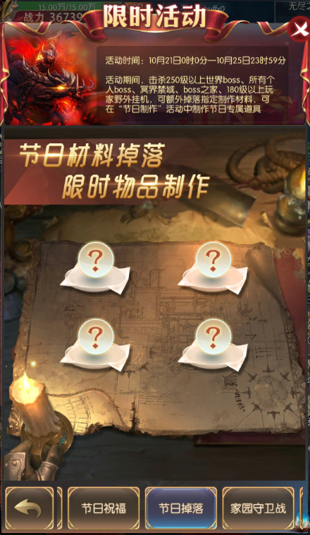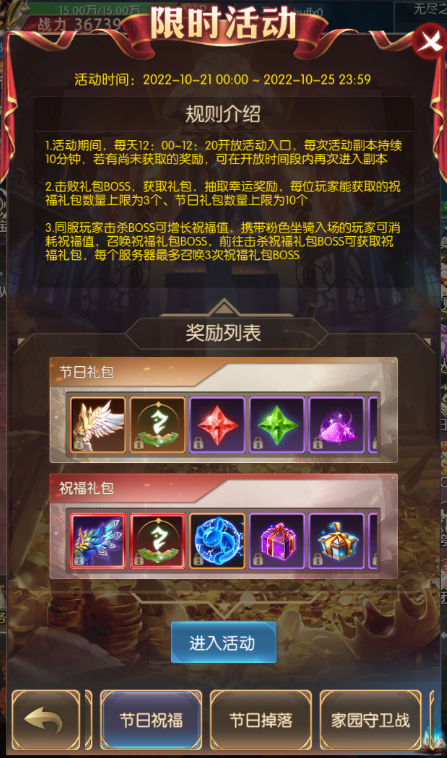 活动期间,开服满7天的服务器即可参与 (最终活动内容以游戏内显示为准) 家园守卫战 活动简介:活动期间每天刷新9波怪物,击杀怪物有机率获得珍稀家园道具。 活动时间:2022年10月21日00:00:00—2022年10月25日23:59:59 节日掉落 活动简介:活动期间,击杀250以上世界BOSS、所有个人BOSS、冥界禁域、BOSS之家、180级以上玩家野外挂机,可额外掉落指定制作材料,可在-节日制作-活动中制作节日专属道具。 活动时间:2022年10月21日00:00:00—2022年10月25日23:59:59 节日祝福 活动简介:活动期间,每天12:00-12:20开放活动入口,每次活动副本持续10分钟,尚有未获取的奖励,可在开放时间段内再次进入副本。 击败礼包boss,获取礼包,抽取幸运奖励。每位玩家能获取的祝福礼包数量上限为3个,节日礼包数量上限为10个。 同服玩家击杀BOSS可增长祝福值,携带粉色坐骑入场的玩家可消耗祝福值,召唤祝福礼包BOSS,前往击杀祝福礼包BOSS可获取祝福礼包,每个服务器最多召唤3次祝福礼包BOSS。 活动时间:2022年10月21日00:00:00—2022年10月25日23:59:59 节日制作 活动简介:活动期间参与游戏多个内容俊辉有制作材料产出,利用材料进行加工制作并在背包内使用可获得道具效果,两种道具,活动期间使用均可以累计次数获得奖励。整个活动期间共可制作200个物品。 活动时间:2022年10月21日00:00:00—2022年10月25日23:59:59 额外掉落 活动简介:活动期间,击杀250级以上世界boss、所有个人boss、冥界禁域、boss之家。180级以上玩家野外挂机有几率额外掉落指定道具,可在指定集物活动中提交获得奖励。 活动时间:2022年10月21日00:00:00—2022年10月25日23:59:59 幸运转盘 活动简介:每满足充值金额可获得1次转盘次数;次数获得有每日上限,达到上限后不再获得; 次数每天24点清空 活动时间:2022年10月21日00:00:00—2022年10月25日23:59:59 招财猫 活动简介: 1.投入钻石进行招财猫祈福,将会获得一定倍数的招财猫奖励,最高获得3倍祈福奖励 2.每个档位的招财猫每位玩家只能参与一次,并且全服有一定的参与份数总数,以上两个份数任意一个被买完则会自动进入下一档 3.招财猫奖励有一定的充值金额要求 4.参与完所有档位的招财猫祈福后,退出界面后招财猫活动将关闭 活动时间:2022年10月21日 跨服团购 活动简介: 1.商品有对应额外奖励,参与购买对应商品且满足对应所需购买人数方可领取额外奖励; 2.额外奖励需手动领取,活动结束未领取不会补发 活动时间:2022年10月21日00:00:00—2022年10月23日23:59:59 限时寻宝 活动简介:进行寻宝即可获得丰厚奖励;限时寻宝时获得的积分,可在限时寻宝积分商城兑换珍稀道具,仅在限时寻宝开启时可使用,本次开启未用完的积分会保持到下次开启依旧可以使用 活动时间:2022年10月24日00:00:00—2022年10月25日23:59:59 奇迹酒馆 活动简介: 1.点击酒杯即可砸开酒杯,获得奖励 2.每次刷新有几率出现"铜酒杯","银酒杯","金酒杯" 3.普通与银酒杯有几率开出极品大奖,金酒杯砸开必得极品奖励 4.免费刷新次数每天最多获得3次,活动结束后将重置,请及时使用 5.请理智消费,适度游戏 活动时间:2022年10月21日00:00:00—2022年10月25日23:59:59