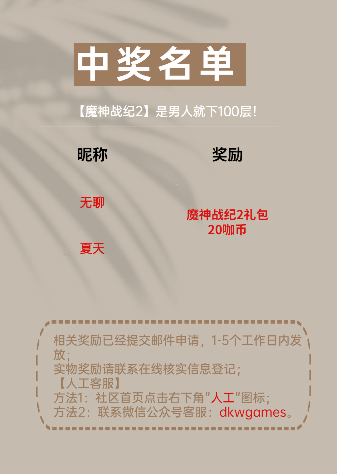 注:游戏礼包奖励请联系在线核实信息登记领取!是男人就下100层 极限挑战限时开启在神迹大陆之上,玩家等级到达满级可不是游戏的终极目标,提升实力突破关卡才是《魔神战纪2》的魅力所在。《魔神战纪2》“BOSS天关竞速赛”极限挑战-冰雪长廊惊艳亮相,尽情挑战你的关卡吧!【活动时间】即日起~1月29日【参与方式】活动期间,在本帖内回复当前挑战关卡数或挑战宣言+关卡截图即可参与活动~回帖格式:关卡数或挑战宣言+目前关卡截图-----------------------举个例子:内容:我准备一口气挑战到100关!【活动奖励】魔神战纪2礼包*1+20咖币闯关好礼!礼包内容:(宠物进阶丹*10,坐骑悟性丹*1,1.5倍经验药水*3,个人挑战券*1,绑钻*88)闯关好礼:评论中随机抽5位!【温馨提示】1、活动结束后,3个工作日内在原帖公布获奖名单,7个工作日内发放奖励;2、不符合活动要求或者违反社区行为规范的活动贴,取消获奖资格;3、活动期间到奖励发放完毕前,请咖友们不要更改昵称或删评论,避免奖励发放失败;4、本次活动解释权归《大咖玩》运营团队所有。