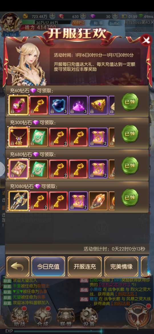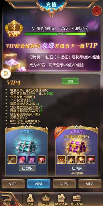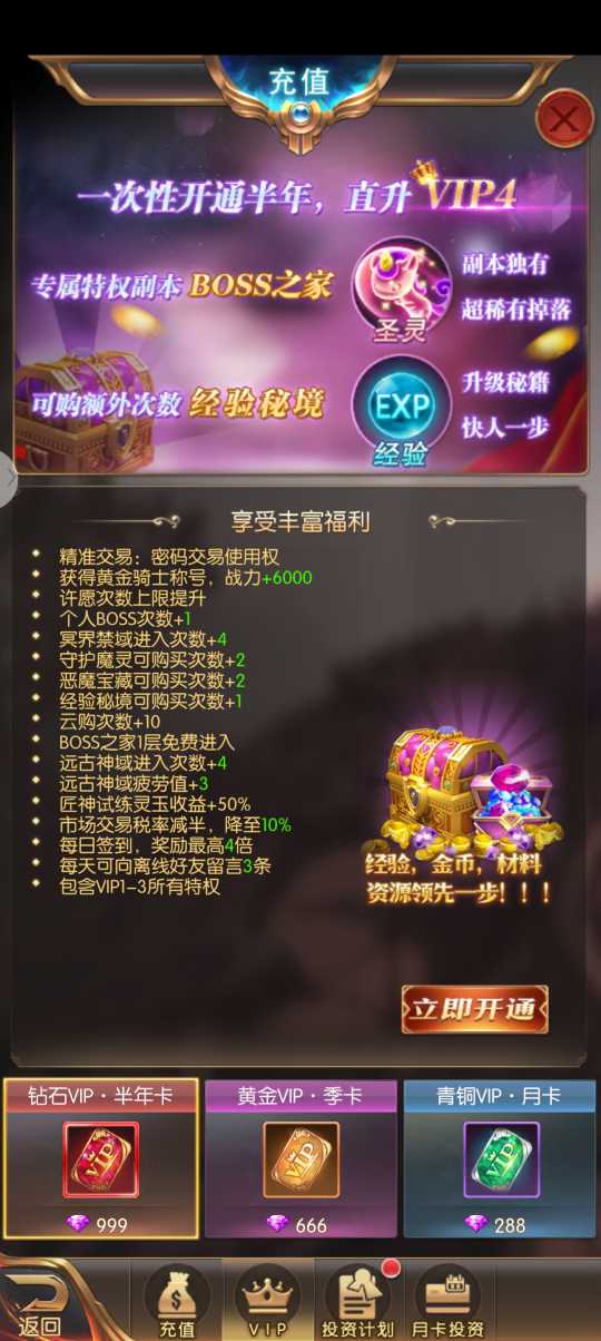 开服第一天 进游戏直接充个V4 然后升到140级有招财猫 《招财猫转动消耗的钻石计算在Vip经验值的》 招财猫转满后,把投资计划月卡计划什么的开一下 然后0元购的买一下,再去寻几下宝,这样马上就到V5了 V5可以打四次经验副本,花288钻打开首充送的箱子加上充值和赠送的经验密令,第一天就能打7次经验副本 经验副本在晚上23:18分开始打,氪一下首充箱子里的3倍经验药水,因为药水能持续一小时,可以让10次经验副本享受3倍药水效果,12点后3倍药水还能持续18分钟,可以打3次副本,充值100块送一个经验密令,加上V5额外的次数,可以留两次副本等战力升一下,晚上10点钟再打,挑战boss直接去格兰之森,那个是100级以前的地图,小怪等级低,一秒一大群。 虽然大部分人和老玩家都知道,希望不知道的小哥哥小姐姐用我这方法拿称号拿粉装,一点也不难,就是要熬夜哟😂