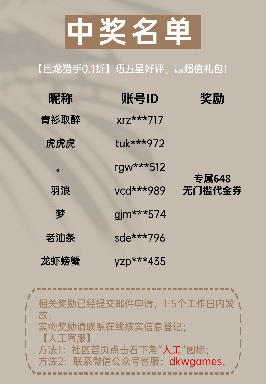 小咖又又又又来给大家送福利啦ヾ(◍°∇°◍)ノ゙!《巨龙猎手0.1折》今日正式首发,小咖需要各位的帮助与支持~即刻起,在《巨龙猎手0.1折》详情页的游戏评论中,给出精致好评(正面10字以上)并截图留言在本贴中即可~小咖也特意准备了游戏大礼包回馈大家!【活动时间】3月14日-3月19日【参与方式】1、点击首页→选择体验的游戏→进入详情页点击“评论”2、给《巨龙猎手0.1折》一个五星好评,写下游戏打动你的地方!3、将发布后的评论截图,再本帖内发布即可~回帖格式:五星好评截图 游戏打动你的地方-----------------------举个例子:内容:巨龙猎手这游戏太好玩了,画质非常棒,支持。【活动奖品】精英体验礼:前3位晒评赠送满减648代金券体验奖励!精英集结礼:随机抽取5位获得648代金券集结奖励!精英好评礼:随机抽取3位获得20咖币好评奖励!(注:需在游戏详情页内评论截图)【在线客服】方法1:社区页面点击左下角“人工“图标联系;方法2:联系微信公众号客服[[dkwgames]],关注公众号,最新资讯活动信息不错过~【温馨提示】1、活动结束后,3个工作日内在原帖公布获奖名单,7个工作日内发放奖励;2、不符合活动要求或者违反社区行为规范的活动贴,取消获奖资格;3、活动期间到奖励发放完毕前,请咖友们不要更改昵称或删评论,避免奖励发放失败;4、本次活动解释权归《大咖玩》运营团队所有。