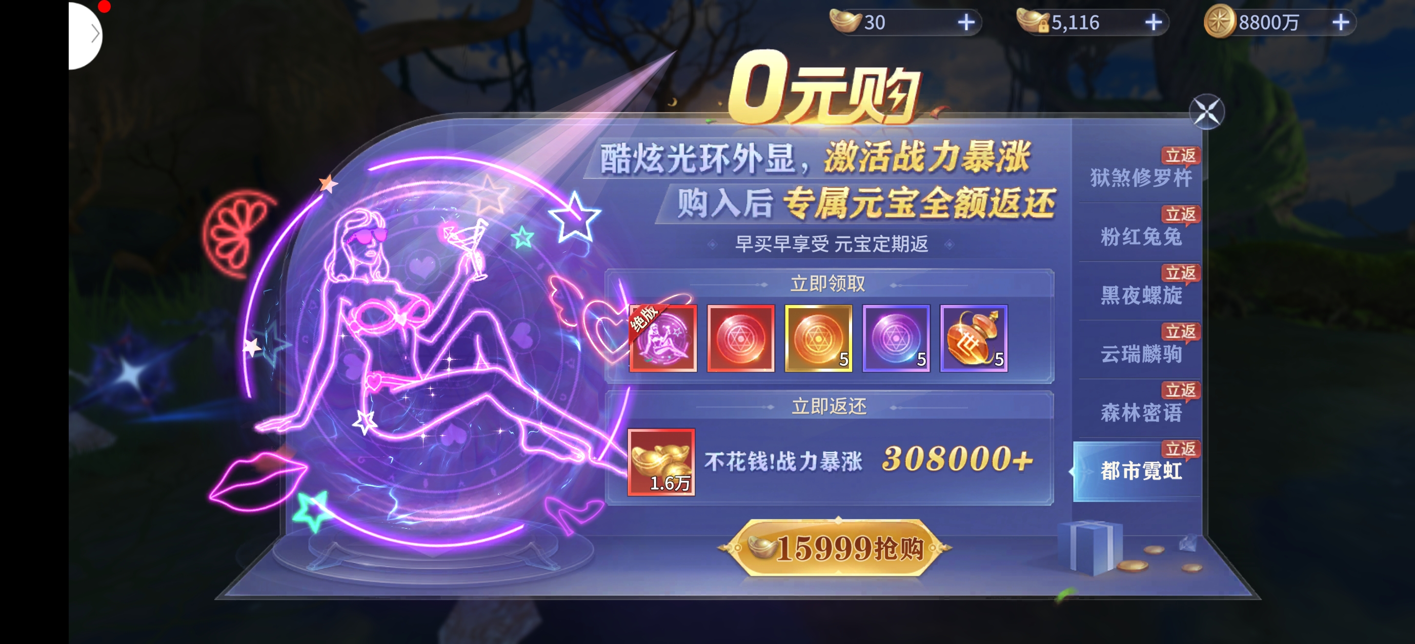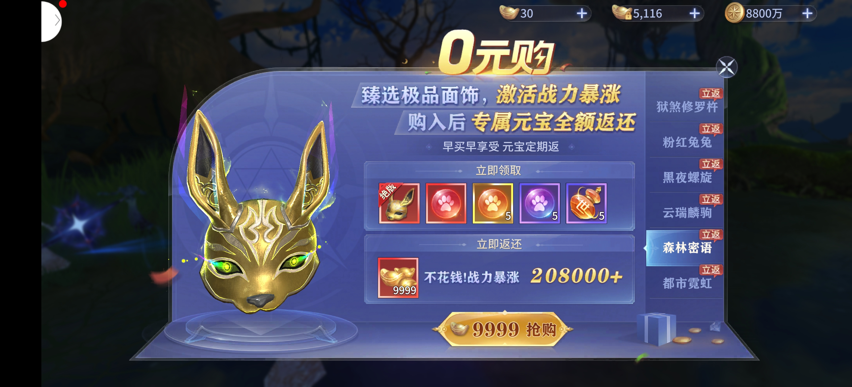 新春齐欢庆,年货大清仓,新春折扣中有6元,68元,128元,328元,648元大礼包,除了648元大礼包之外,都可以限购12次,不仅返还元宝更有很多节日抽奖券,新春直购的抽奖券和新年祈愿的抽奖券是一样的,可以用来抽绝版披风