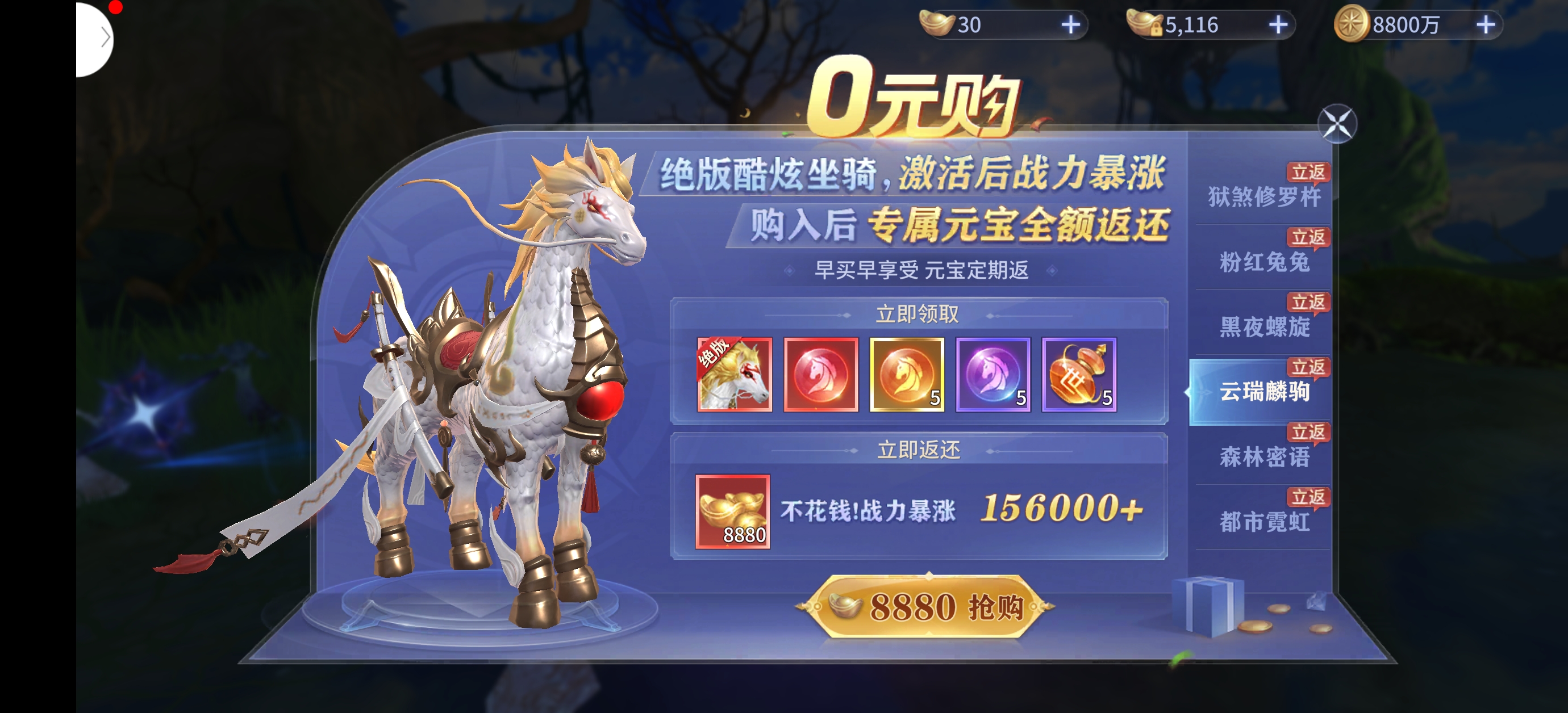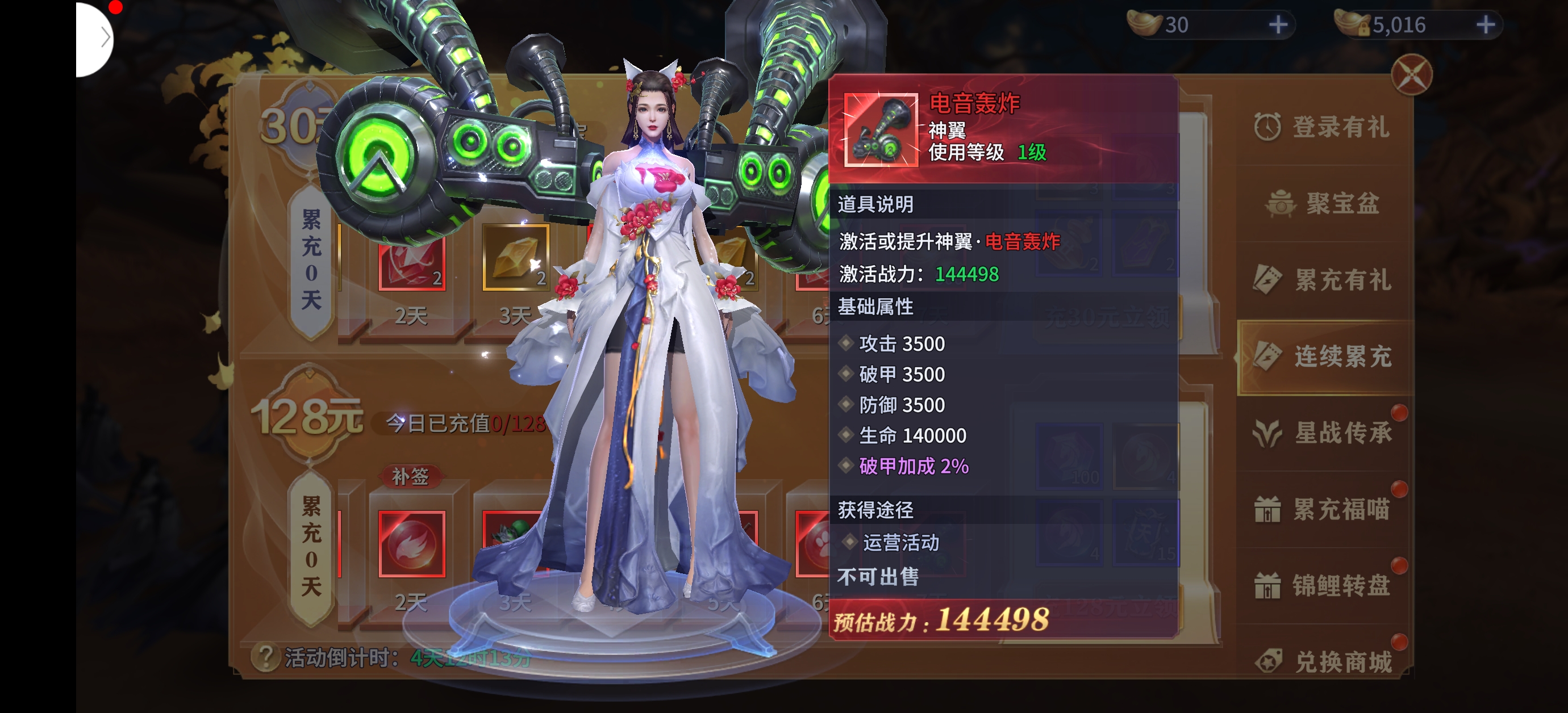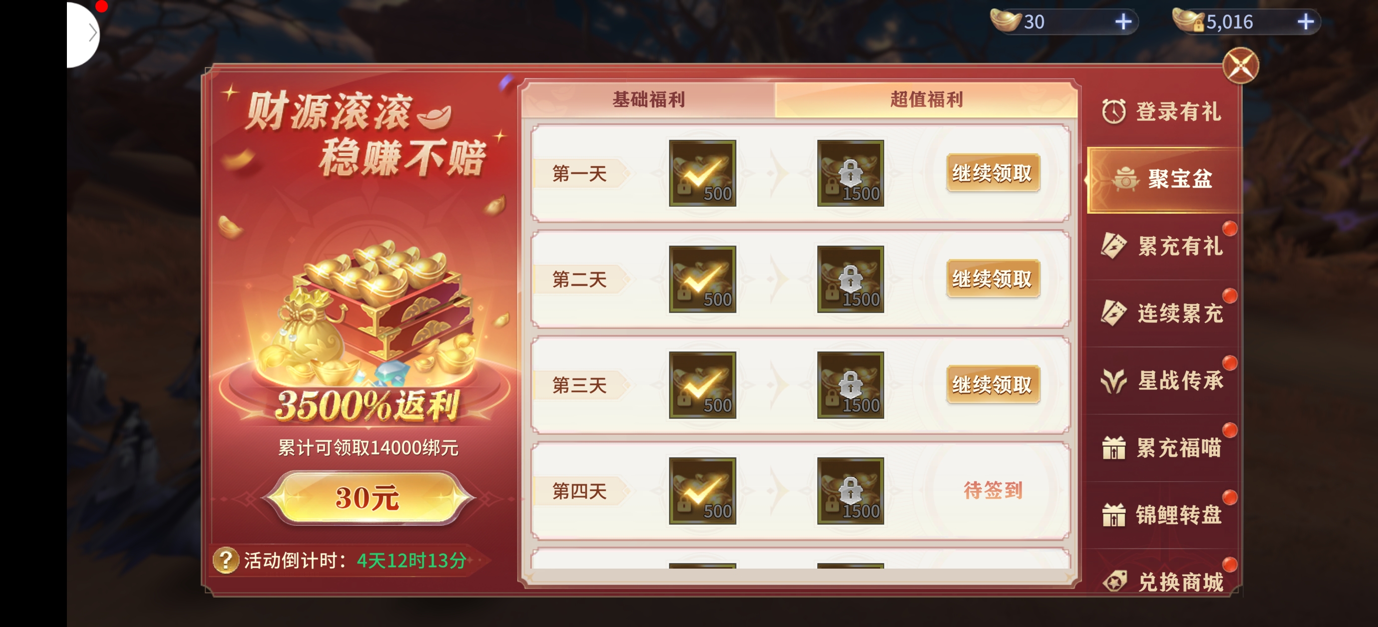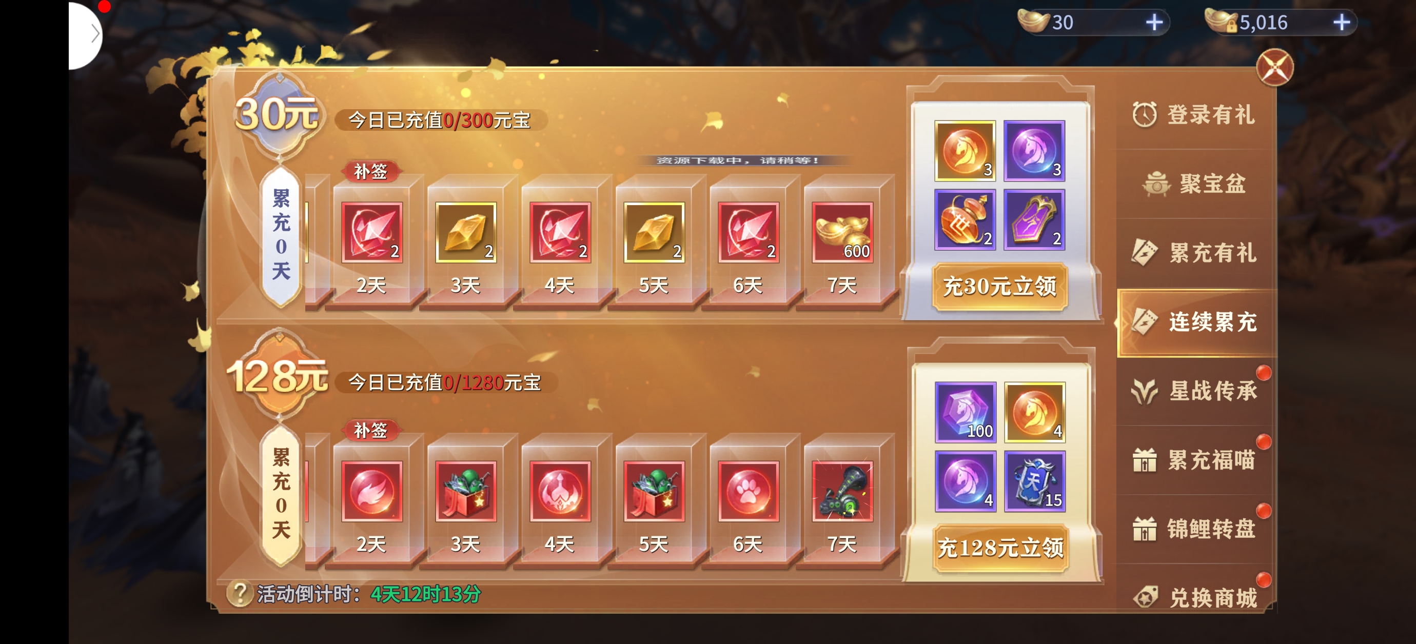 这是一个连充活动,连续四天充值1280就可以获得坐骑任选礼包,里面的坐骑是平时不常见的,若是没有连续充值四天,可以在活动的最后一天消耗元宝进行补签