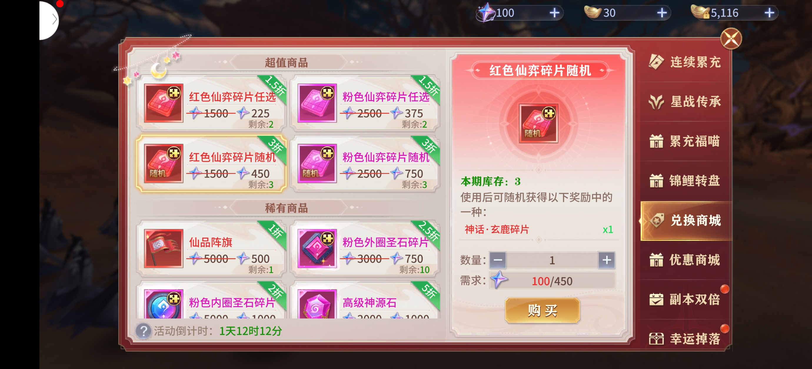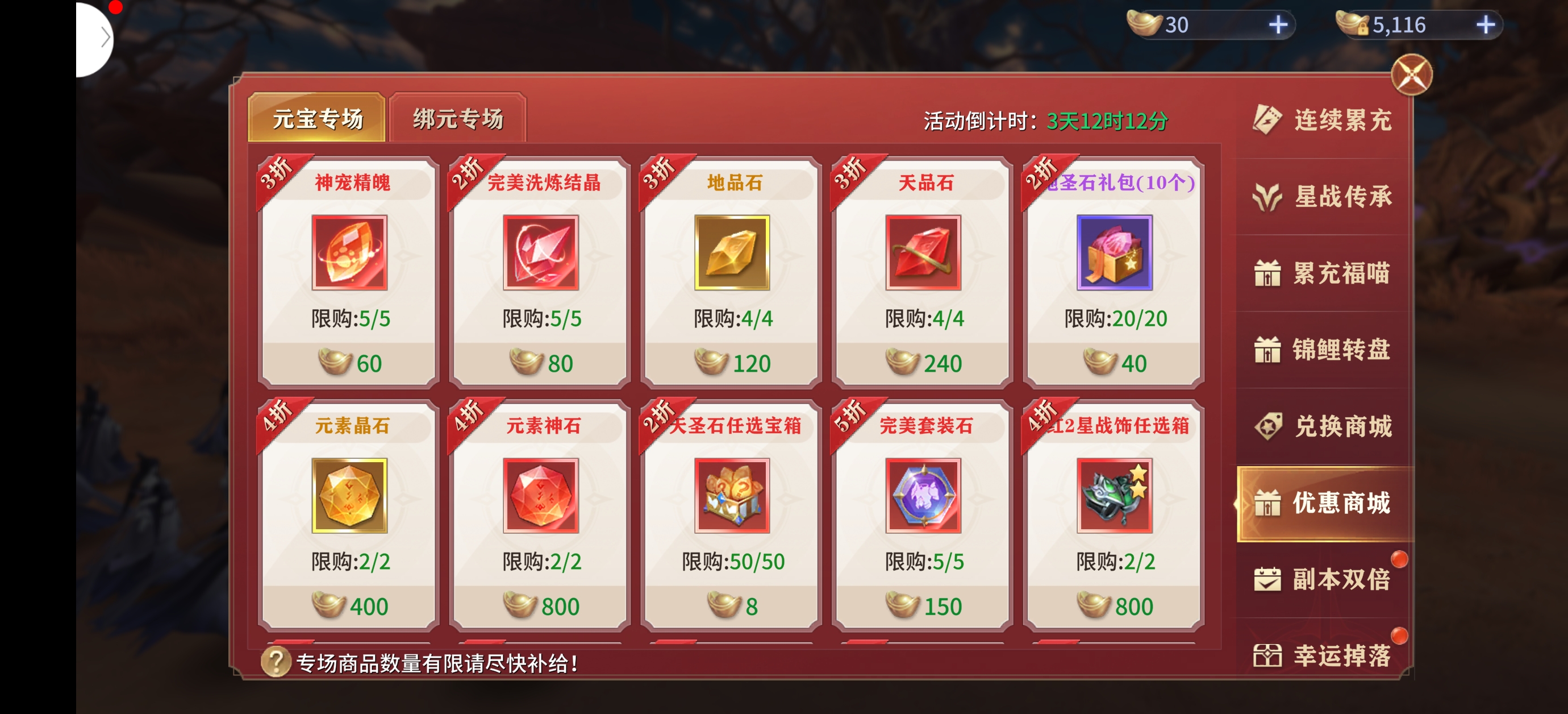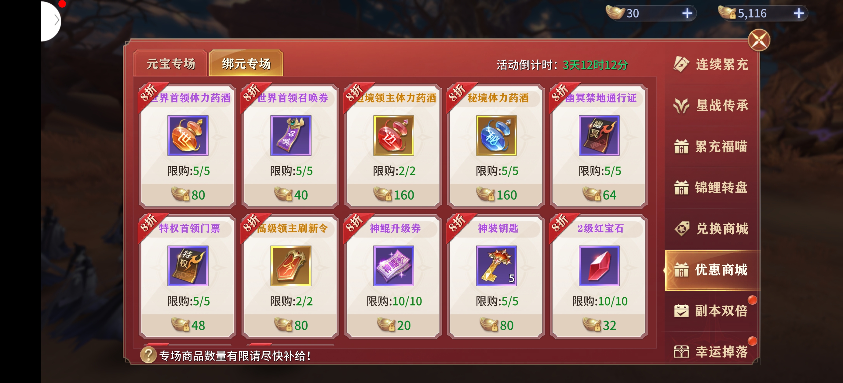 优惠商城又来啦,各种体力药酒,Boss召唤券,幽魂禁地通行证,特权首领门票,还有高级领主刷新令,都比平时在商城直接购买的便宜,而且又是必需品,所以这些都是必买的