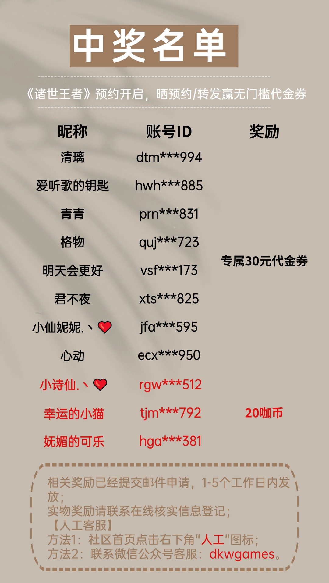 《诸世王者》将于8月20日首发来袭,良心放置日风卡牌,超强阵容自在组合,专属无门槛代金券,免费赠!!现在参与预约活动不仅可以第一时间收到上线消息提前体验,参与活动还有机会获得30元无门槛代金券奖励!只要在本帖下方评论区按要求发送截图,我们将抽取数位咖友送上丰厚的无门槛代金券和咖币等豪礼!【活动时间】即日起-8月25日【参与方式】在本帖评论区分享预约游戏或首发后五星好评截图,即可参与~示例:【活动奖品】精英预约礼:前3位预约咖友赠送30元无门槛代金券奖励!精英集结礼:随机抽3位获得20咖币集结奖励!精英体验礼:随机抽5咖友赠送30元无门槛代金券奖励!(有效参与人数每增加20人集结礼奖励加3份)【温馨提示】1、活动结束后,3个工作日内在原帖公布获奖名单,7个工作日内发放奖励;2、抄袭复制他人图片,不符合活动要求或者违反社区行为规范的回贴,取消获奖资格;3、活动期间到奖励发放完毕前,请咖友们不要更改昵称或删评论,避免奖励发放失败;4、本次活动解释权归《大咖玩》运营团队所有。点击下方游戏图标预约参与吧!↓↓↓↓↓