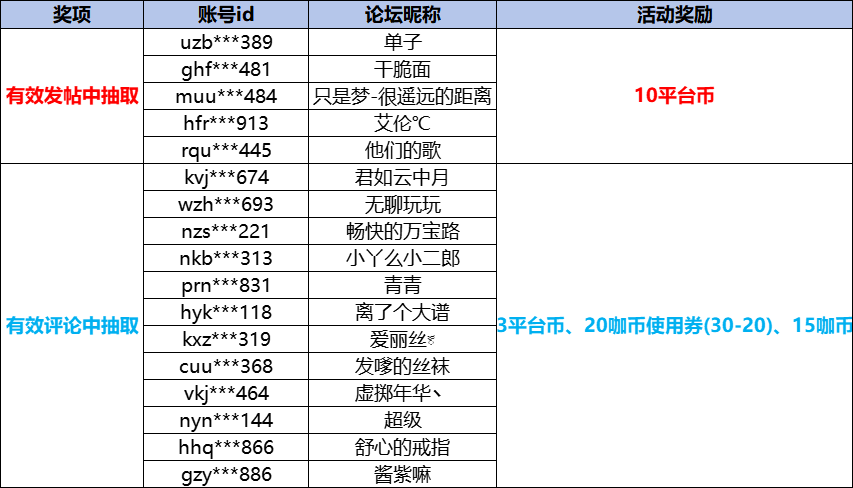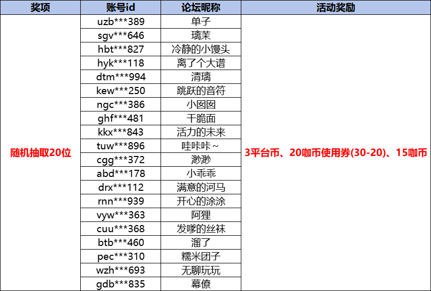 感谢咖友们的积极参与,让我们来看看是谁中奖了~恭喜以上获奖的咖友啦,社区奖励将在7个工作日内发放,获得实物奖励的咖友,请在2025年11月30日前联系客服登记领奖,逾期则无法登记,请及时联系。——分割