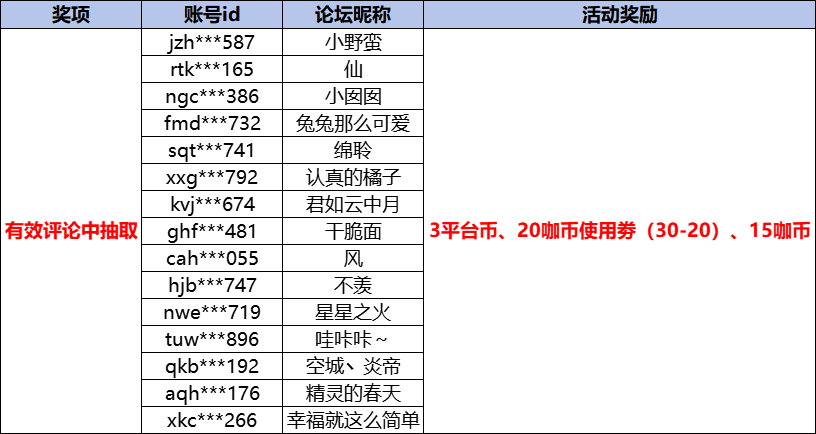 感谢咖友们的积极参与,让我们来看看是谁中奖了~恭喜以上获奖的咖友啦,社区奖励将在7个工作日内发放。——分割线——《悠星大陆》将于11月21日进行付费删档测试,为了更好地了解各位咖友的游戏体验,游戏问题