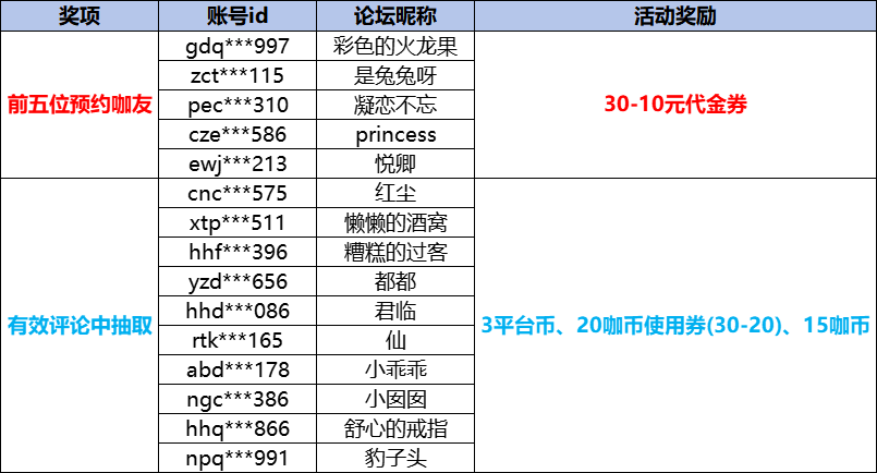 感谢咖友们的积极参与,让我们来看看是谁中奖了~恭喜以上获奖的咖友啦,社区奖励将在7个工作日内发放。——分割线——《魔之序曲》将于1月9日10:00进行首发上线,疯狂福利,进行预约赢福利代金券!现在参与