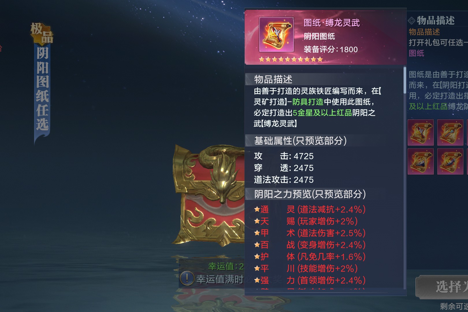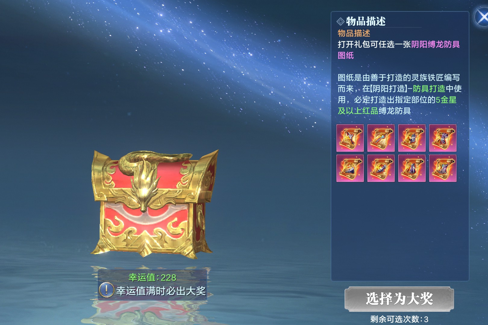 极品阴阳图纸任选宝箱重磅登场,打开即可自选一张阴阳缚龙防具图纸。这些由灵族铁匠编写的秘卷,在阴阳打造中使用,必定能打造出指定部位的5金星及以上红品缚龙防具,如「缚龙灵武」不仅提供4725攻击、2475穿透与道法攻击,更有通灵、天赐、甲术等多重阴阳之力加持,让道法减抗、玩家增伤、技能增伤等属性全面拉满。当前幸运值228,满值必出大奖,剩余可选次数3次,快来解锁这份战力狂飙的机会,在仙途之上尽显王者锋芒!