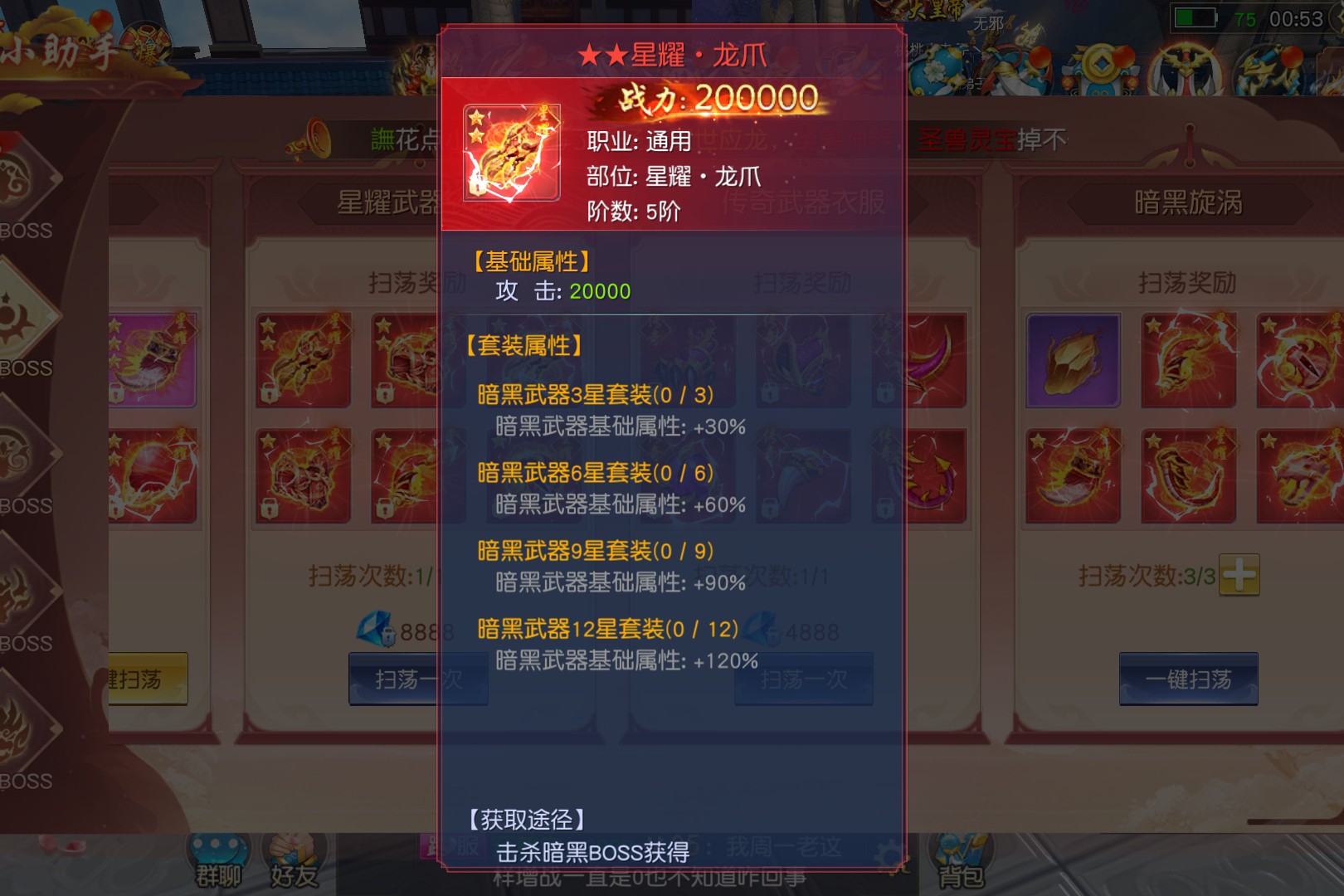 暗黑套装由暗黑龙角、暗黑龙眼等10件装备组成,前五件加暗黑增伤,后五件加暗黑减伤,可通过暗黑寻宝、吞噬和飞升提升。星耀装备通过击杀暗黑BOSS获得并合成高级形态,星级越高战力和基础属性百分比加成越高。传奇装备击杀限时暗黑天使可得,集齐十件套可激活“暗黑增幅”技能,触发暗黑一击后,后续触发概率提升20%,暗黑伤害率增加5%。