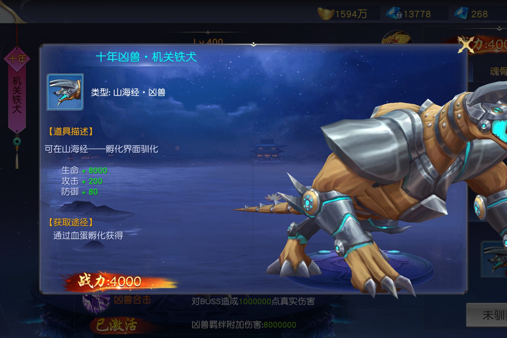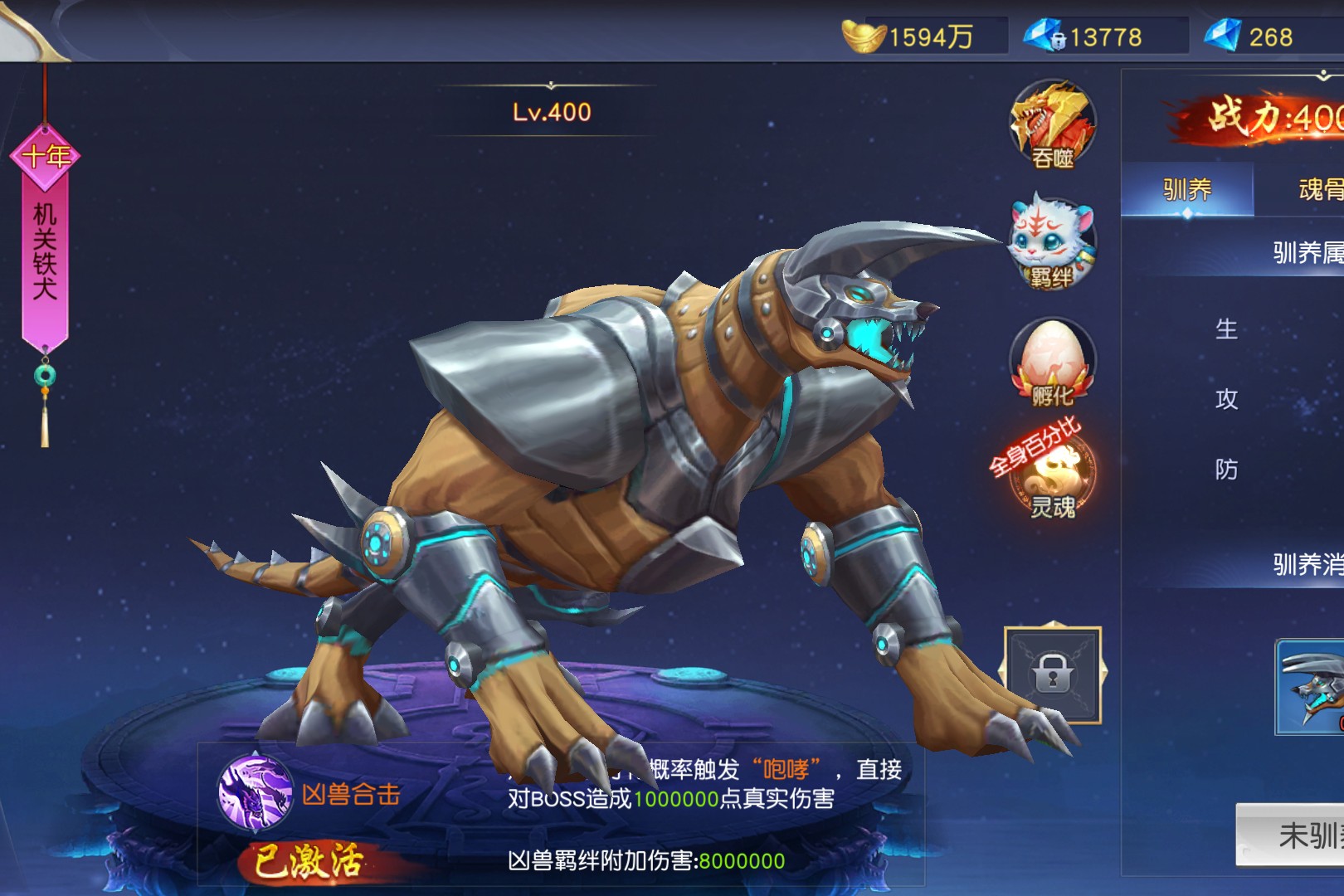 十年凶兽机关铁犬身披精钢战甲寒光凛冽,机械犬齿泛着幽蓝光芒,尽显机关造物的凌厉。驯养后可获得生命+8000、攻击+200、防御+80的属性加成,战力飙升4000。激活凶兽合击技能,角色攻击时概率触发“咆哮”,对BOSS造成1000000点真实伤害,搭配凶兽羁绊更可附加8000000点伤害,是征战仙途、破阵杀敌的可靠伙伴!