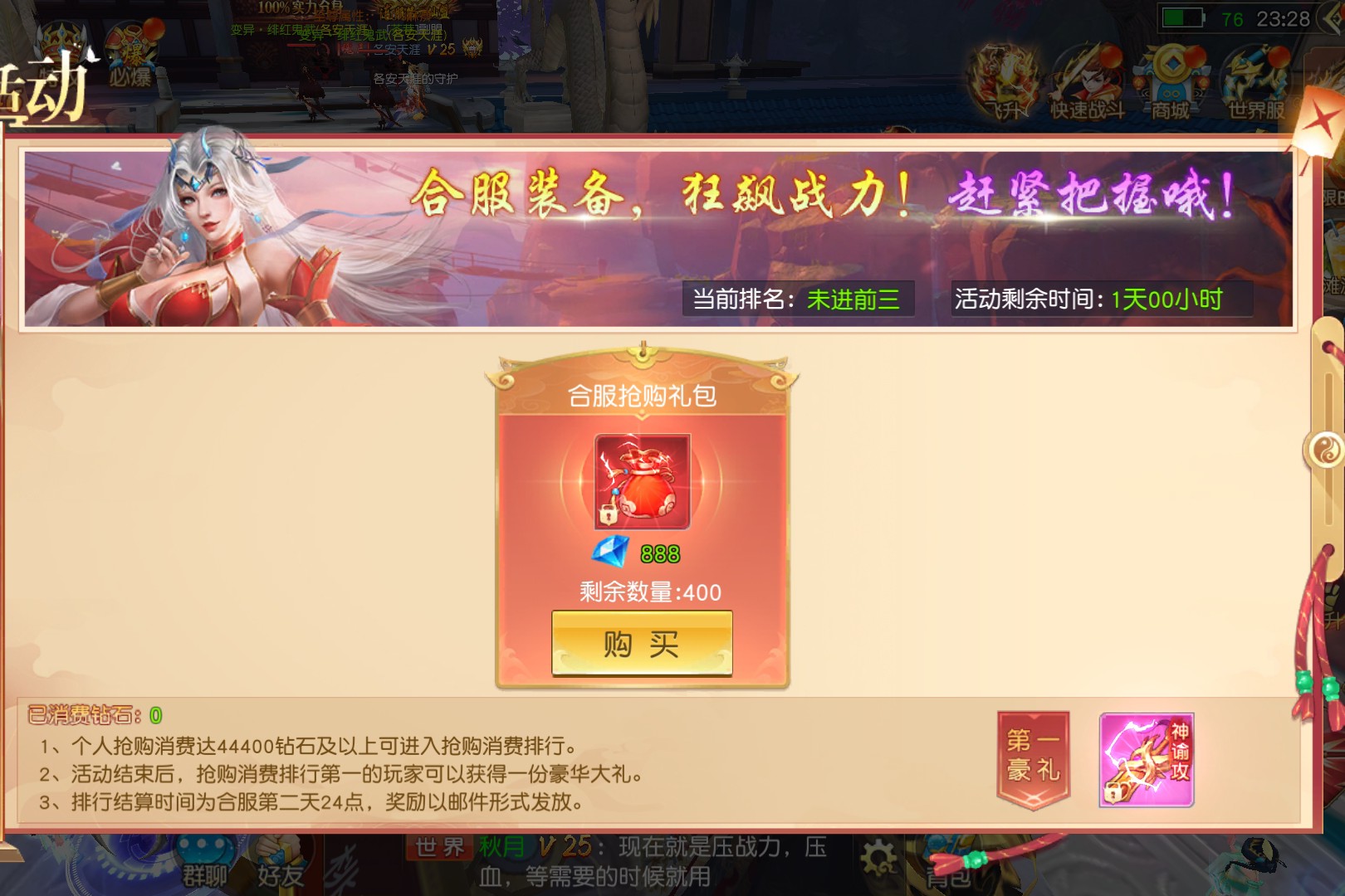 合服装备狂飙战力赶紧把握哦!活动中玩家可购买合服抢购礼包,个人抢购消费达44400钻石及以上可进入抢购消费排行,排行第一的玩家能获得神谕之剑,该装备战力30w,攻击+3w,是提升战力的重要道具。