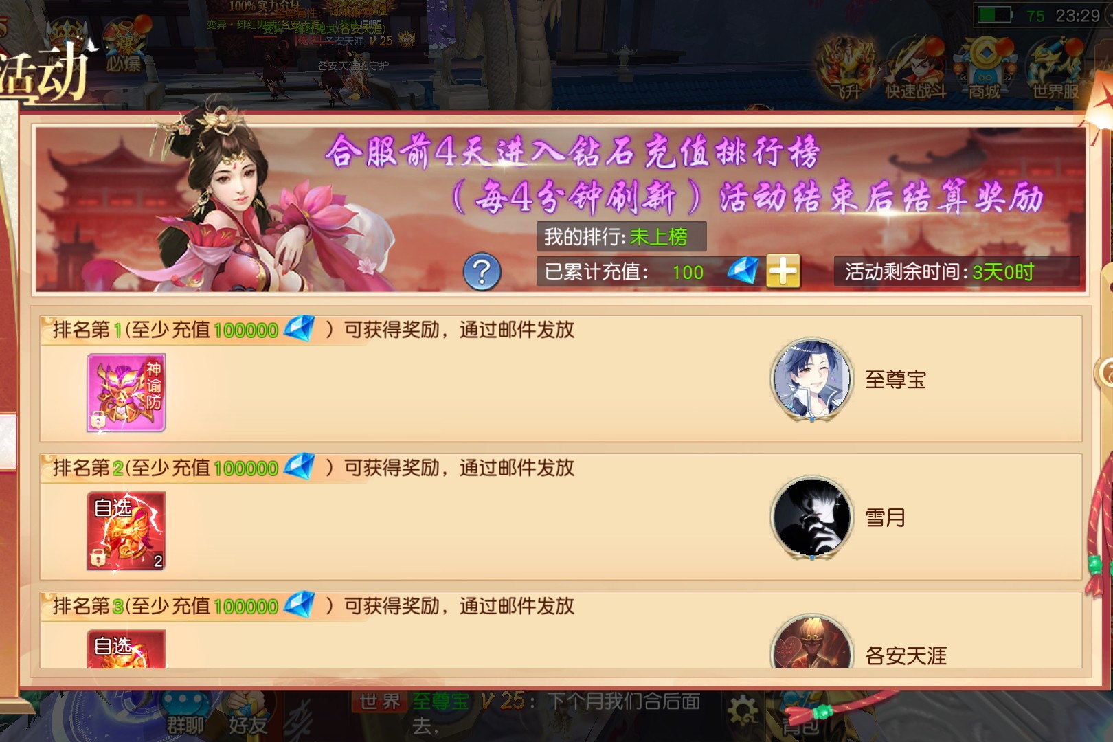 合服前4天参与钻石充值排行榜,每四分钟刷新一次,达到对应充值条件(至少充值10w钻石)可获得神谕系列装备奖励,如神谕之铠、神谕装备自选礼包等,这些装备能大幅提升战力,活动结束后通过邮件发放奖励。