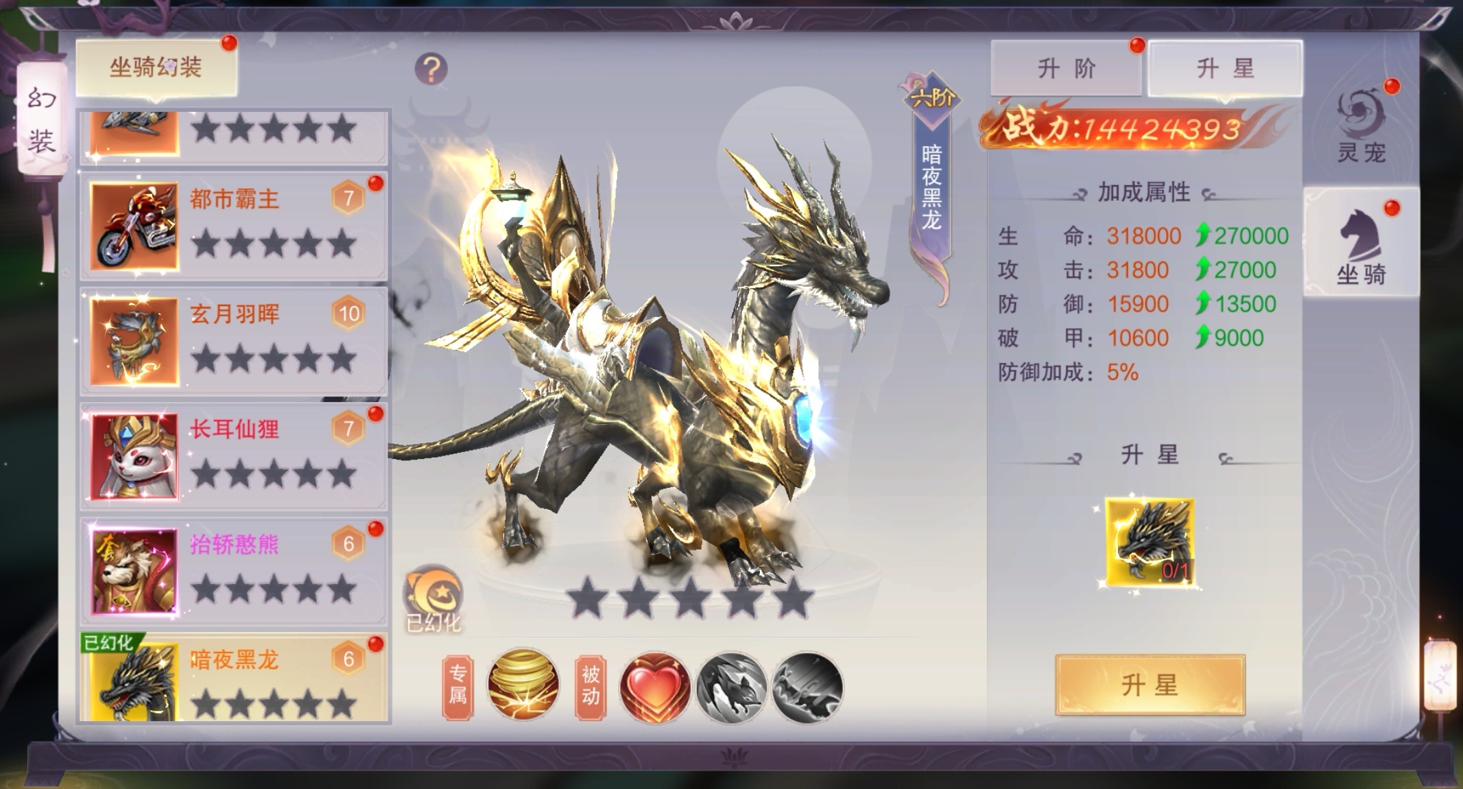 它隶属于坐骑幻装系统,可自由幻化切换,满足不同风格需求。「暗夜黑龙」自带专属技能+三大被动技能,战力加成远超普通坐骑,升阶、升星系统还能持续强化属性,每提升一阶一星都能叠加海量战力,养成上限极高。