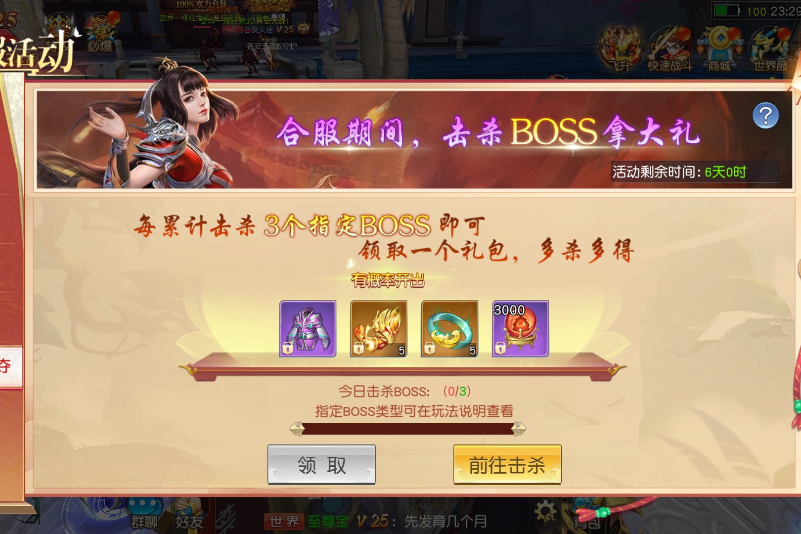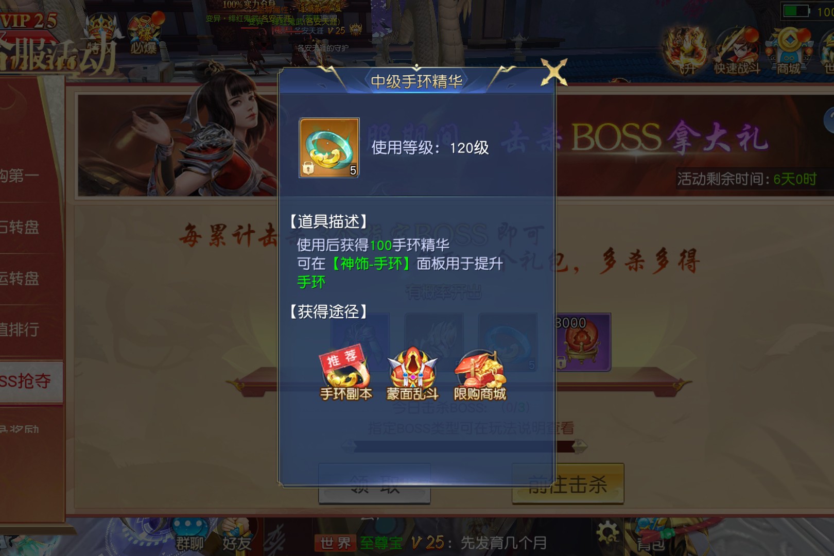 BOSS抢夺活动只有在合服期间开启,玩家每累计击杀3个指定BOSS(神武BOSS、套装BOSS、神魔BOSS、传奇BOSS、圣兽BOSS和转生BOSS),可领取一个珍稀BOSS礼包,礼包有概率开出装备、中级麒麟臂精华(140级使用,用于提升麒麟臂)、中级手环精华(120级使用,用于提升手环)等奖励,击杀数越多可兑换的礼包越多。