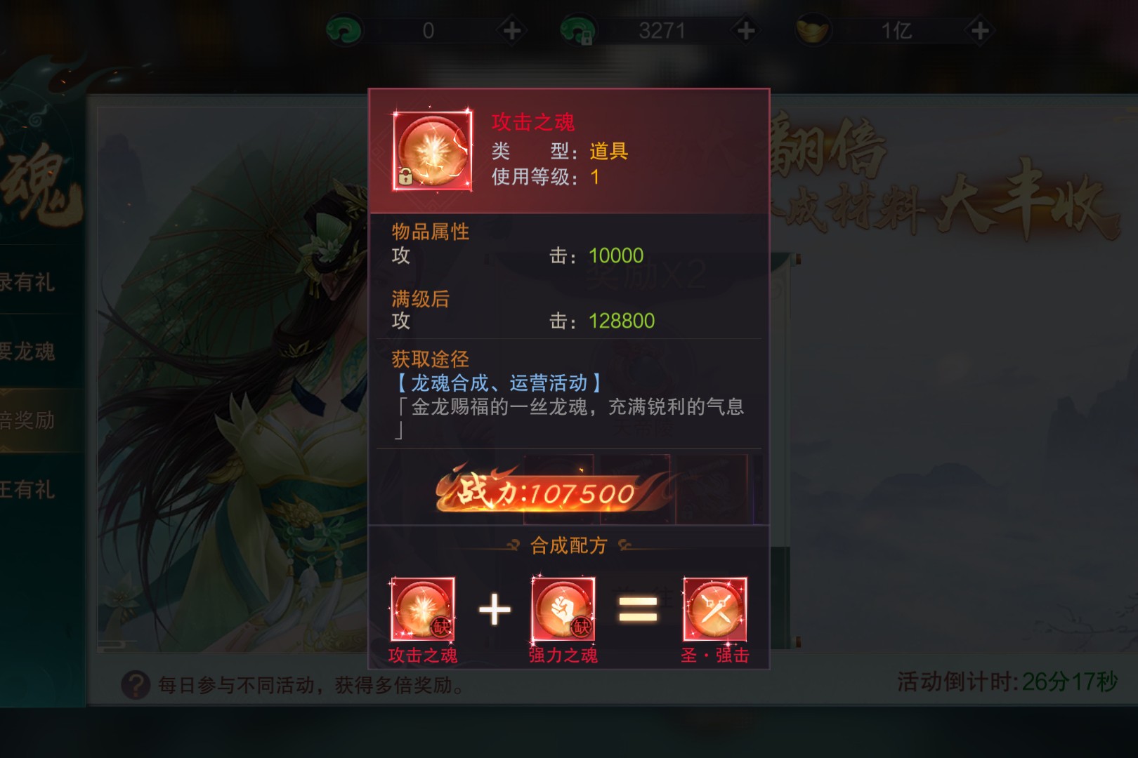 天帝陵翻倍 作者:单子 发布日期:2026年03月24日 08:01 龙魂多倍奖励活动惊喜开启,参与天帝陵等指定日常活动,攻击之魂、仙品藏宝图等奖励掉率翻倍。攻击之魂满暴击属性助力战力飙升,仙品藏宝图可进入仙品秘境,概率获取红、橙、紫色龙魂。 全部评论 1 最新 最热 轻轻吹过的风 2026年03月25日 08:25 0 啊 推荐游戏 查看更多 > 剑雨九天 测测你是什么灵根! 0.1折 仙侠 挂机 梦幻甬城 魔幻界已疯,神器跟不要钱一样乱爆! 魔幻 挂机 吞噬星空:黎明 吞噬星空正版!与罗峰重返原始星! 魔幻 挂机 荣耀文明-3.5折 全英雄免费得!决战世界多文明! 三国 策略 逍遥志 高福利魔幻送返利卷!坐骑免费领 魔幻 挂机 铁血荣耀-0.1折 0.1折超爽热血打金复古版 0.1折 魔幻 今日热榜