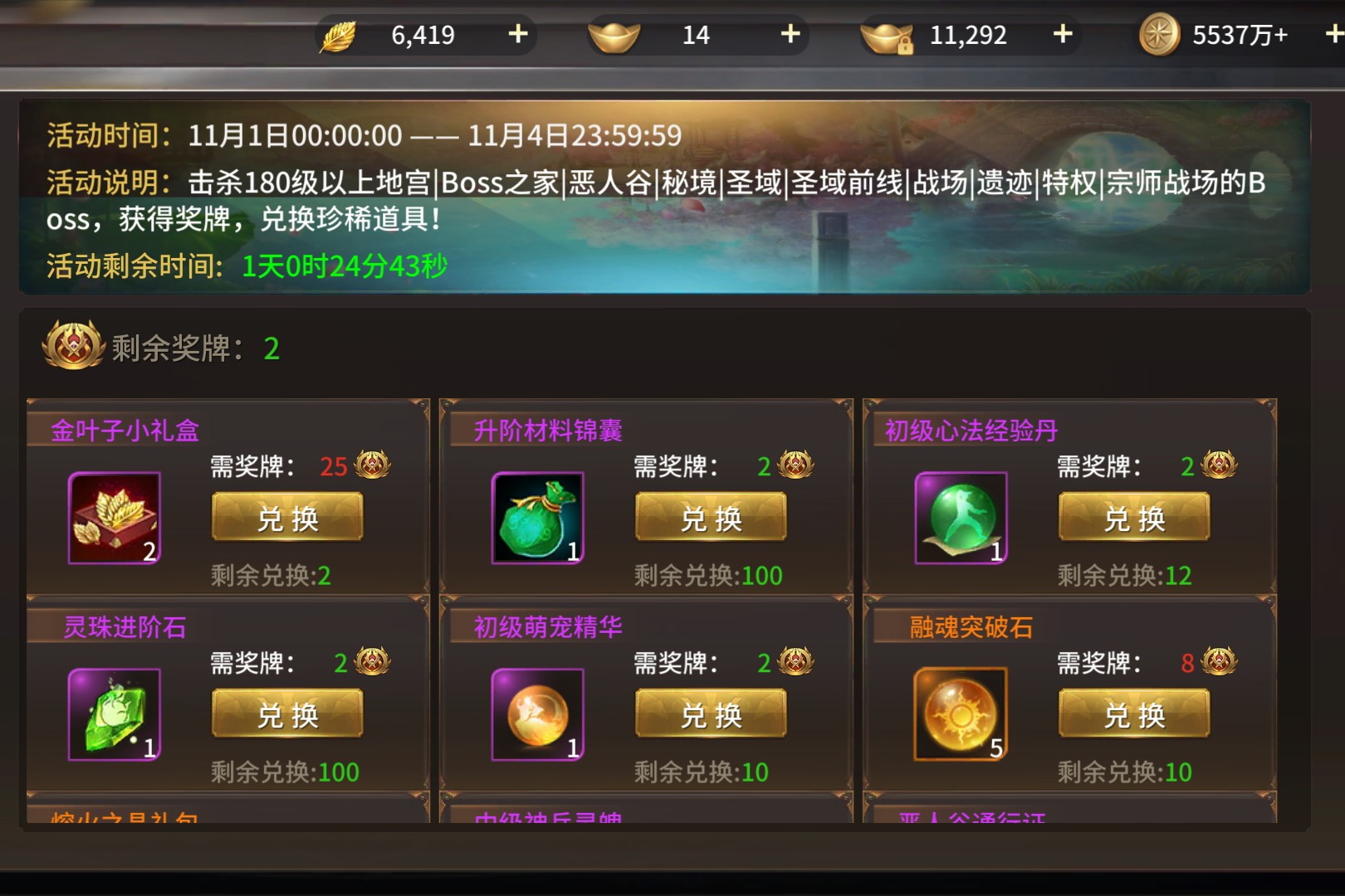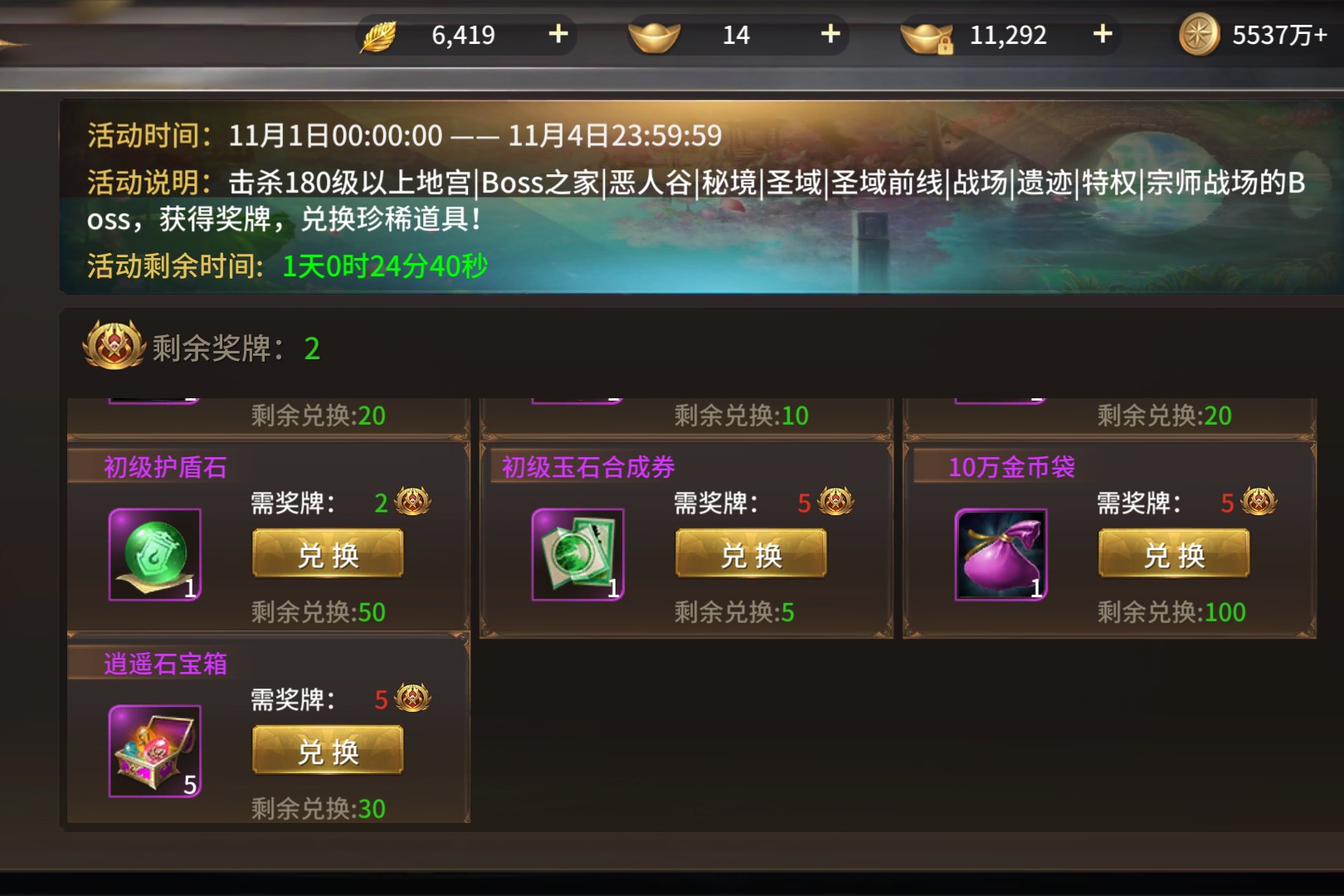 180级以上地图的Boss掉落奖牌即将失效当前剩余2枚奖牌,兑换界面里的道具正等着被认领,列表中奖励升阶材料锦囊、初级心法经验丹、灵珠进阶石都只要2枚奖牌,是眼下最适配的选择。10万金币袋和逍遥石宝箱虽诱人,但5枚的门槛暂时够不上。金叶子礼盒要25枚,显然是留给多刷Boss的玩家的“大奖”。活动覆盖地宫、Boss之家等十余张高等级地图,击杀Boss攒牌的机制,让肝帝能换珍稀道具,休闲玩家也能薅到基础资源。现在剩余时间不多,手里这2枚牌换个升阶材料,至少不浪费辛苦刷到的奖励。