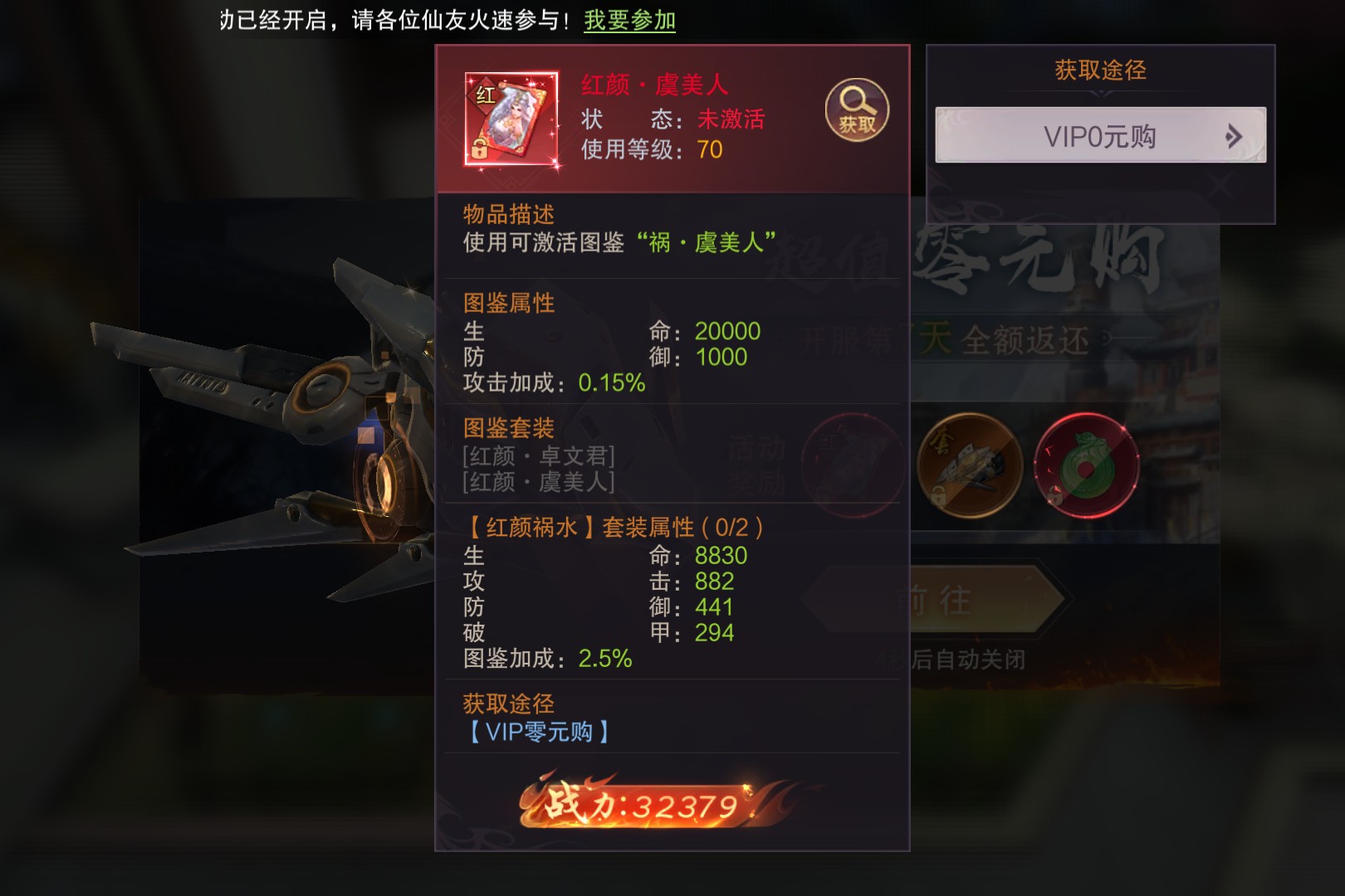 超值零元购绝对是仙友们不容错过的福利狂欢!开服第7天参与,不仅能把机械感拉满的银白鎏金飞行器收入囊中,还能解锁“红颜·虞美人”图鉴,更有仙玉这种修真界硬通货到手,那飞行器科幻感十足,银白机身配金色细节,在仙域驰骋时绝对吸睛;“红颜·虞美人”图鉴能为你加20000生命值、1000防御还有攻击加成,集齐套装更是战力暴涨