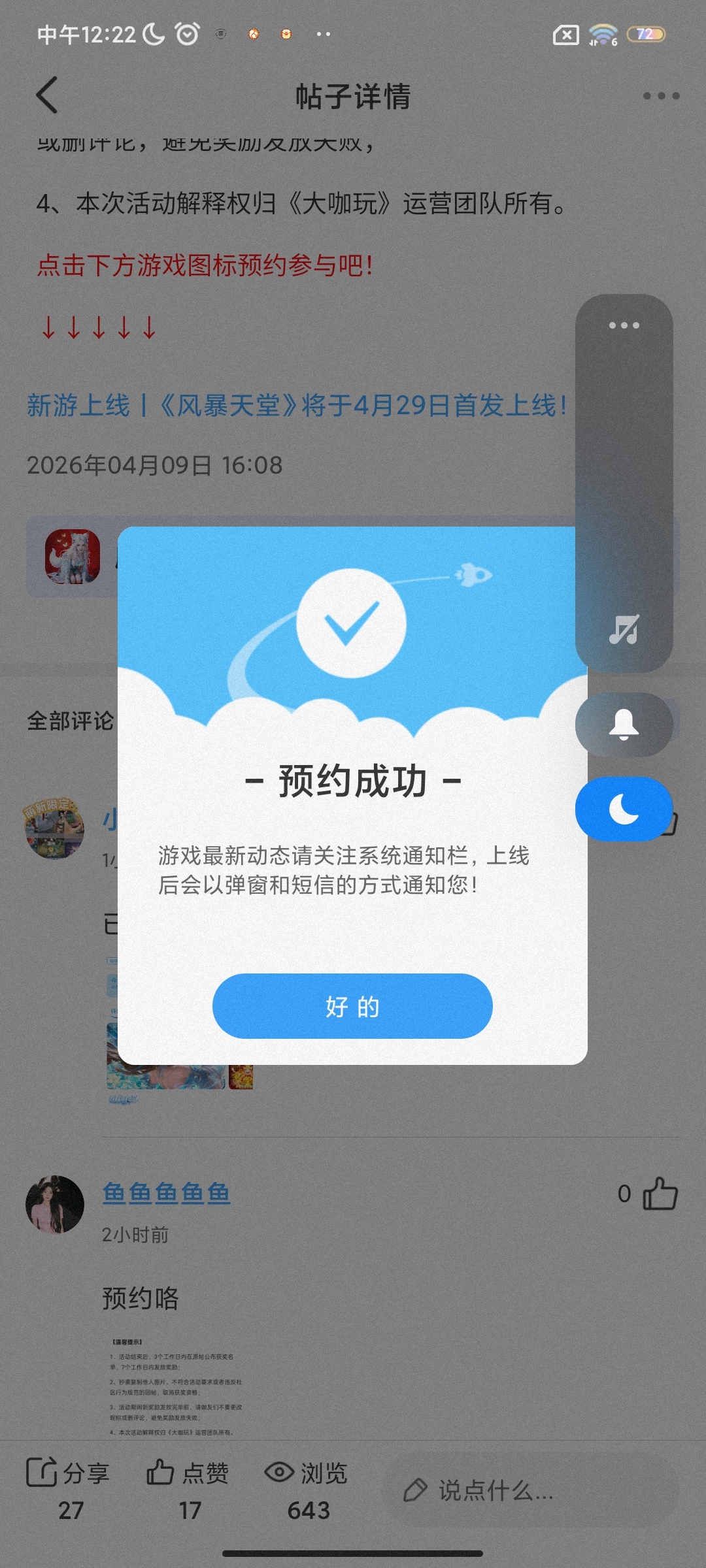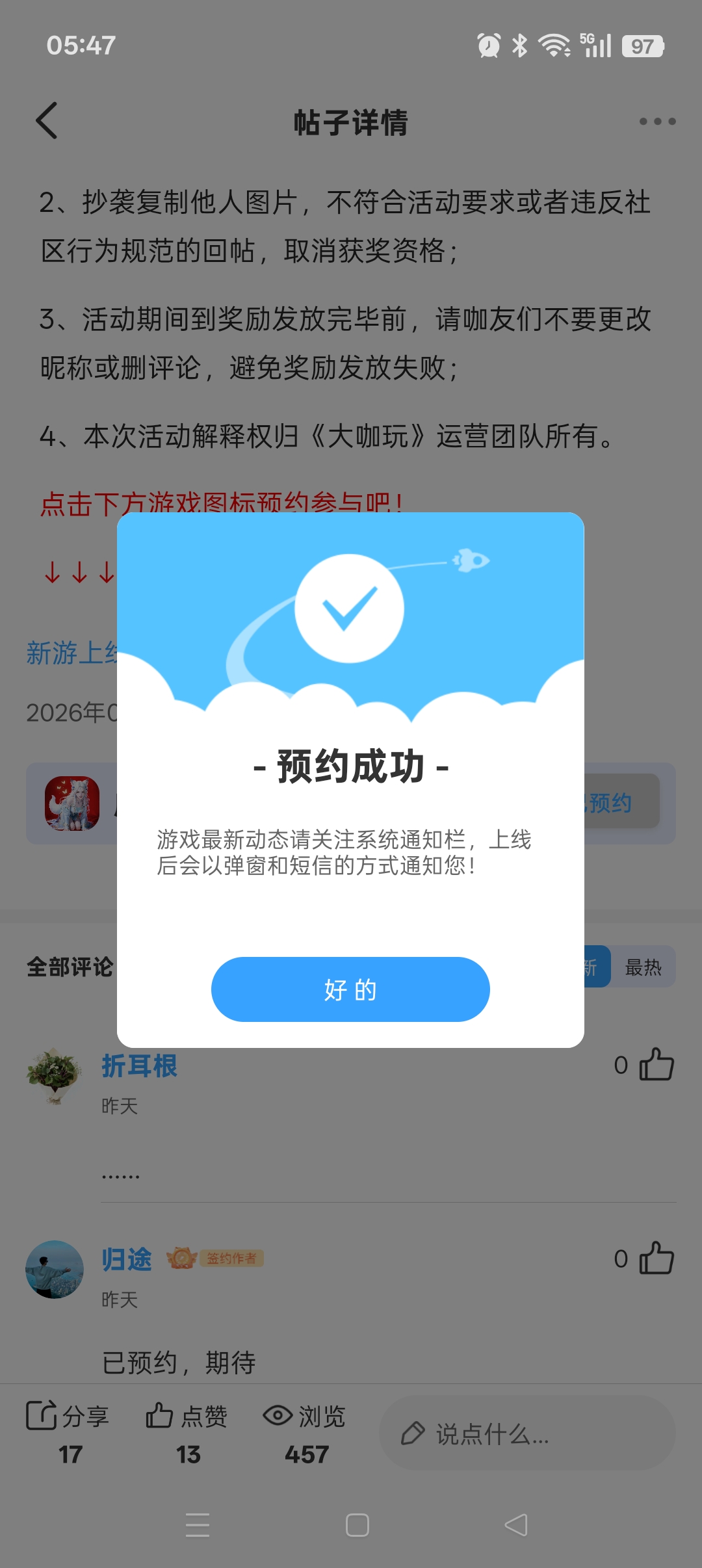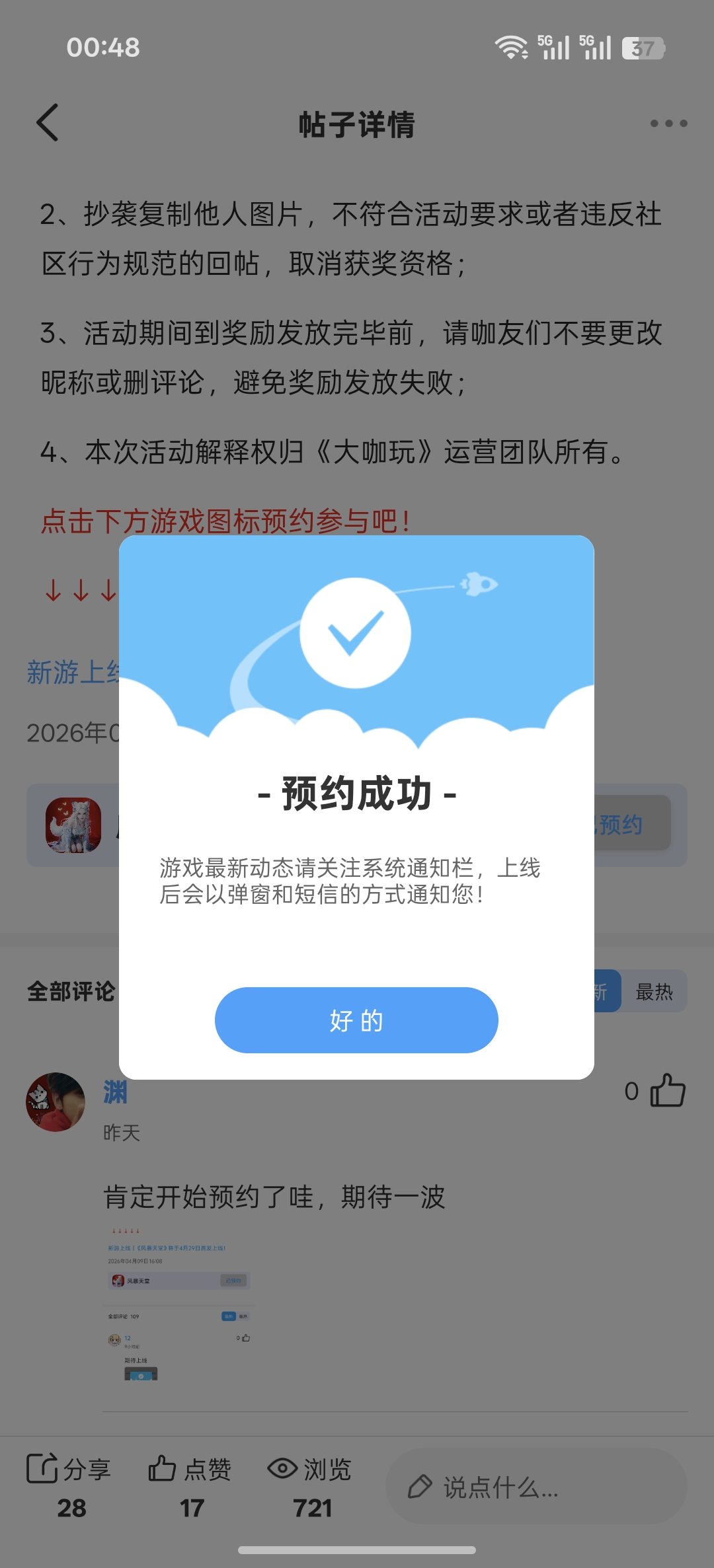在本帖评论区分享预约游戏或首发后体验游戏截图或五星好评截图、评论,即可参与~