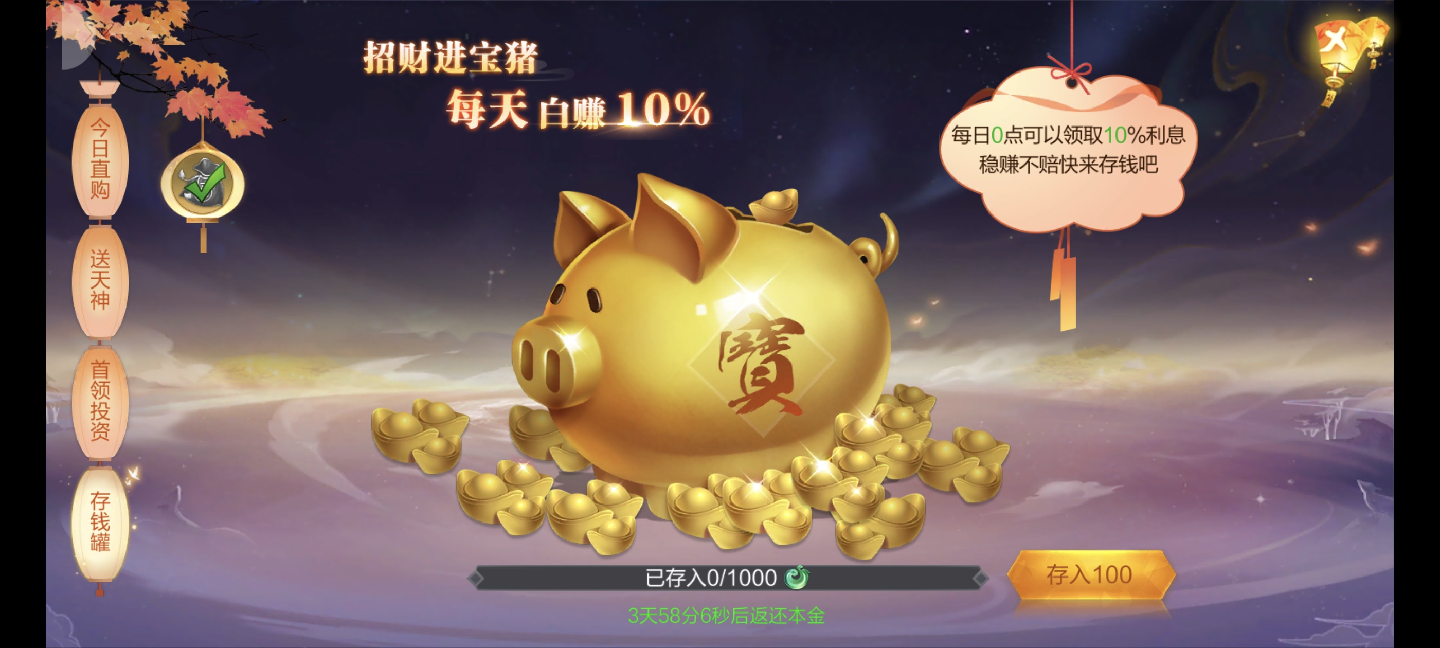 招财进宝猪~ 作者:小丫么小二郎 发布日期:2026年04月09日 19:42 游戏里也可以存玉了😂😂😂招财进宝猪🐷活存入非绑玉每天有10%利息收入~存入一千非绑玉~每天半夜12点就可以领取100玉,连领四天,也就是400四天后返还本金~与银行存储差不多了~绝对的稳赚不赔~感兴趣的小伙伴可以试一下~本金利息四天全返还~ 全部评论 1 最新 最热 懦弱的书本 2026年04月20日 20:02 0 赞赞赞 推荐游戏 查看更多 > 吞噬星空:黎明 吞噬星空正版!与罗峰重返原始星! 魔幻 挂机 荣耀文明-3.5折 全英雄免费得!决战世界多文明! 三国 策略 梦幻甬城 魔幻界已疯,神器跟不要钱一样乱爆! 魔幻 挂机 铁血荣耀-0.1折 0.1折超爽热血打金复古版 0.1折 魔幻 剑雨九天 测测你是什么灵根! 0.1折 仙侠 挂机 逍遥志 高福利魔幻送返利卷!坐骑免费领 魔幻 挂机 今日热榜