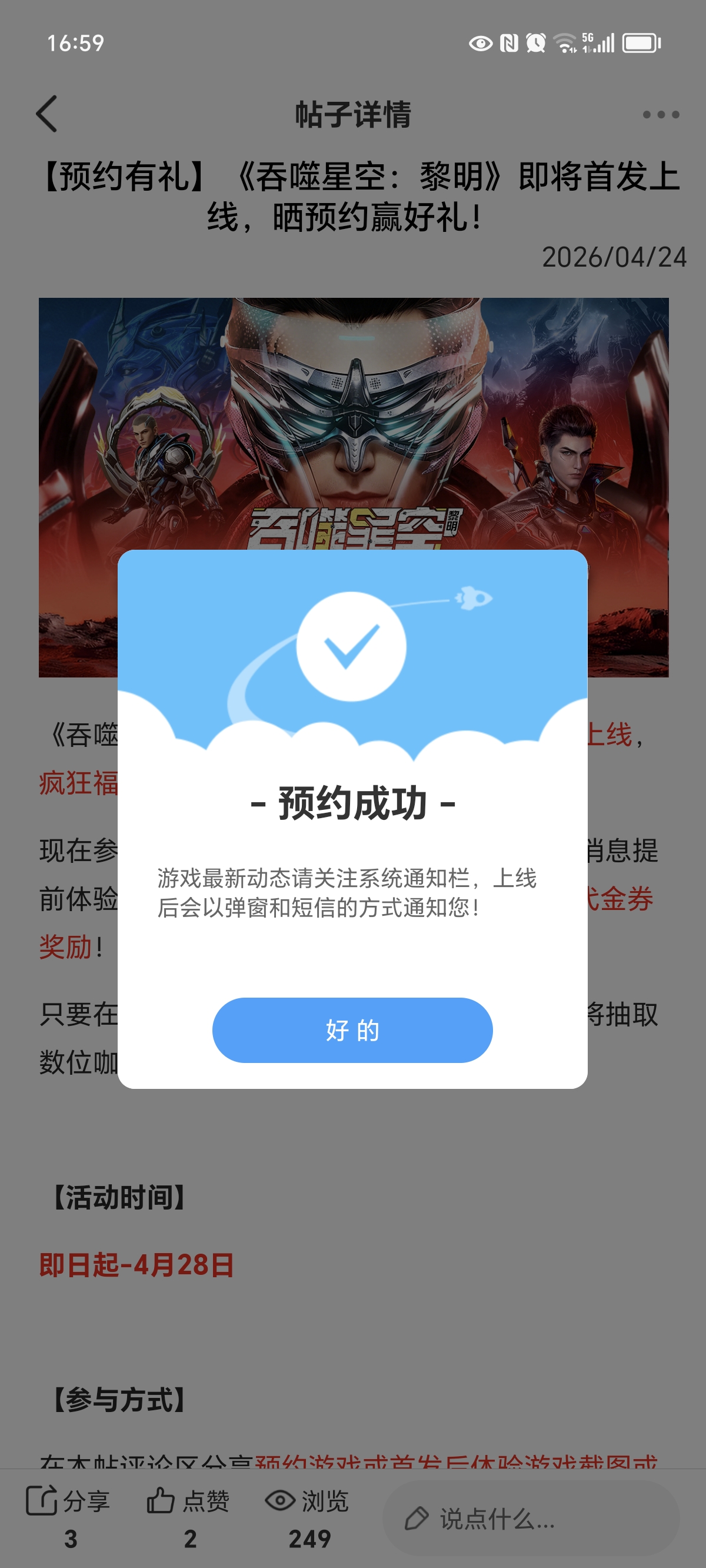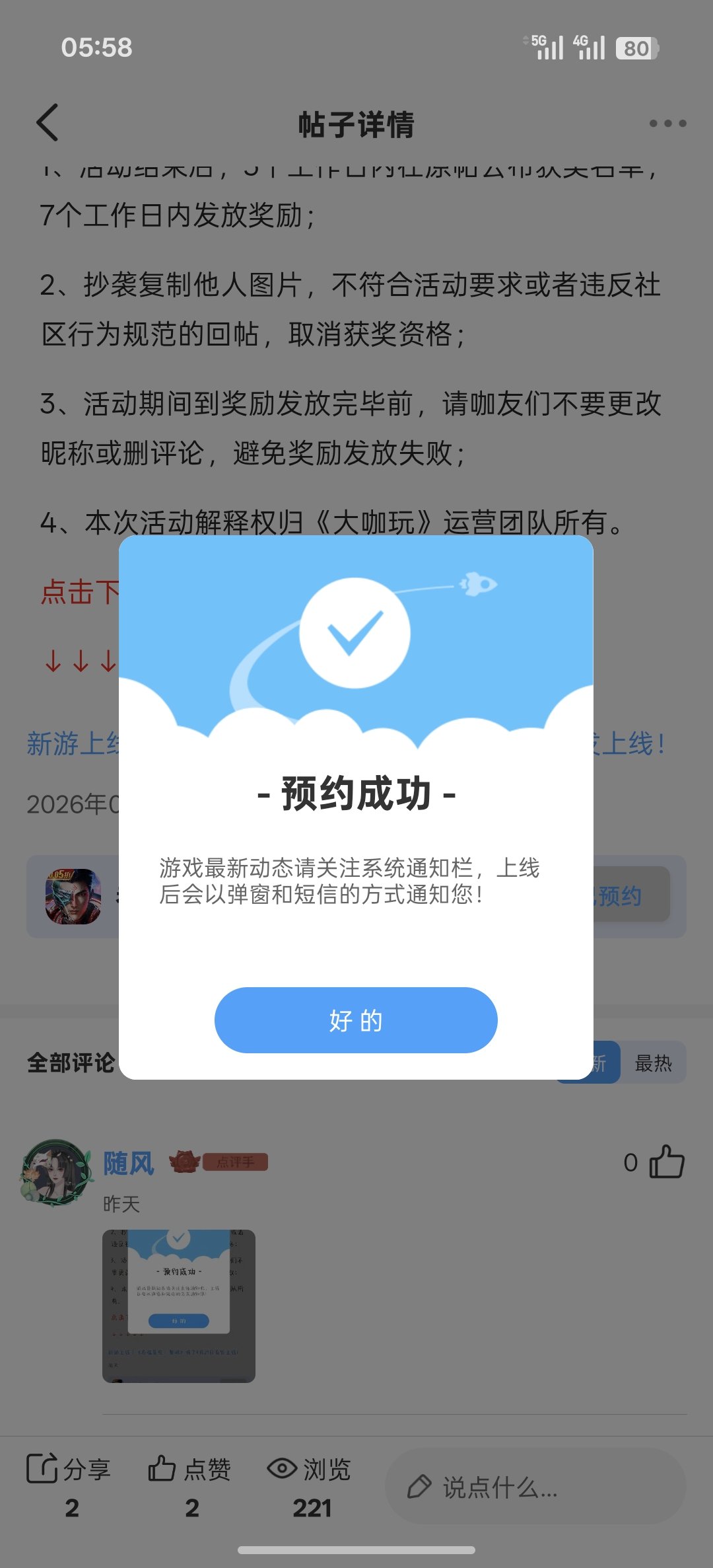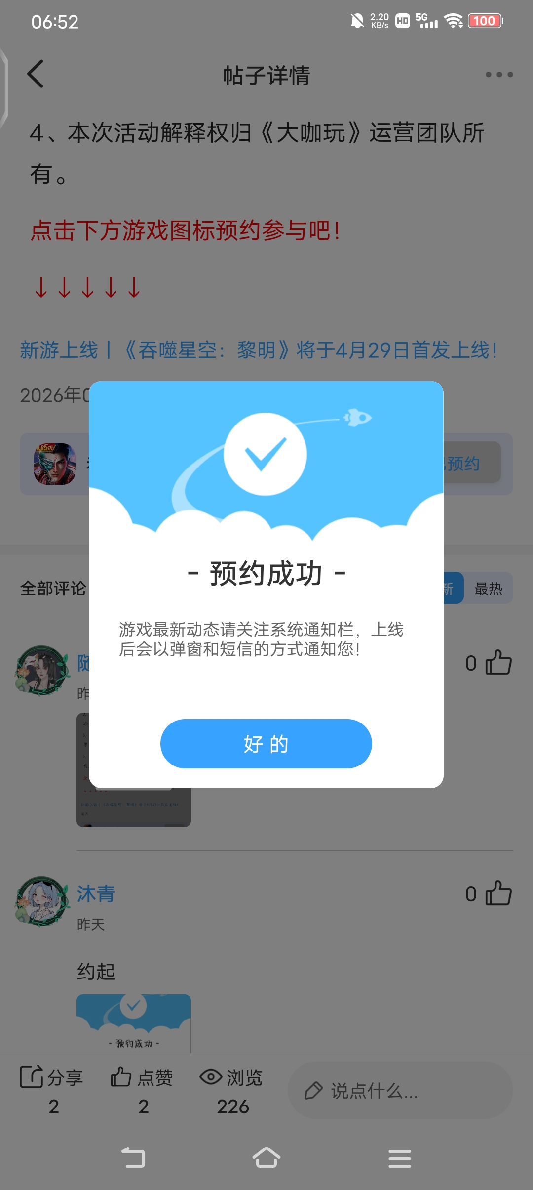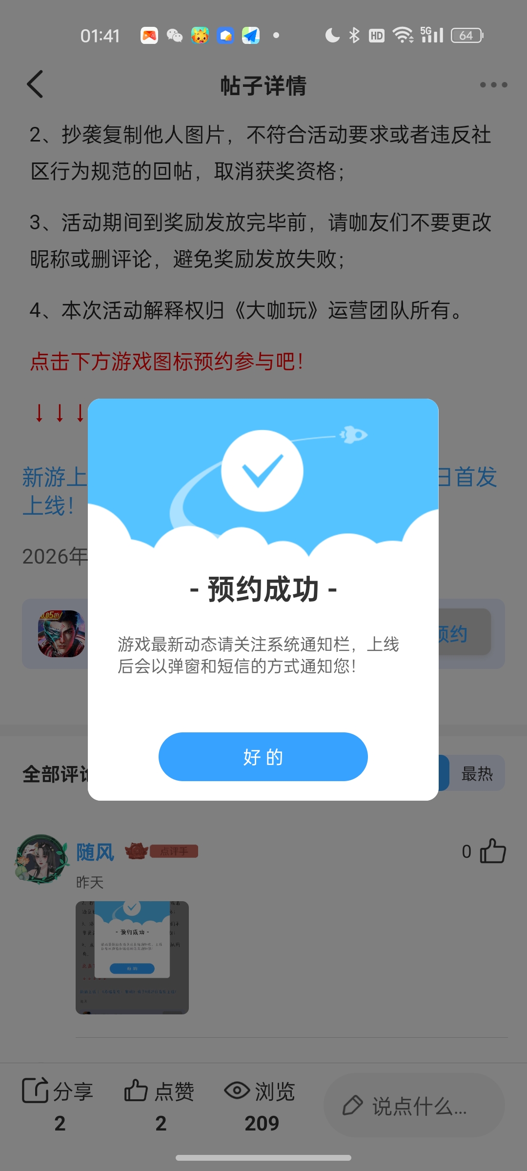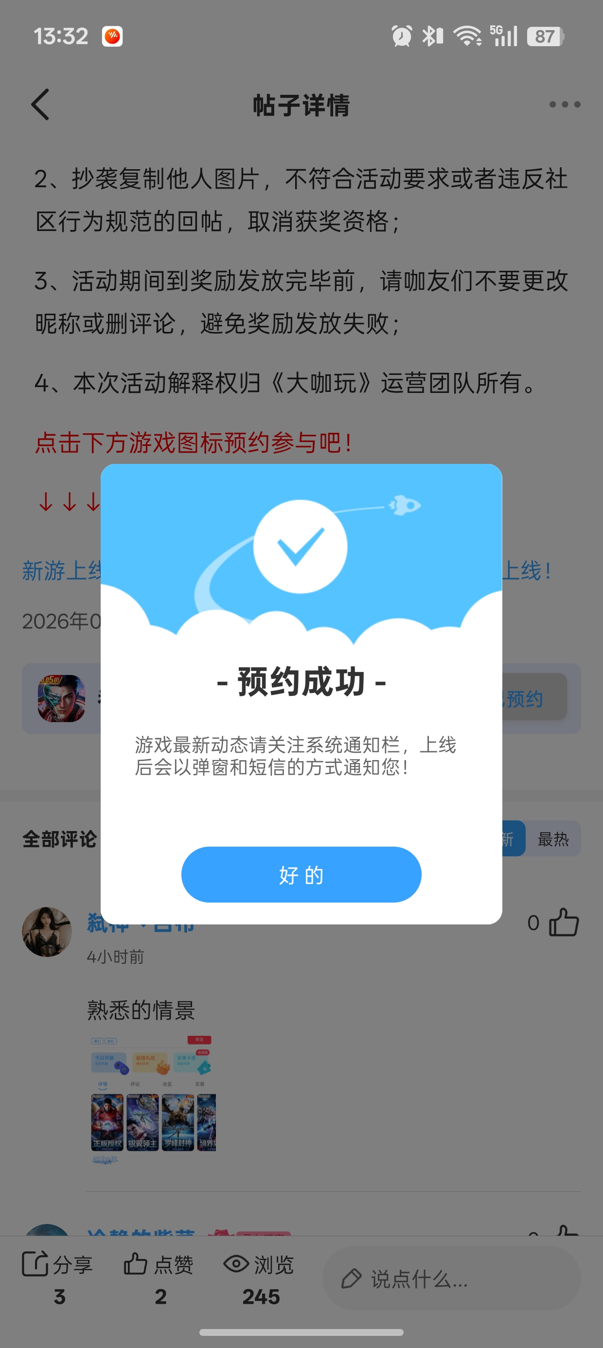 在本帖评论区分享预约游戏或首发后体验游戏截图或五星好评截图、评论,即可参与~