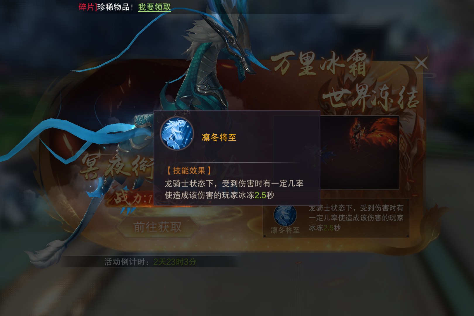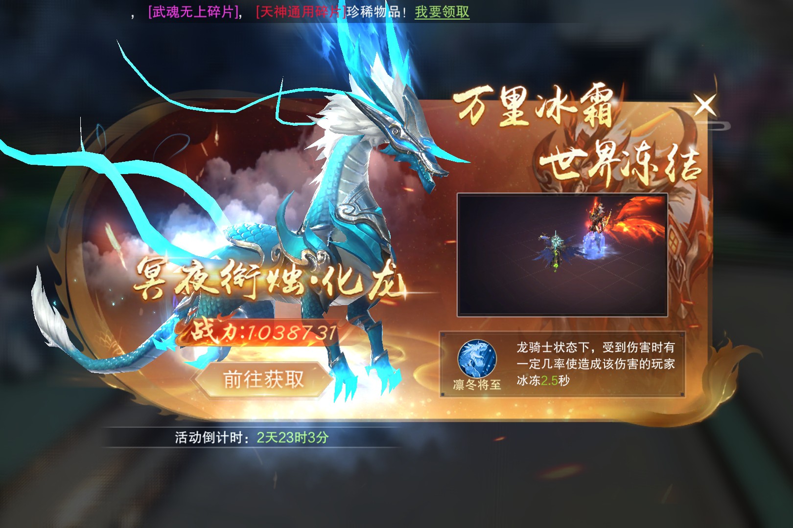 一条身披蓝白战甲的巨龙横空出世它就是冥夜衔烛·化龙,战力高达1038731,单凭这数字便足以让仙域众生侧目。它的技能凛冬将至更是霸道绝伦,在龙骑士状态下,受到伤害时有一定几率让攻击者冰冻2.5秒,万里冰霜,世界冻结。