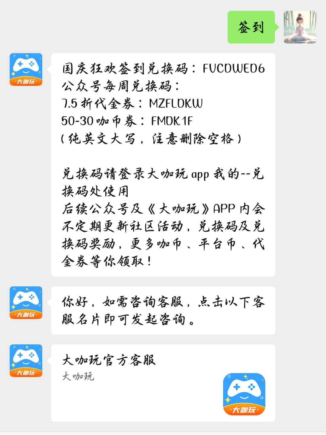 领取方式:微信扫码关注或微信搜索:[[大咖玩]]→关注公众号→发消息(大咖签到)→复制兑换码→打开大咖玩APP兑换!