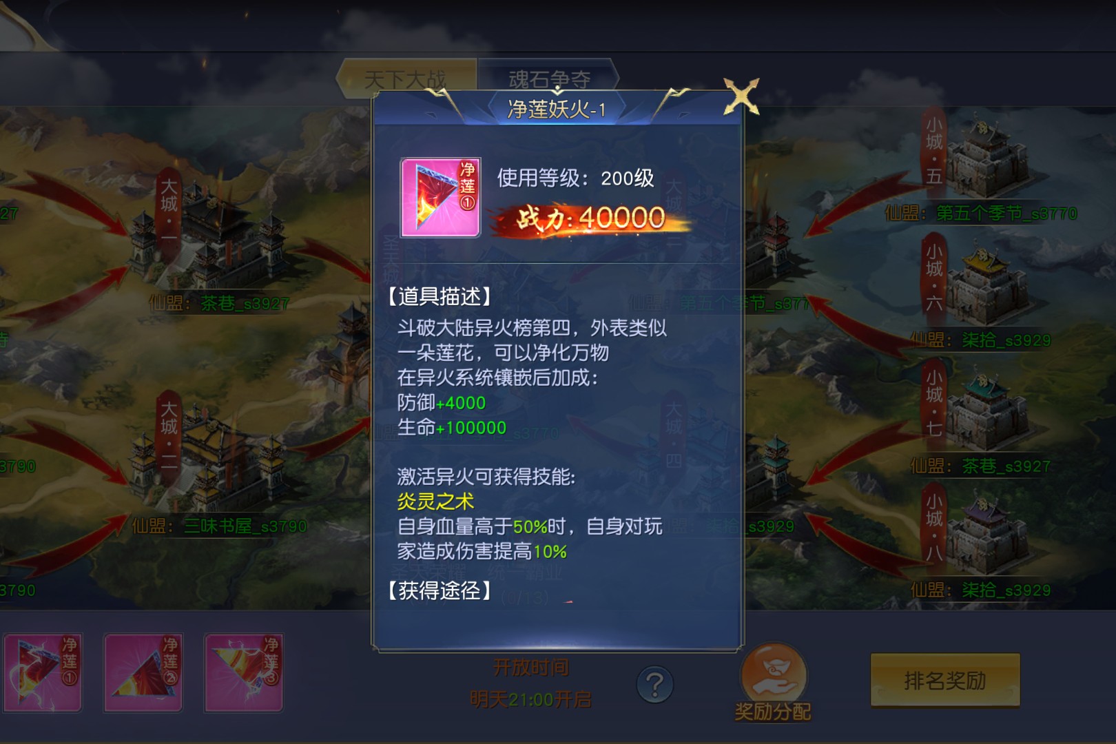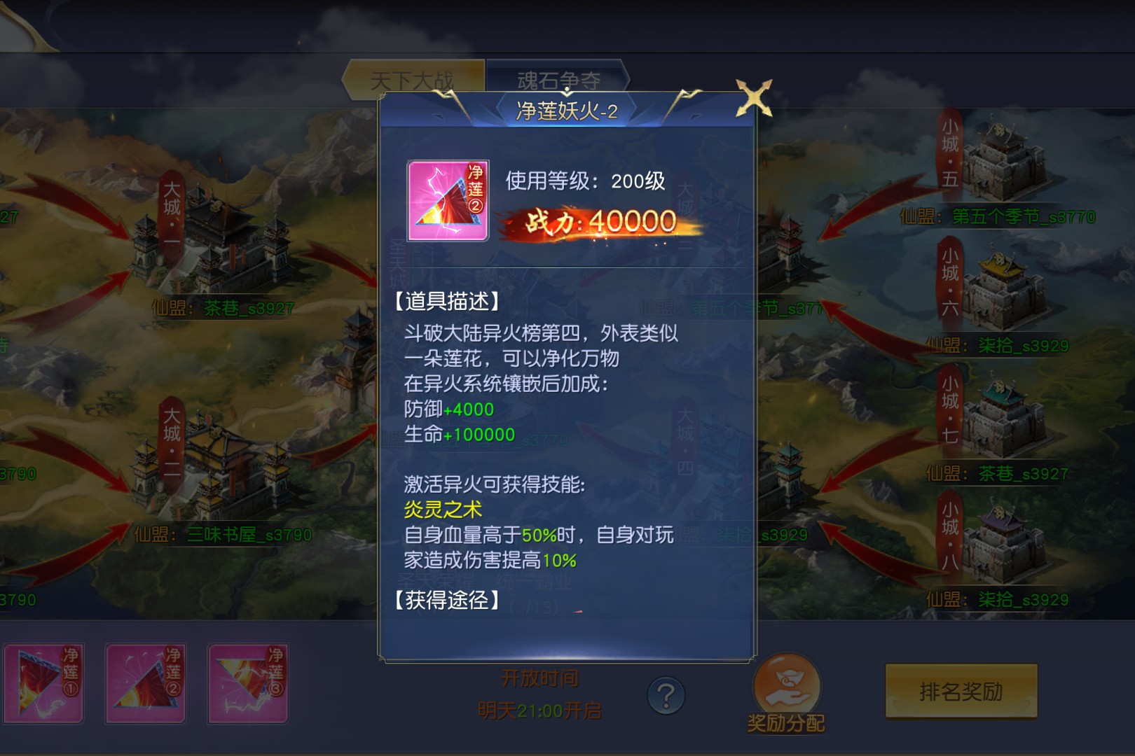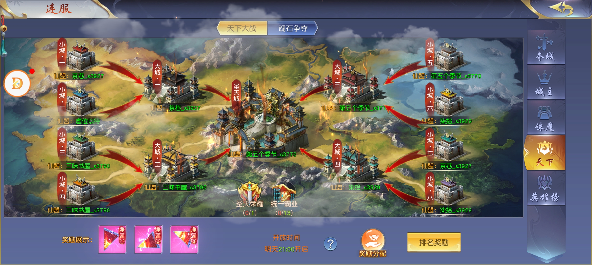 当连服“天下大战”的战鼓擂响,圣天城的烽火便点燃了仙盟的热血。每周一、三、五、日21:00,仙友们将从占领小城起步,击破旗帜、攻克大城,最终向着圣天城的至高荣耀冲锋——每个仙盟最多可占领三座城池,15秒复活的旗帜更让战局瞬息万变。占领城池的每一秒都在积累积分:小城100分、大城150分、圣天城250分,积分越高,仙盟能斩获的“净莲妖火”奖励便越丰厚。这朵斗破大陆异火榜第四的奇火,不仅能为角色带来防御+4000、生命+100000的属性加成,更能解锁“炎灵之术”,让自身血量高于50%时对玩家伤害提升10%。