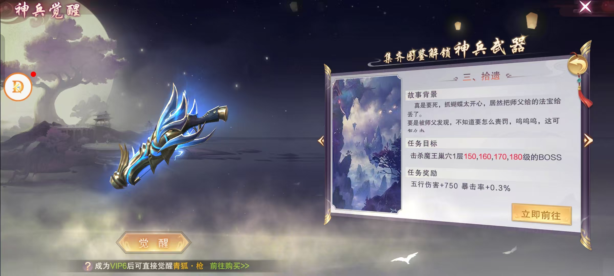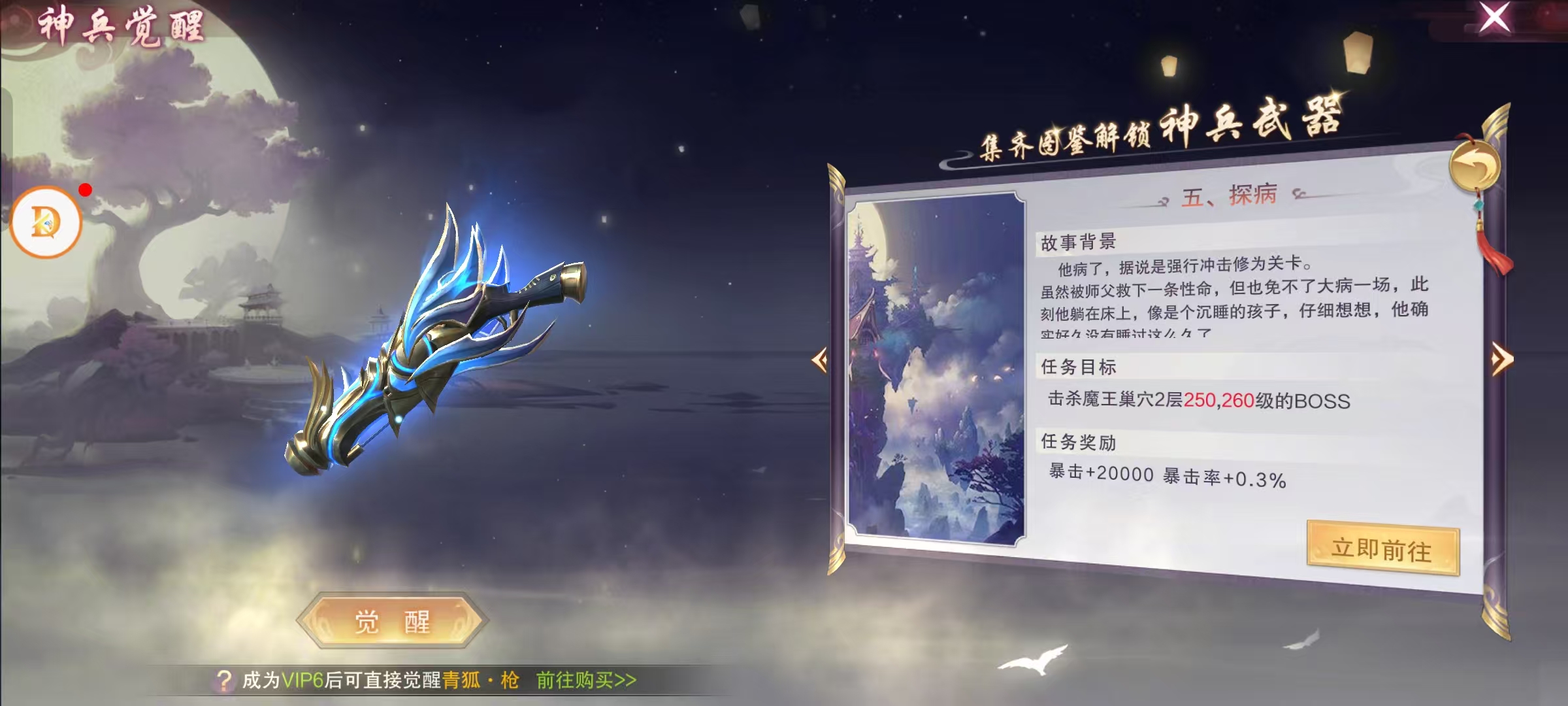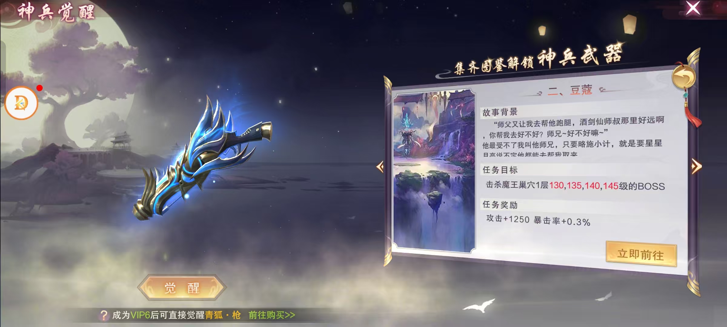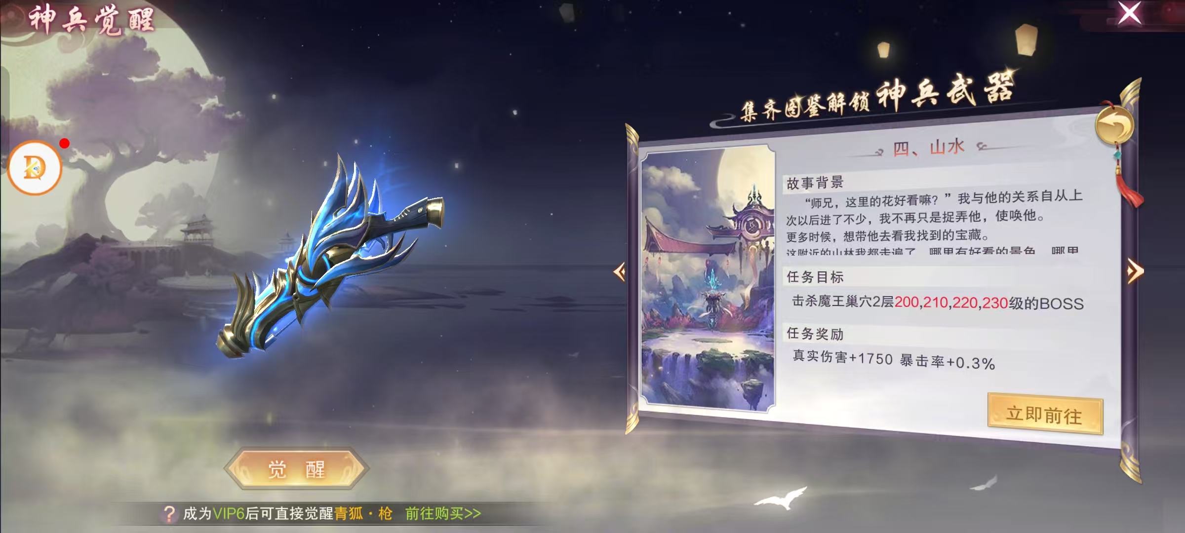 月色溶溶古木参天,神兵觉醒的契机在云雾中悄然降临。那柄青狐·枪流转着幽蓝神光,似藏着无尽故事——从“总角”时的懵懂相伴,到“豆蔻”年华里师兄的宠溺跑腿;从“拾遗”时丢失法宝的慌张,到“山水”间与师兄共赏繁花的温情;从“探病”时的忧心守候,到“守望”时约定共赴终点的坚定……每一段图鉴故事,都是修真路上的羁绊缩影,完成魔王巢穴击杀、登录签到等任务,即可解锁图鉴碎片,逐步唤醒这柄神兵;成为VIP6更能一键觉醒,让青狐枪的力量彻底迸发。真实伤害、暴击率等加成将助你在仙途所向披靡。