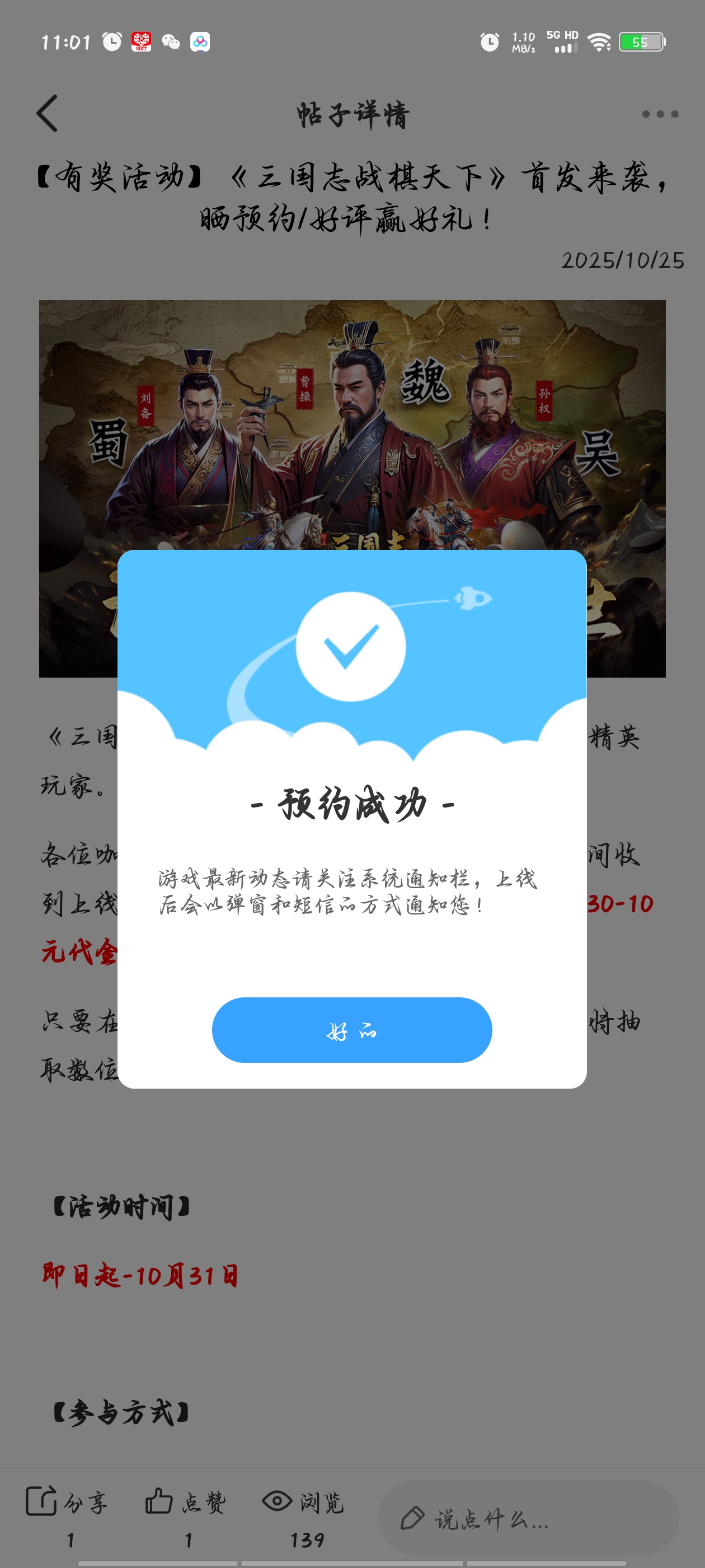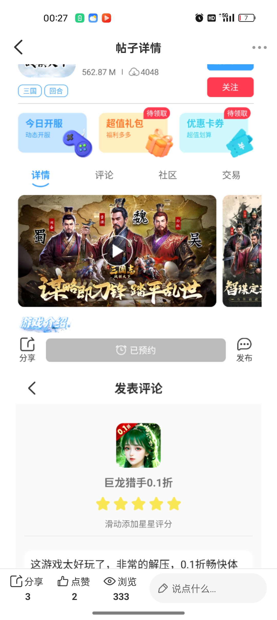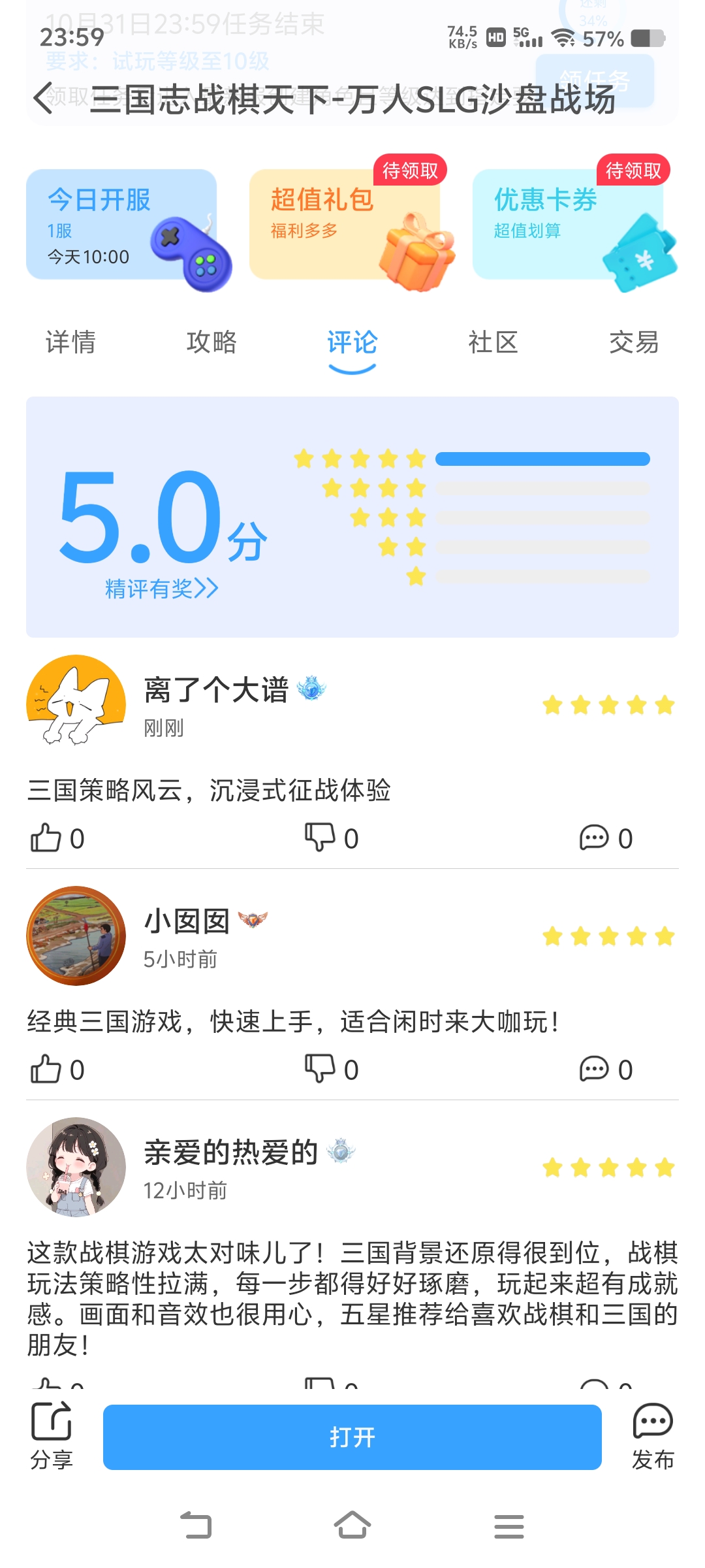 在本帖评论区分享预约游戏加首发后对《三国志战旗天下》的五星好评截图,即是成功参与~
