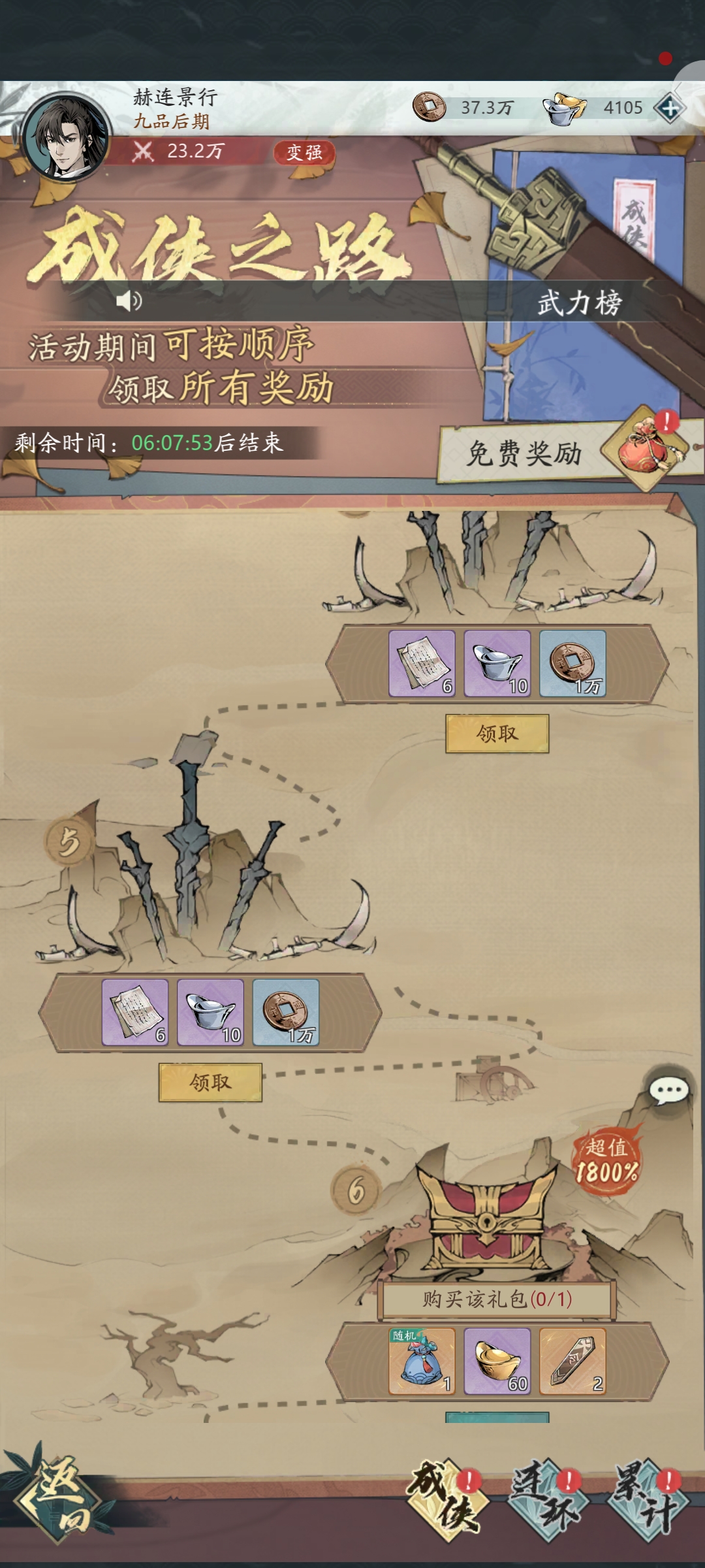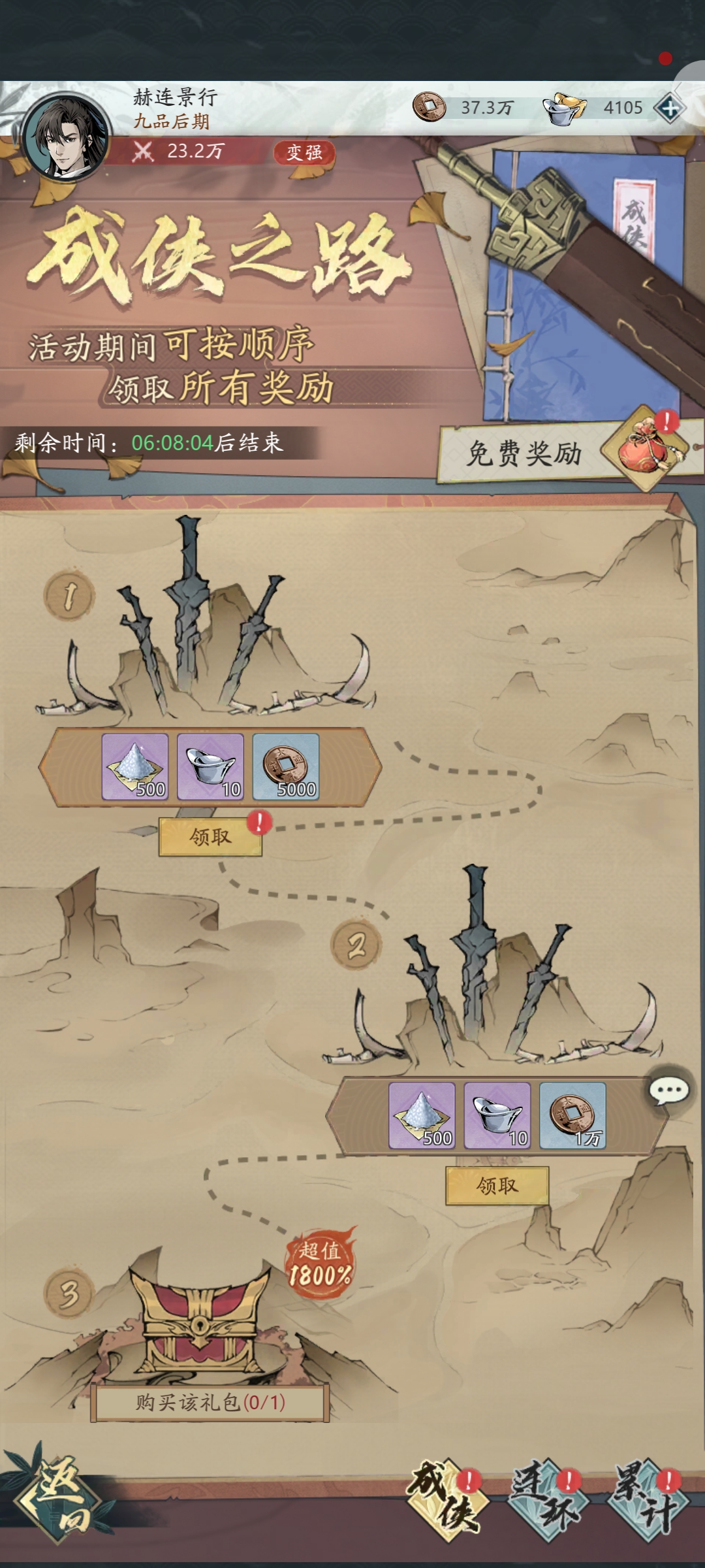 在“成侠之路”活动中,将踏上一段充满奖励的江湖征程。活动期间可按顺序领取所有奖励,从第1阶段到第14阶段,每阶段都有丰富奖励,如银元、铜钱、逃犯线索等,还有超值1800%的礼包可供购买,花费6元或12元即可获得随机6级宝石袋(可开出攻击、防御、气血宝石)、元宝、道具等丰厚奖励。