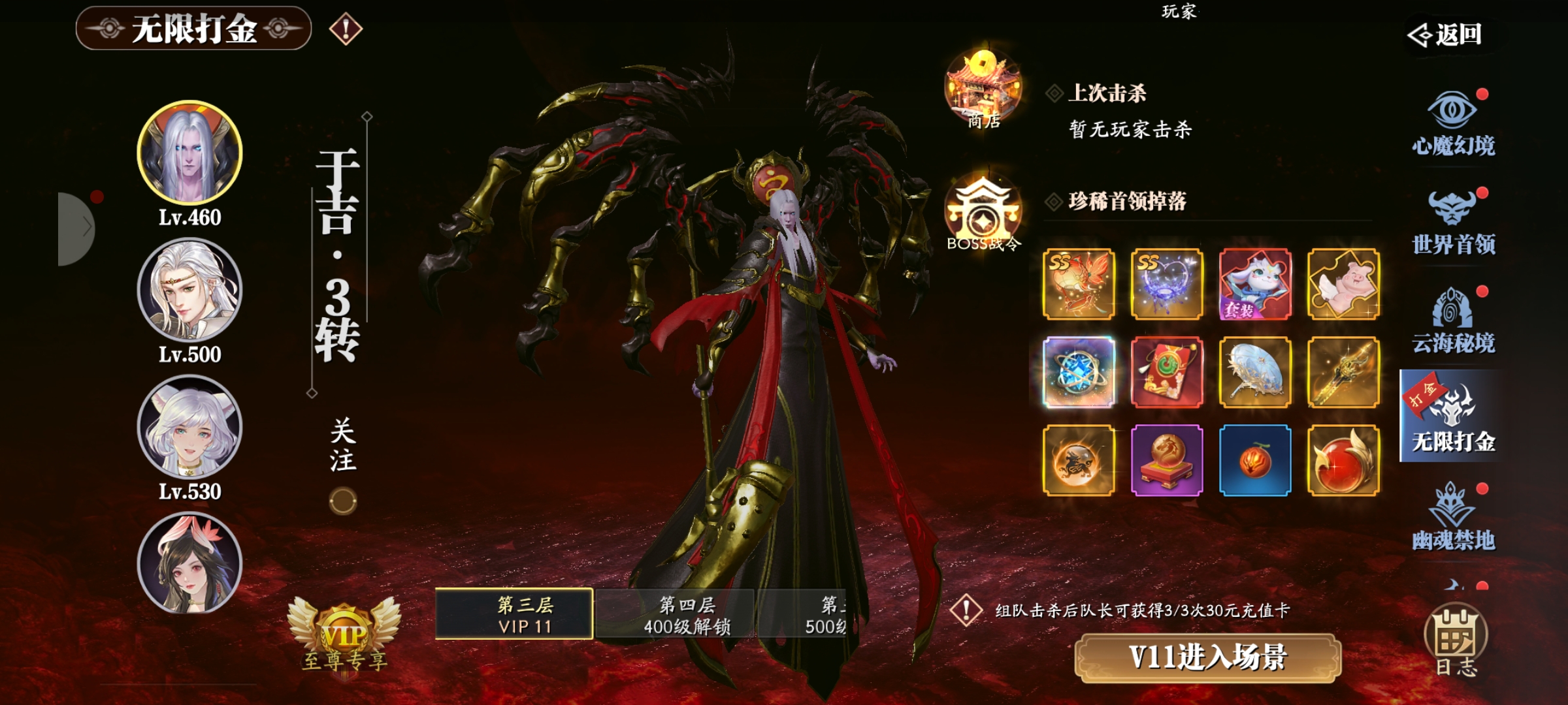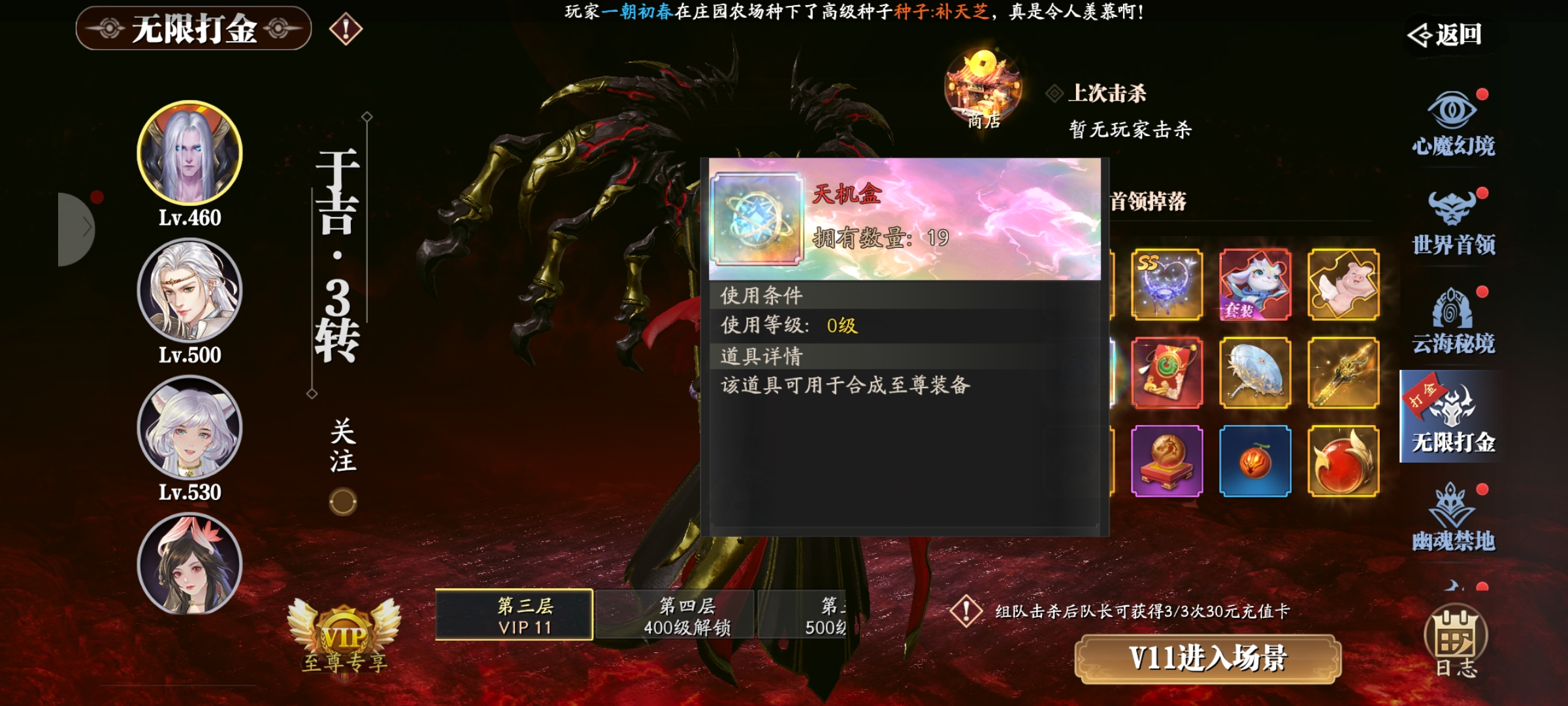 无限打金全天都能玩,每天想打多少次都行~进场景得看VIP等级:V11能直接进,差1级的话花元宝或入场券也能进,差2级以上就进不去啦。层数会跟着等级慢慢开,打BOSS时伤害最高的能拿专属奖励。