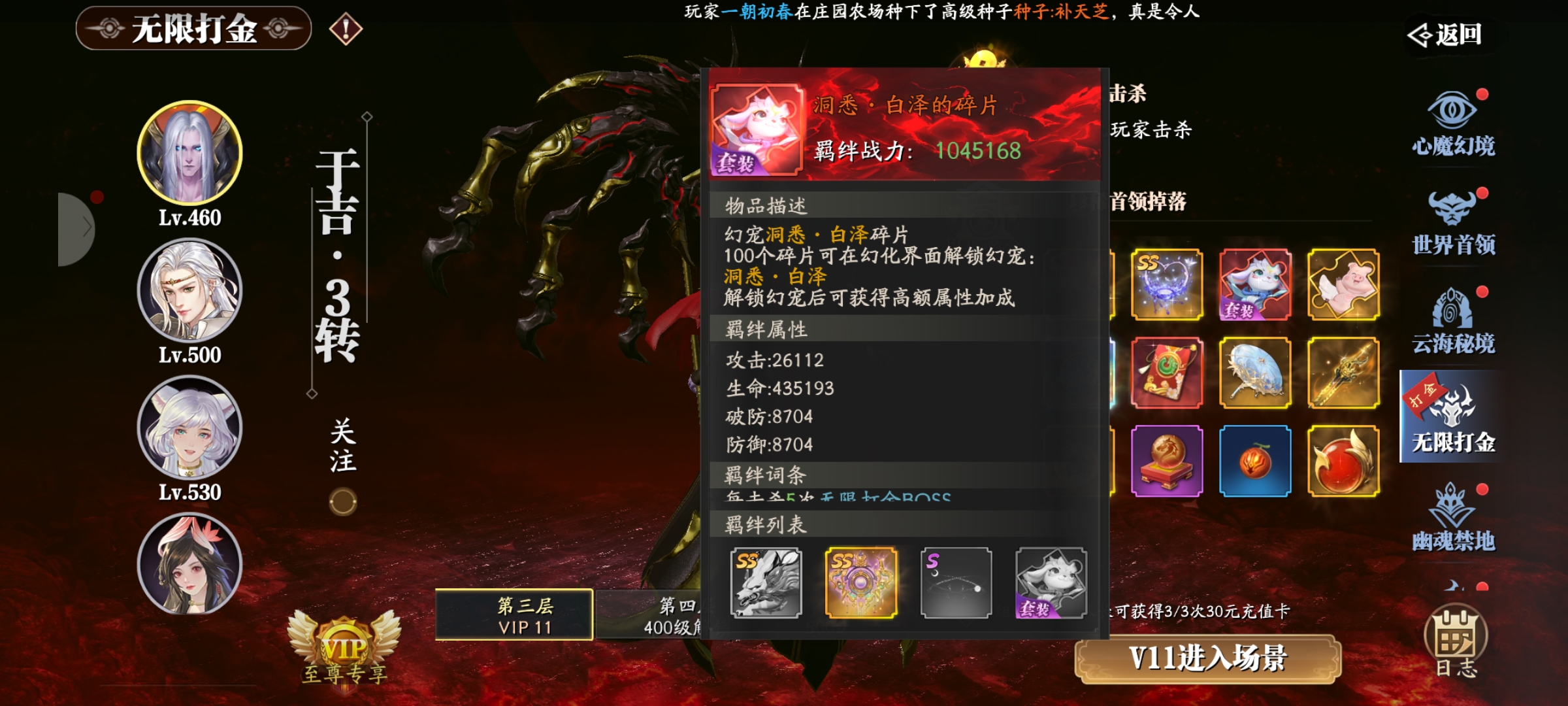 组队当队长更划算,每天能领3次30元充值卡!掉落奖励也很顶,像“洞悉·白泽”幻宠碎片、能合至尊装备的天机盒都能拿到,属性加成直接拉满~现在V11就能进场景,赶紧组队冲一波。